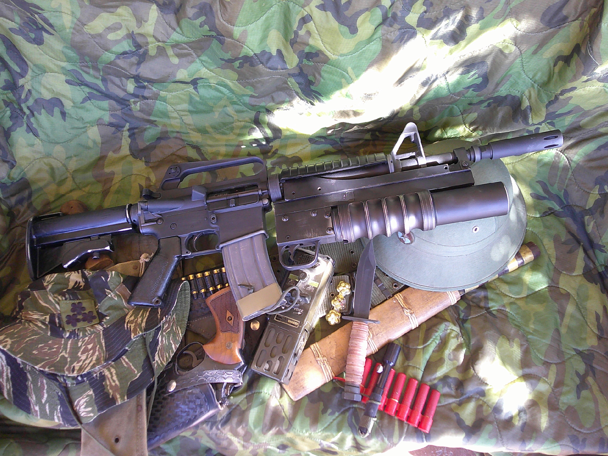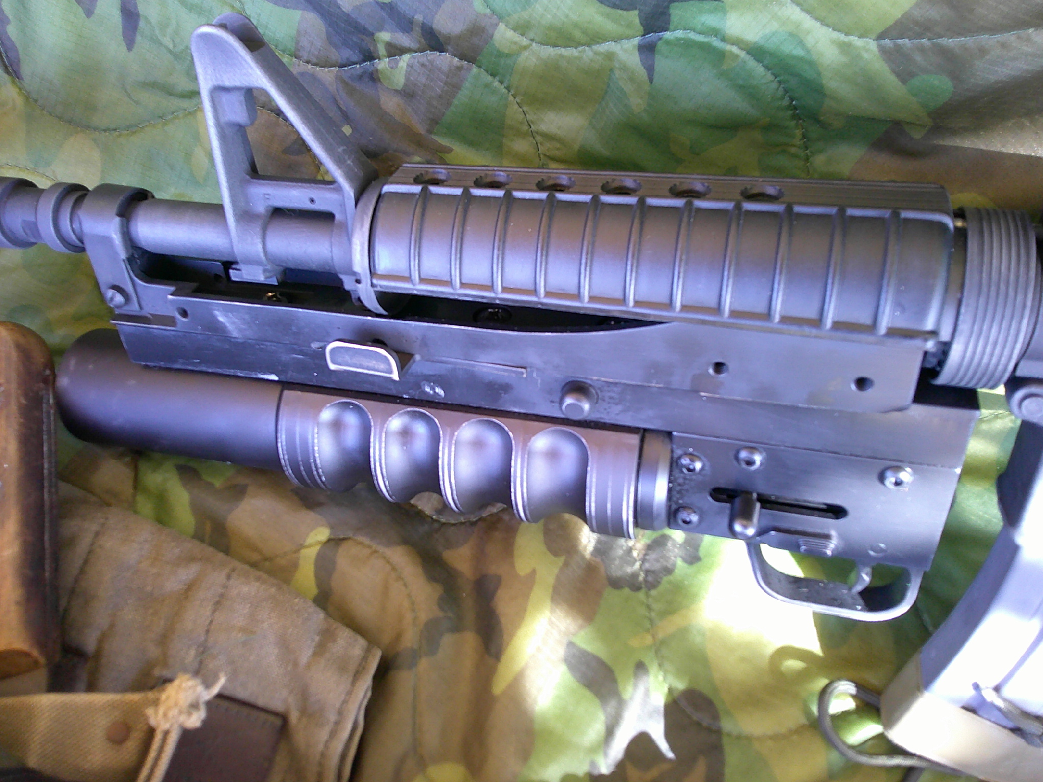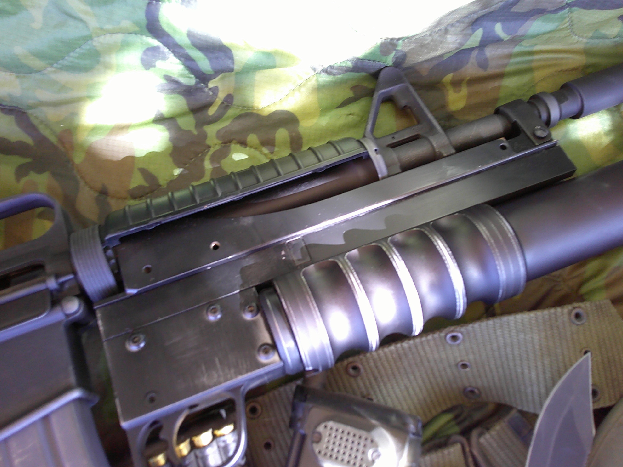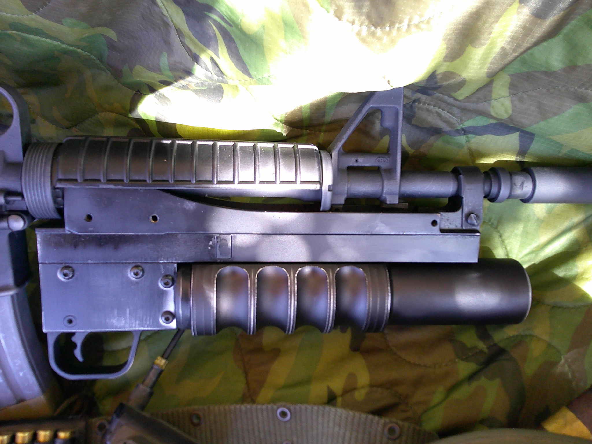 SOLD $1900 Shipped. Going to Auction on GunBroker Sunday 9PM Eastern 2/25. To fund my Fallshirmjager FG 42 project (see Vintage section of the hide), I am selling my Harrington and Richardson roll stamped Colt Commando clone with Spikes 37mm Havoc (M203) launcher. This is a copy of the Colt Commando as used by MACV/SOG and Army Special Forces in Vietnam. The barrel is pinned and welded at 16.25 inches with an XM177 moderator. It is machined from hardened 4150 steel, then MPI inspected to detect hidden flaws . It’s chambered for the modern 5.56 NATO cartridge, with speedy 1-7" rifling in the nitride bore, a 625" gas block/front sight base (F marked) with shaved bayonet lug, sight post, detent, spring, and sling swivel removed, flat Delta ring, barrel nut, weld spring, snap ring, and correct six hole round handguard cap. The collapsible metal stock is the period correct two position and is acetate covered. The trigger has been improved with match springs to break cleanly. The pistol grip is Vietnam era surplus. The 37 mm Spikes Havoc launcher has been modified with the correct under barrel mount. All the extraneous markings and warnings have been removed and the launcher finished in a "Battleworn" proprietary Cerakote. The rifle has been finished in my proprietary "Battleworn" Cerakote finish. This includes an undercoat of my custom "Bare Metal" Cerakote, followed by a top coat of Cerakote "Graphite Black" and then the "Battleworn" finish applied. Included are a modified vintage period carry strap with 550 cord, and an original Colt stamped 30 round magazine. Must ship to FFL, no sales where prohibited, know your state laws.