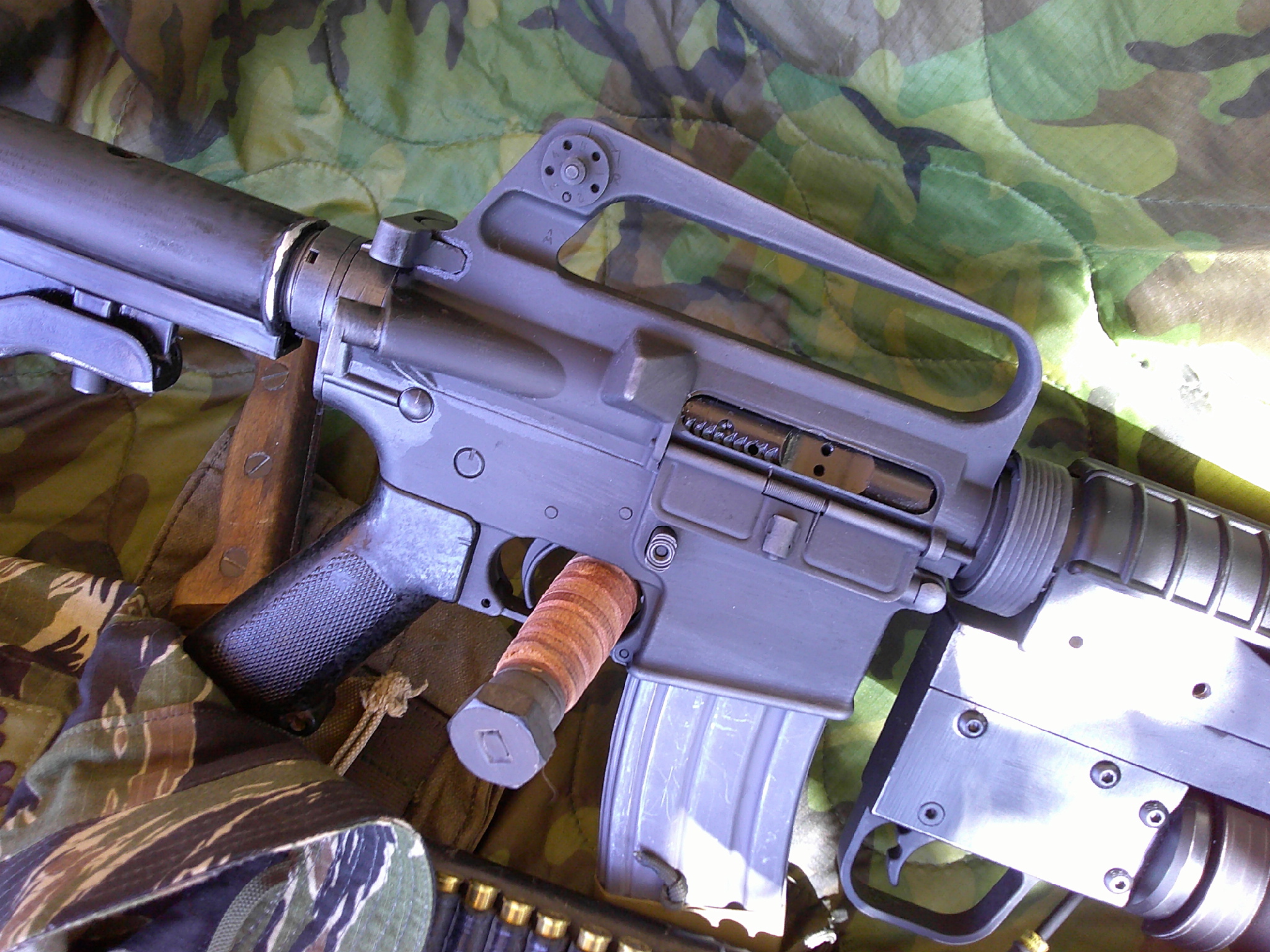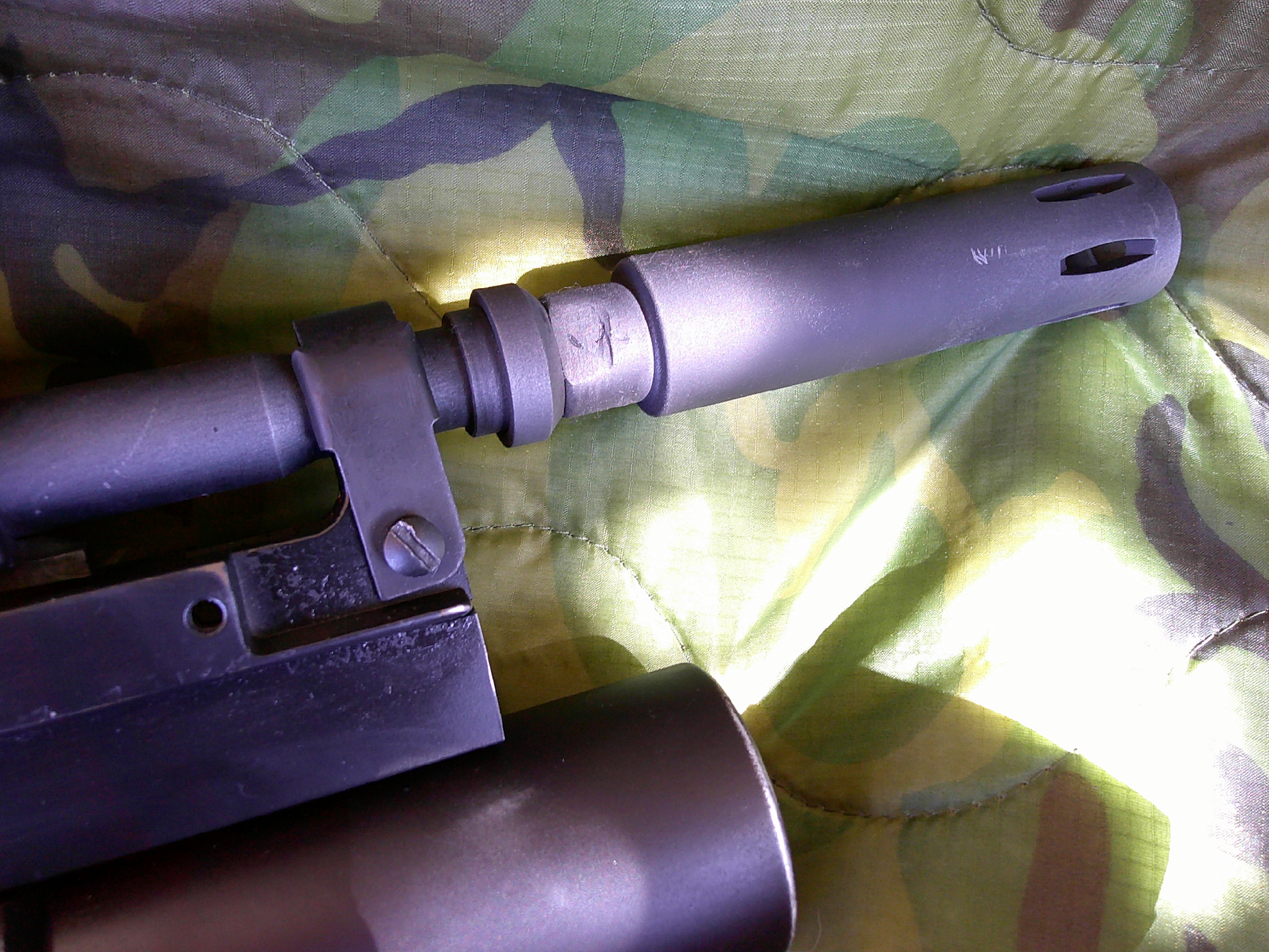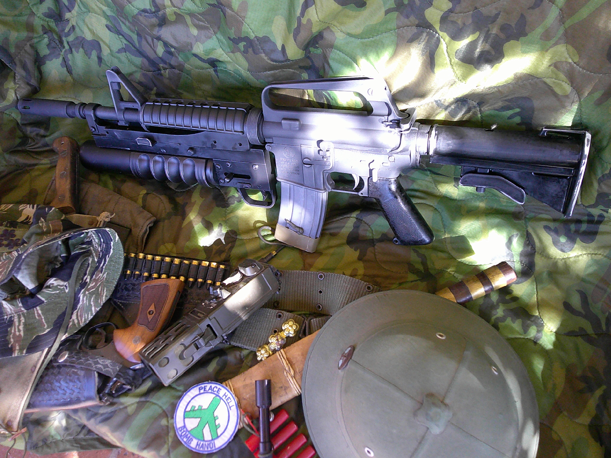 SOLD $1900 Shipped. Going to Auction on GunBroker Sunday 9PM Eastern 2/25. To fund my Fallshirmjager FG 42 project (see Vintage section of the hide), I am selling my Harrington and Richardson roll stamped Colt Commando clone with Spikes 37mm Havoc (M203) launcher. This is a copy of the Colt Commando as used by MACV/SOG and Army Special Forces in Vietnam. The barrel is pinned and welded at 16.25 inches with an XM177 moderator. It is machined from hardened 4150 steel, then MPI inspected to detect hidden flaws . It’s chambered for the modern 5.56 NATO cartridge, with speedy 1-7" rifling in the nitride bore, a 625" gas block/front sight base (F marked) with shaved bayonet lug, sight post, detent, spring, and sling swivel removed, flat Delta ring, barrel nut, weld spring, snap ring, and correct six hole round handguard cap. The collapsible metal stock is the period correct two position and is acetate covered. The trigger has been improved with match springs to break cleanly. The pistol grip is Vietnam era surplus. The 37 mm Spikes Havoc launcher has been modified with the correct under barrel mount. All the extraneous markings and warnings have been removed and the launcher finished in a "Battleworn" proprietary Cerakote. The rifle has been finished in my proprietary "Battleworn" Cerakote finish. This includes an undercoat of my custom "Bare Metal" Cerakote, followed by a top coat of Cerakote "Graphite Black" and then the "Battleworn" finish applied. Included are a modified vintage period carry strap with 550 cord, and an original Colt stamped 30 round magazine. Must ship to FFL, no sales where prohibited, know your state laws.