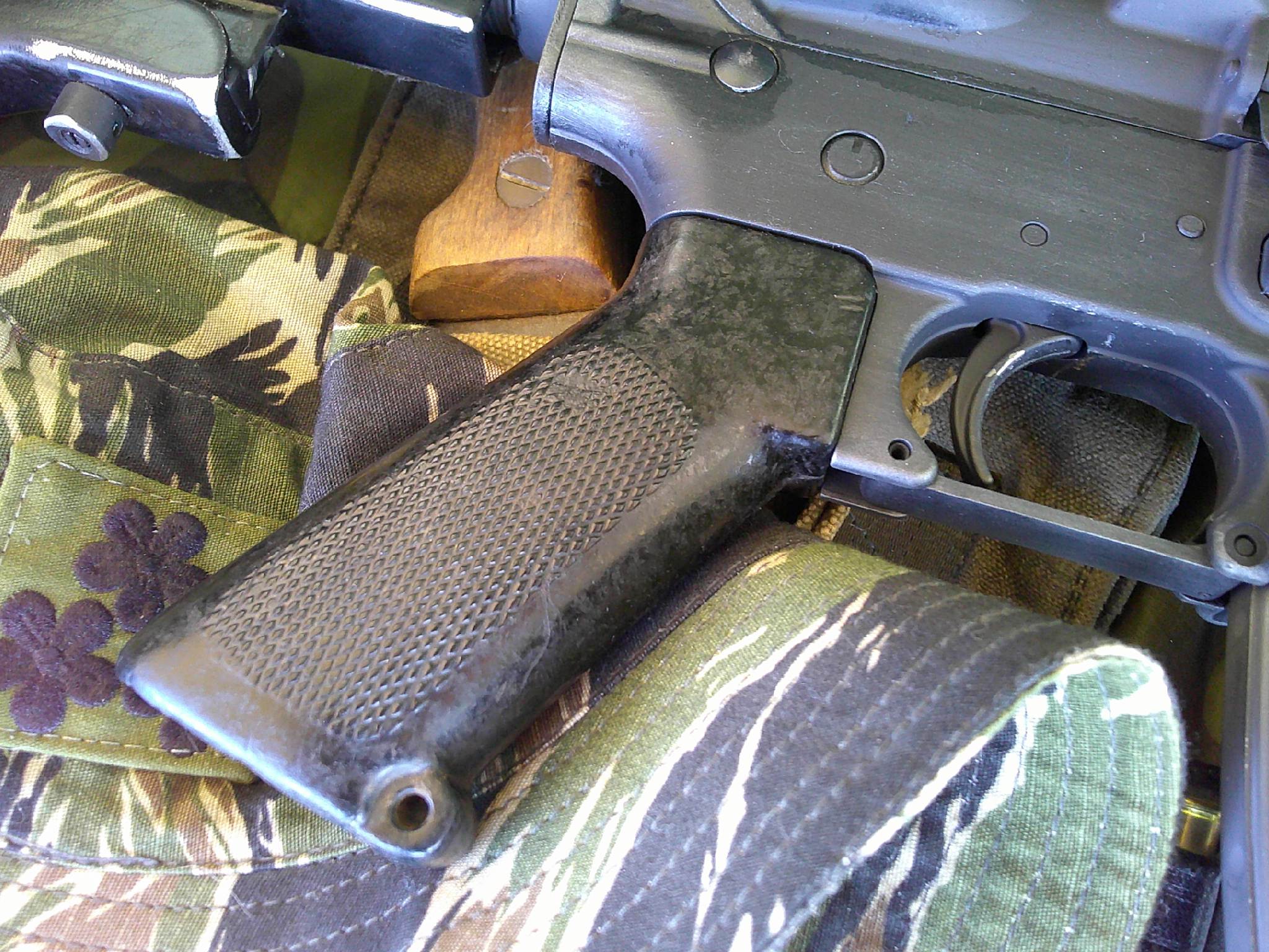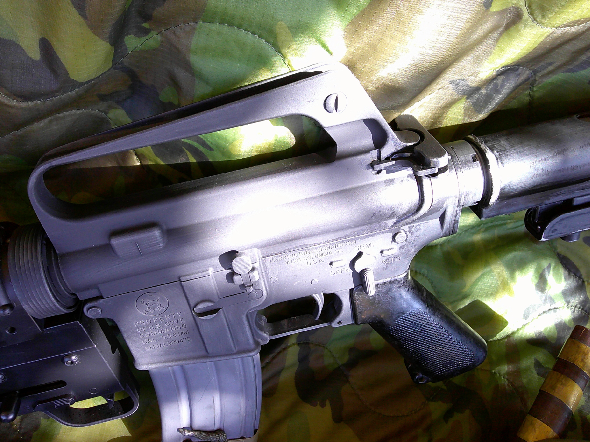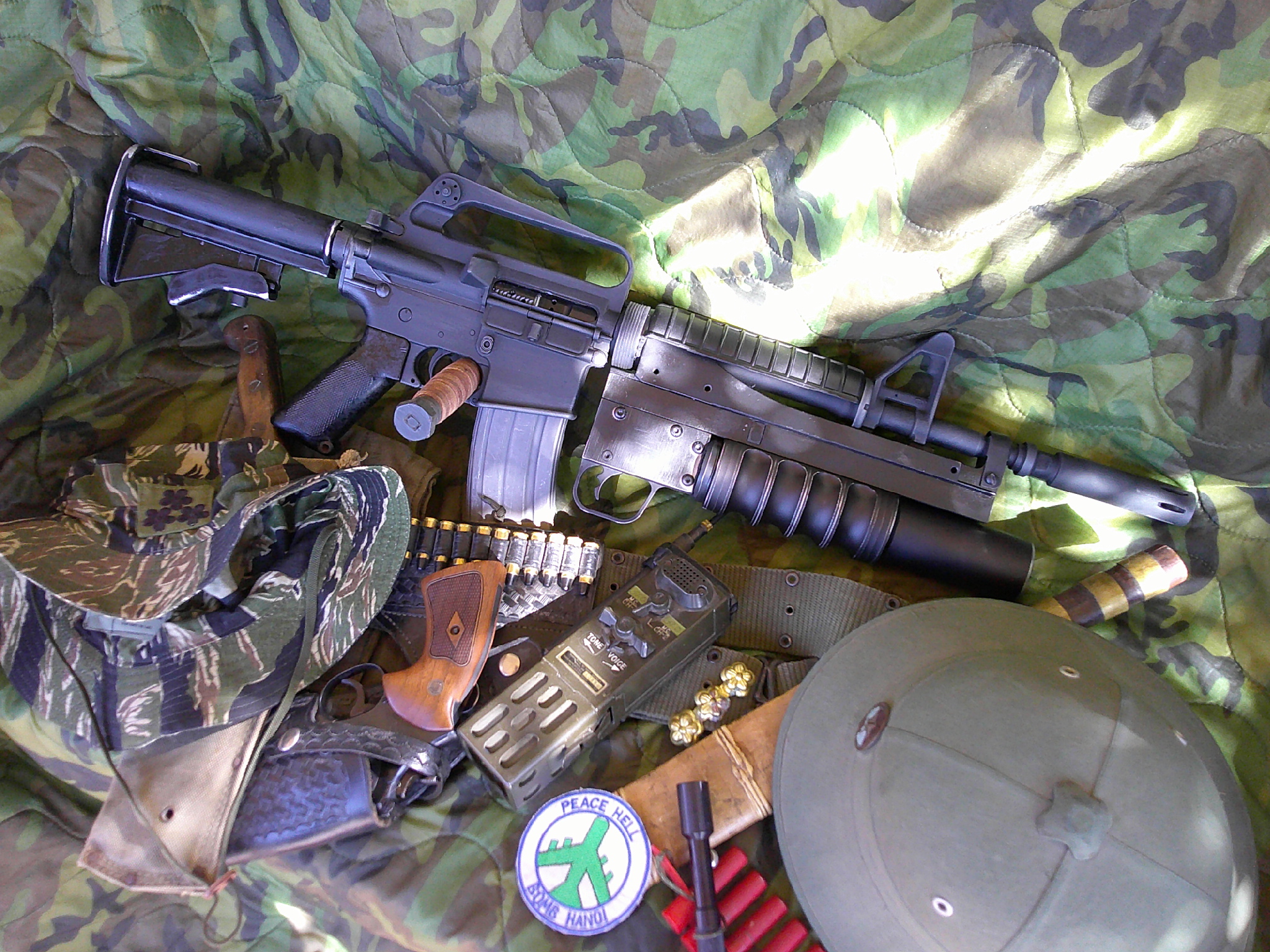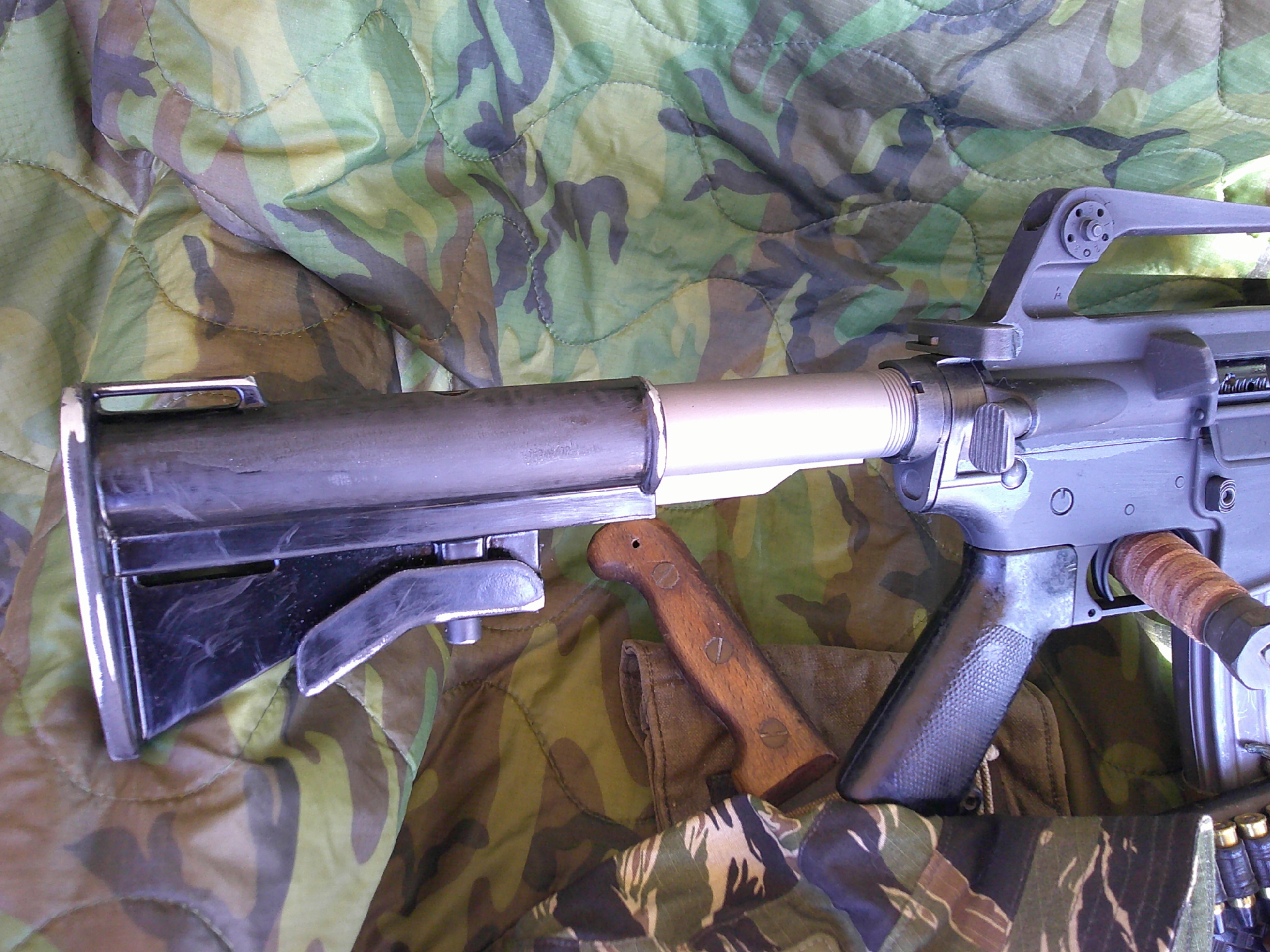 SOLD $1900 Shipped. Going to Auction on GunBroker Sunday 9PM Eastern 2/25. To fund my Fallshirmjager FG 42 project (see Vintage section of the hide), I am selling my Harrington and Richardson roll stamped Colt Commando clone with Spikes 37mm Havoc (M203) launcher. This is a copy of the Colt Commando as used by MACV/SOG and Army Special Forces in Vietnam. The barrel is pinned and welded at 16.25 inches with an XM177 moderator. It is machined from hardened 4150 steel, then MPI inspected to detect hidden flaws . It’s chambered for the modern 5.56 NATO cartridge, with speedy 1-7" rifling in the nitride bore, a 625" gas block/front sight base (F marked) with shaved bayonet lug, sight post, detent, spring, and sling swivel removed, flat Delta ring, barrel nut, weld spring, snap ring, and correct six hole round handguard cap. The collapsible metal stock is the period correct two position and is acetate covered. The trigger has been improved with match springs to break cleanly. The pistol grip is Vietnam era surplus. The 37 mm Spikes Havoc launcher has been modified with the correct under barrel mount. All the extraneous markings and warnings have been removed and the launcher finished in a "Battleworn" proprietary Cerakote. The rifle has been finished in my proprietary "Battleworn" Cerakote finish. This includes an undercoat of my custom "Bare Metal" Cerakote, followed by a top coat of Cerakote "Graphite Black" and then the "Battleworn" finish applied. Included are a modified vintage period carry strap with 550 cord, and an original Colt stamped 30 round magazine. Must ship to FFL, no sales where prohibited, know your state laws.
