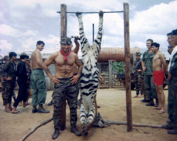 Father in law, SGM, SF, 3 tours in Vietnam, with Montagnards. He's the one taking the photo of the Tm Ldr and tiger. Note the tiger tail. They had to post a 24 hour guard on the Tiger to keep the yards from stealing highly prized body parts.