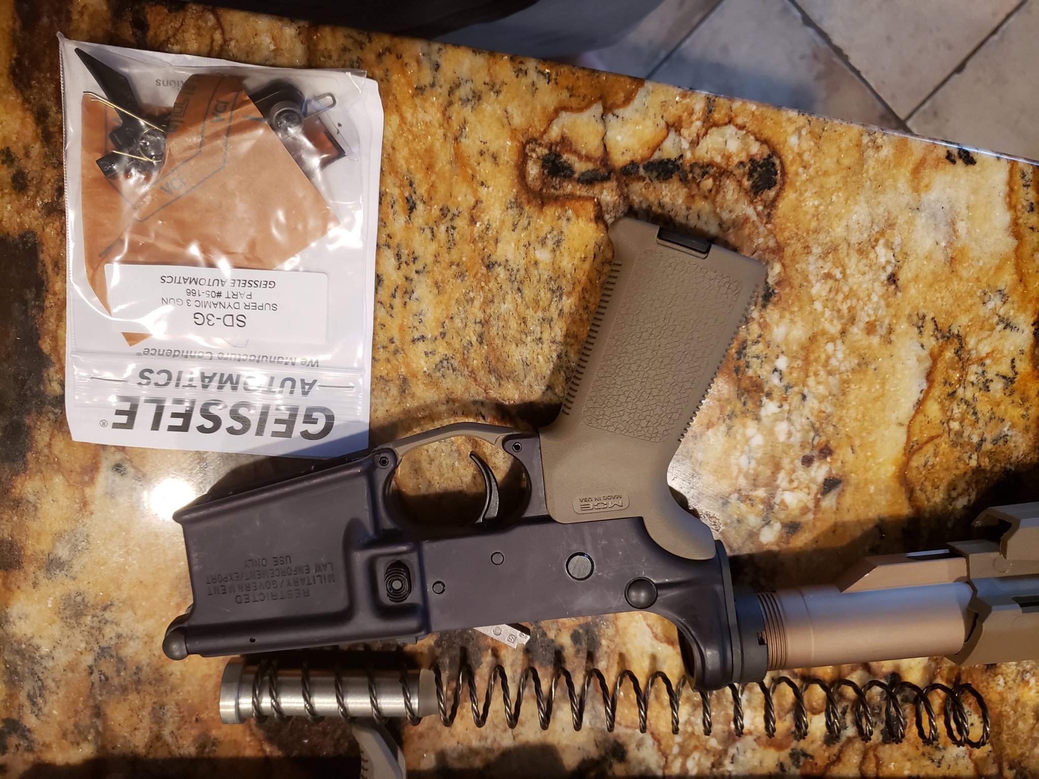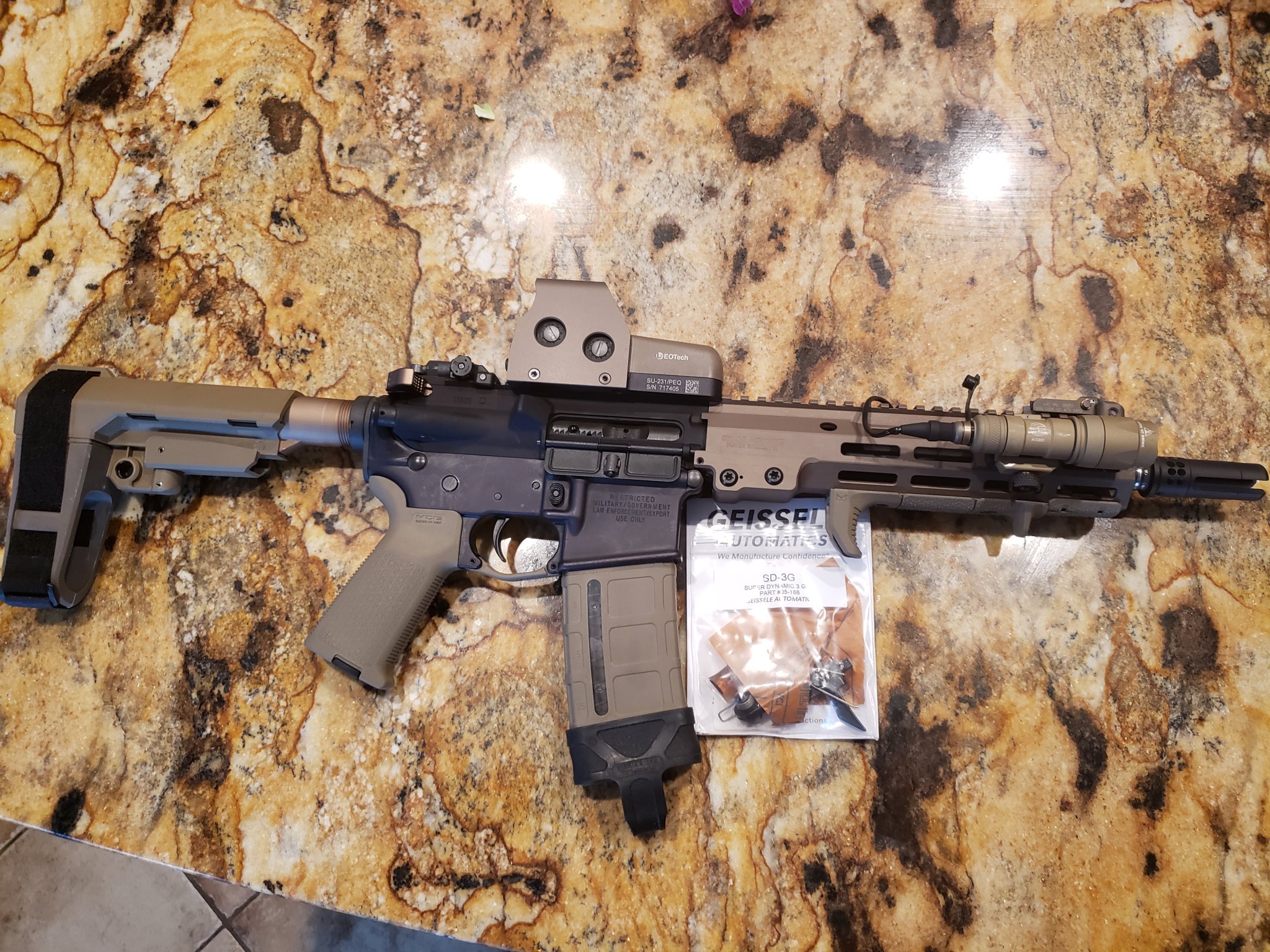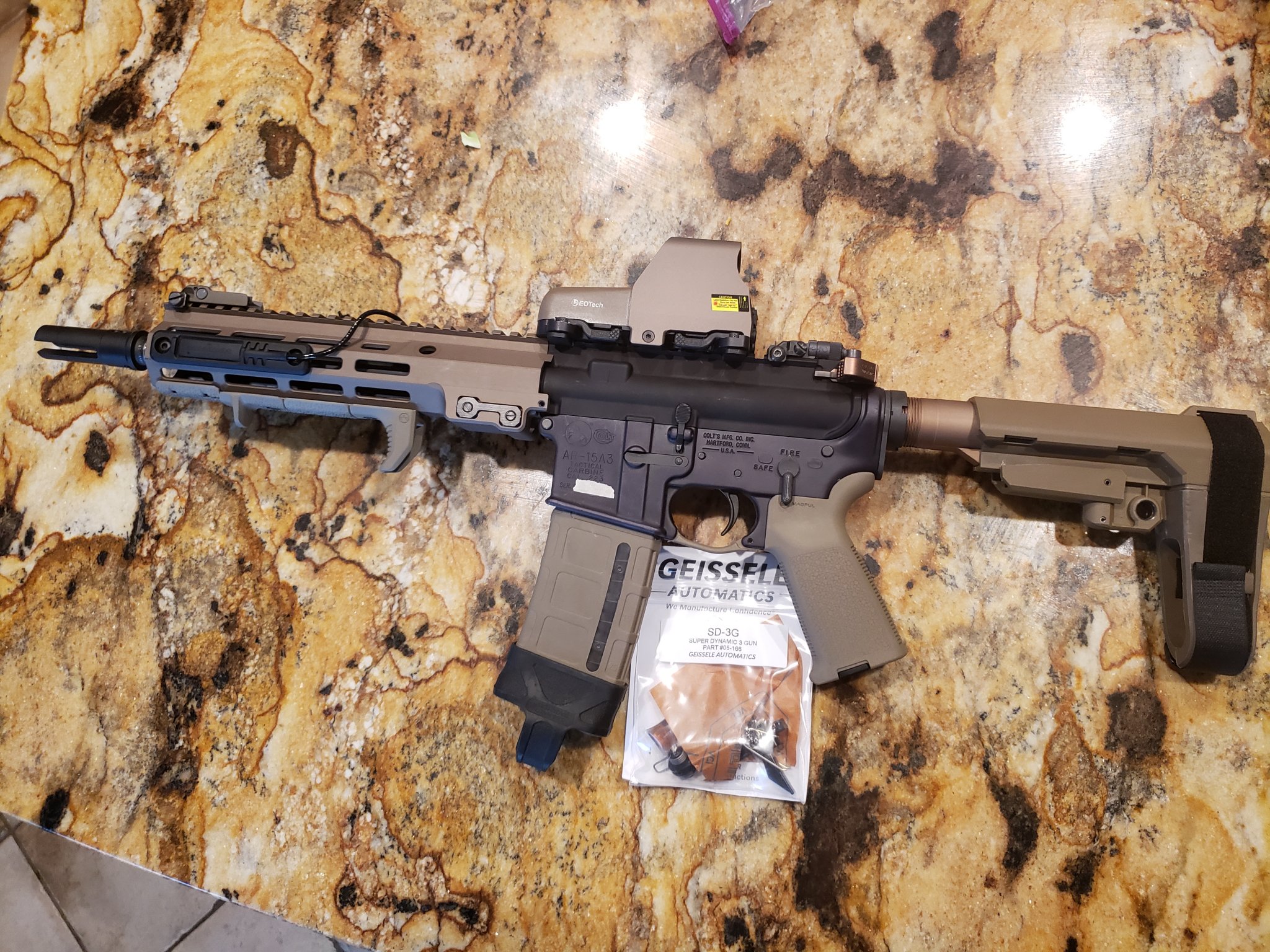 Lower is a used Colt AR15A3 and was a hard to source Colt LE buy back stamped restricted lower, purchased as a lower and Colt parts kit, added a tan anodized buffer tube with FDE SB3A brace, magpul MOe fde grip, Geissele H3 buffer and braided spring, fde nagoul trigger guard has been swapped to a geissele tan anodized trigger guard, has a Colt milspec trigger with a Colt competion speed hammer, Geissele SD3G was purchsed and can be added for $192
