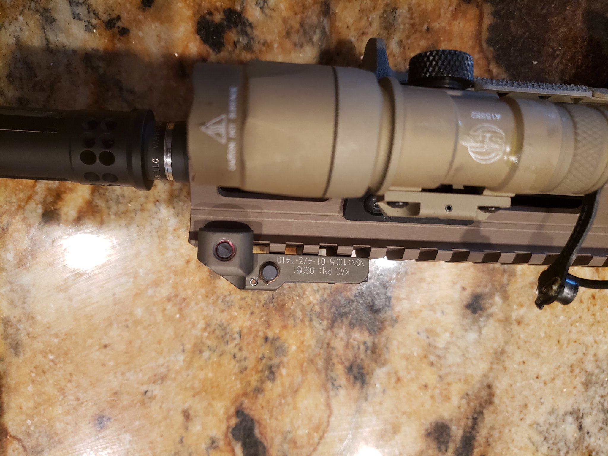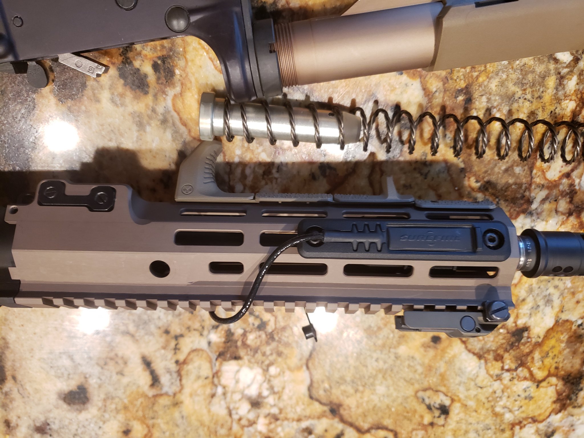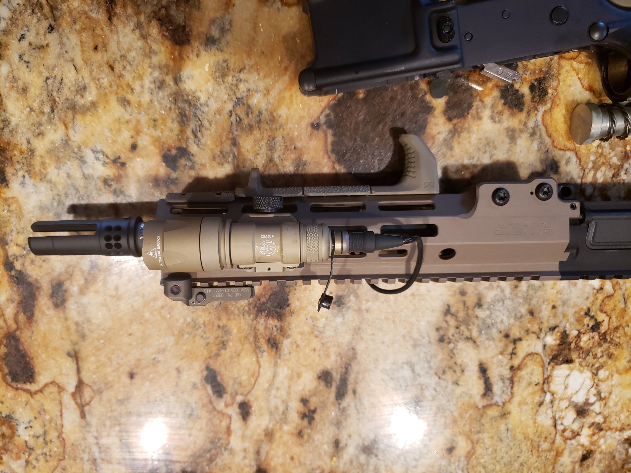 I hate to sell this thing after getting all the parts together but sonething has come up, the upper is unfired barrel assembly is factory assembeled by Geissele, New Colt cage code upper and Colt BCG, Airborn NSN stamped charging handle and Surefire warcomp installed, KAC Taupe front sight and KAC rear sight installed, Tan Surefire 300 complte with tan pressure switch ans magpul pressure mount and aluminum offset mlok mout, MAGPUL FDE handstop