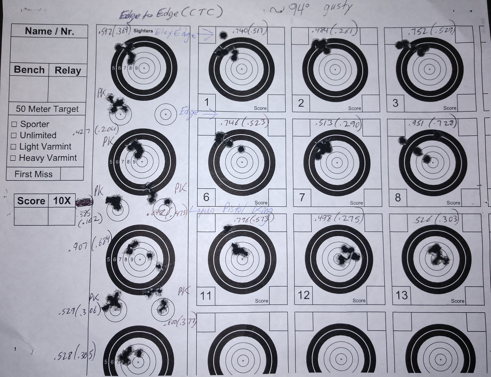 I was able to get out today in miserable 95 degree, slightly windy weather. Like an idiot I forgot my Center X but did test CCI, SK Pistol Match, Eley Edge and Lapua Pistol King. I was not pleased with the Eley, but that's nothing new. I was most surprised with the SK.