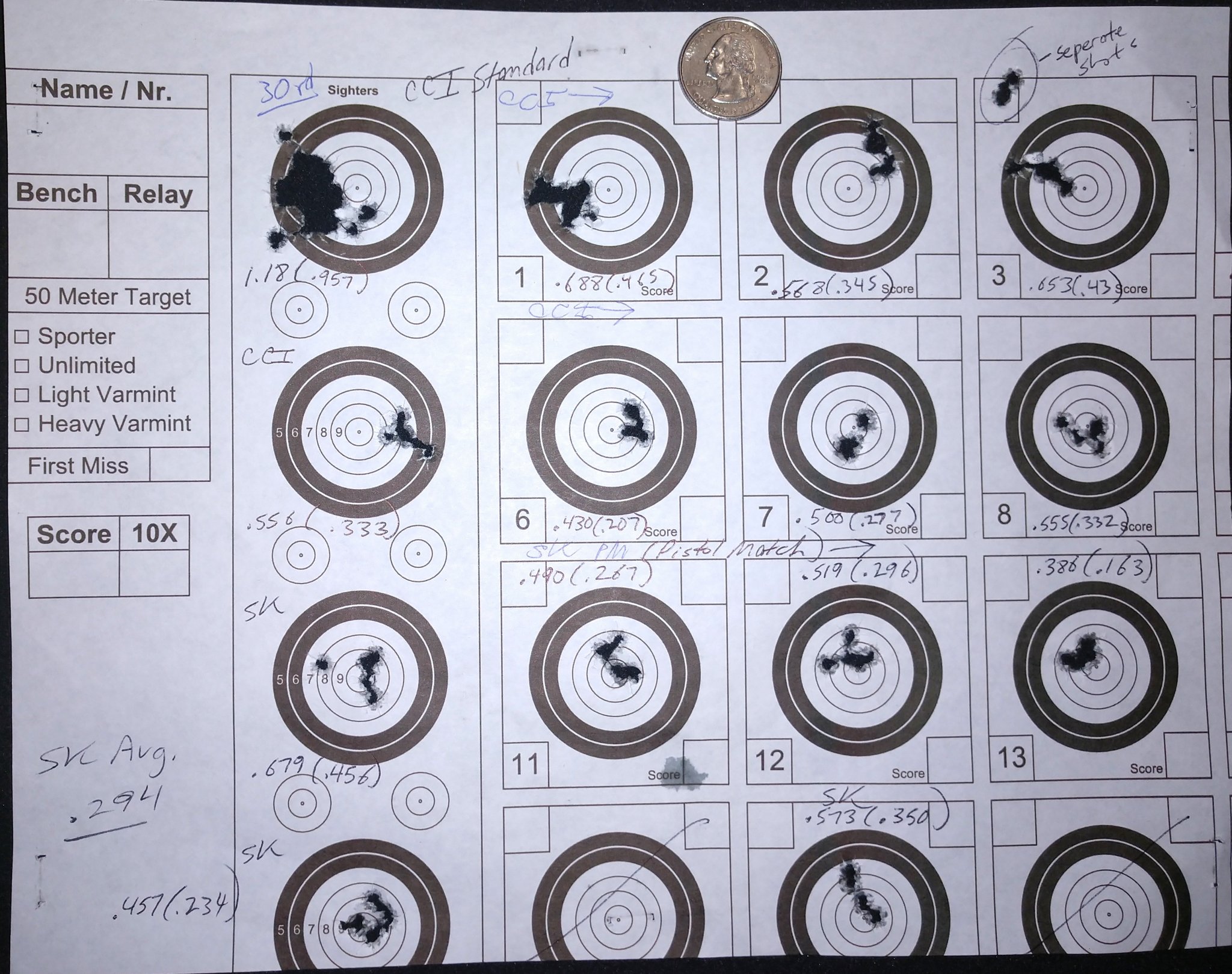 Edit to add: all shooting was done at 50yds off of a machine rest, free recoil with almost zero pressure on the rifle. Easy enough to do with BScar's trigger set at 6 ounces. Previously, the rifle always shot better with a tight hold but I wanted to remove as many variables as possible. Next time I'll test Center X, SK, more CCI and some Norma Match.