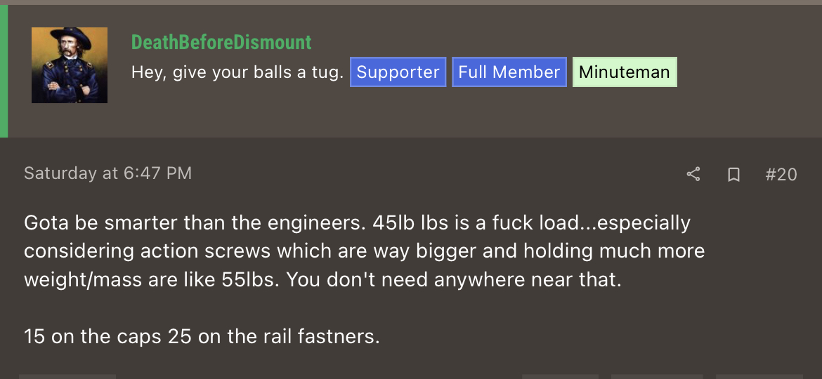 Can we add in the “you have to be smarter than a engineer , use half the recommend scope ring torque “. Argument from deathbeforedismount