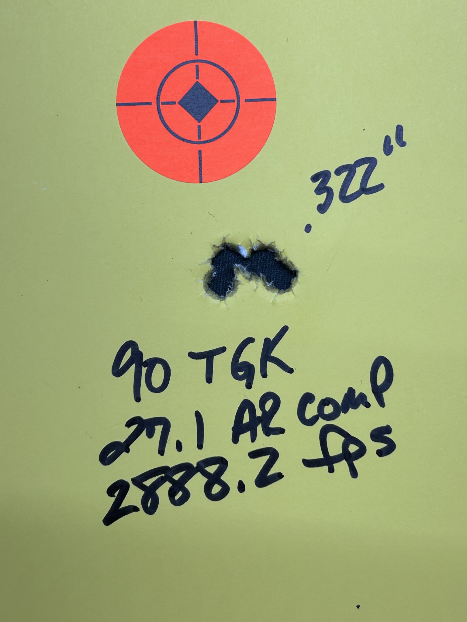 The group in the picture was from a recent load development session using Sierra 90 TGK and AR Comp powder. All 5 groups were unde 0.8" and this was the best at 0.32".