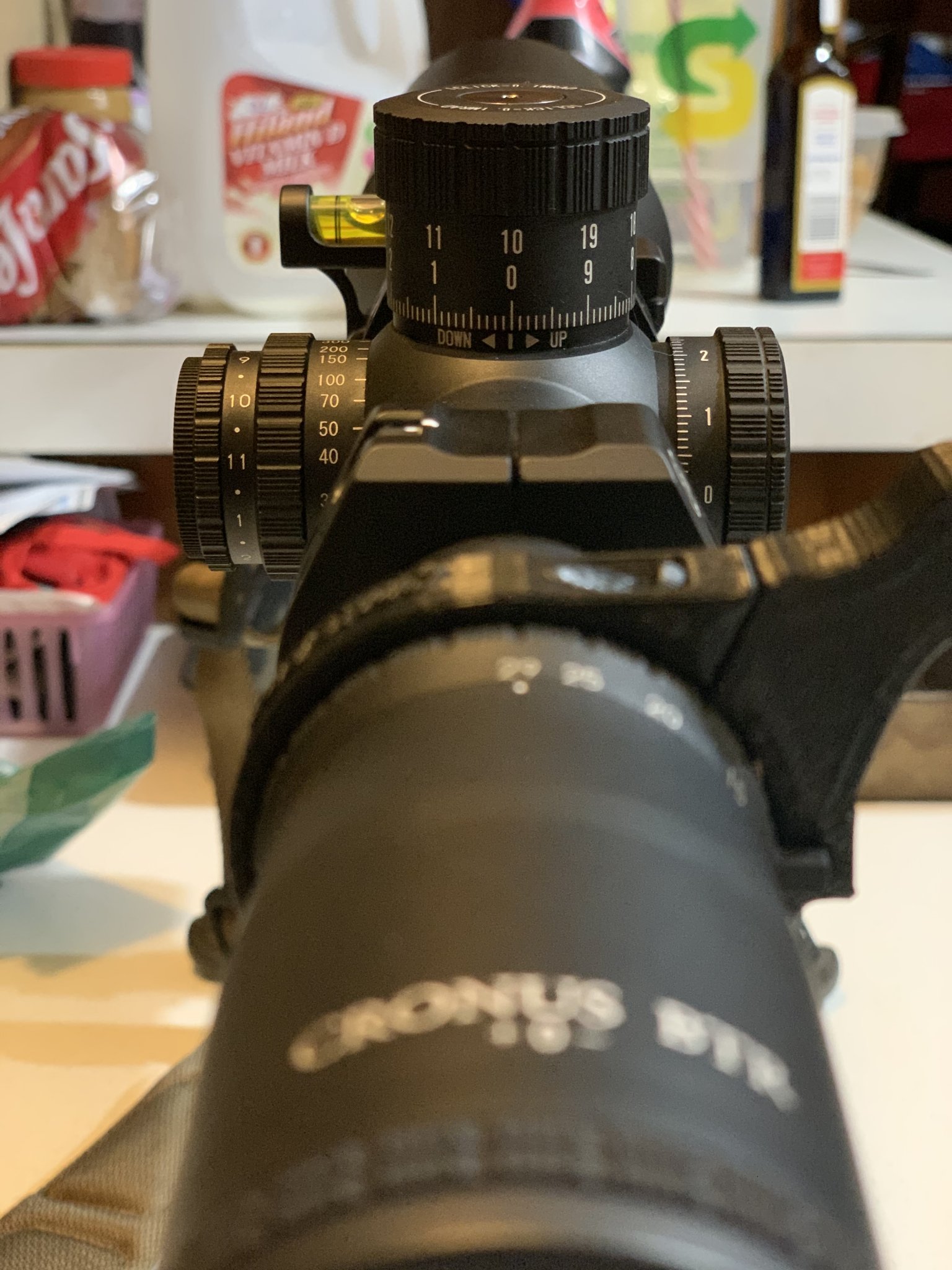 Cronus BTR 4.5-29x56 APRS Mil Reticle (floating crosshair. Will come with Flatline Ops Bubble Level. Throw Lever, American Rifle Company Low Rings, & Nightforce Atacr 56mm sunshade. Great shape. Asking 1400 for the whole package. Only selling because i am wanting to get into a Leupold Mk5 3.6-18 for a lightweight hunting rifle.