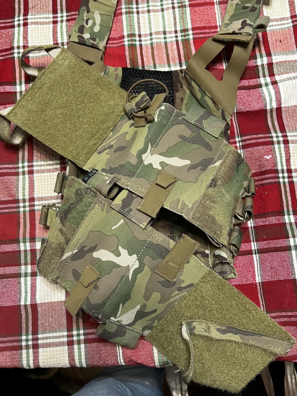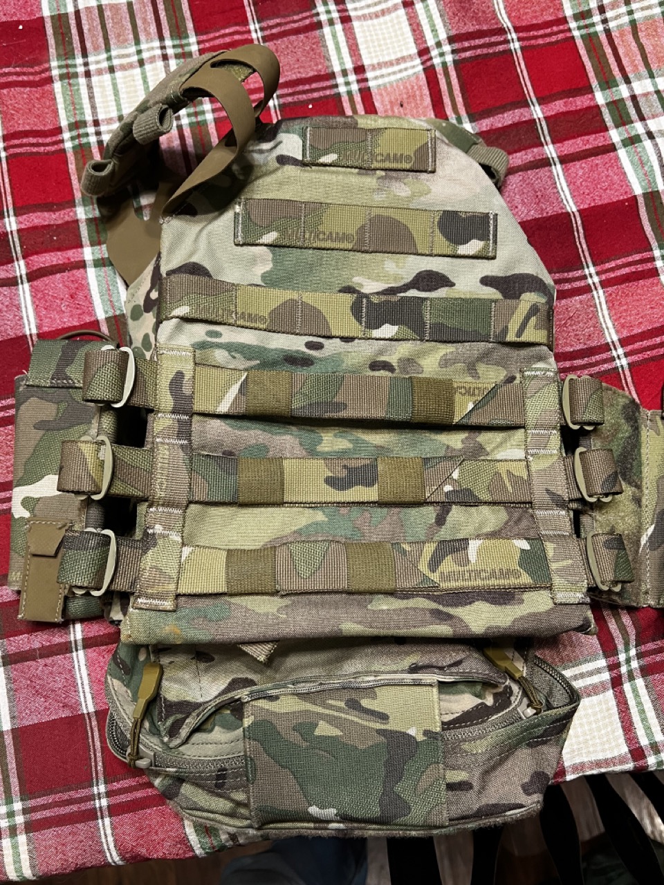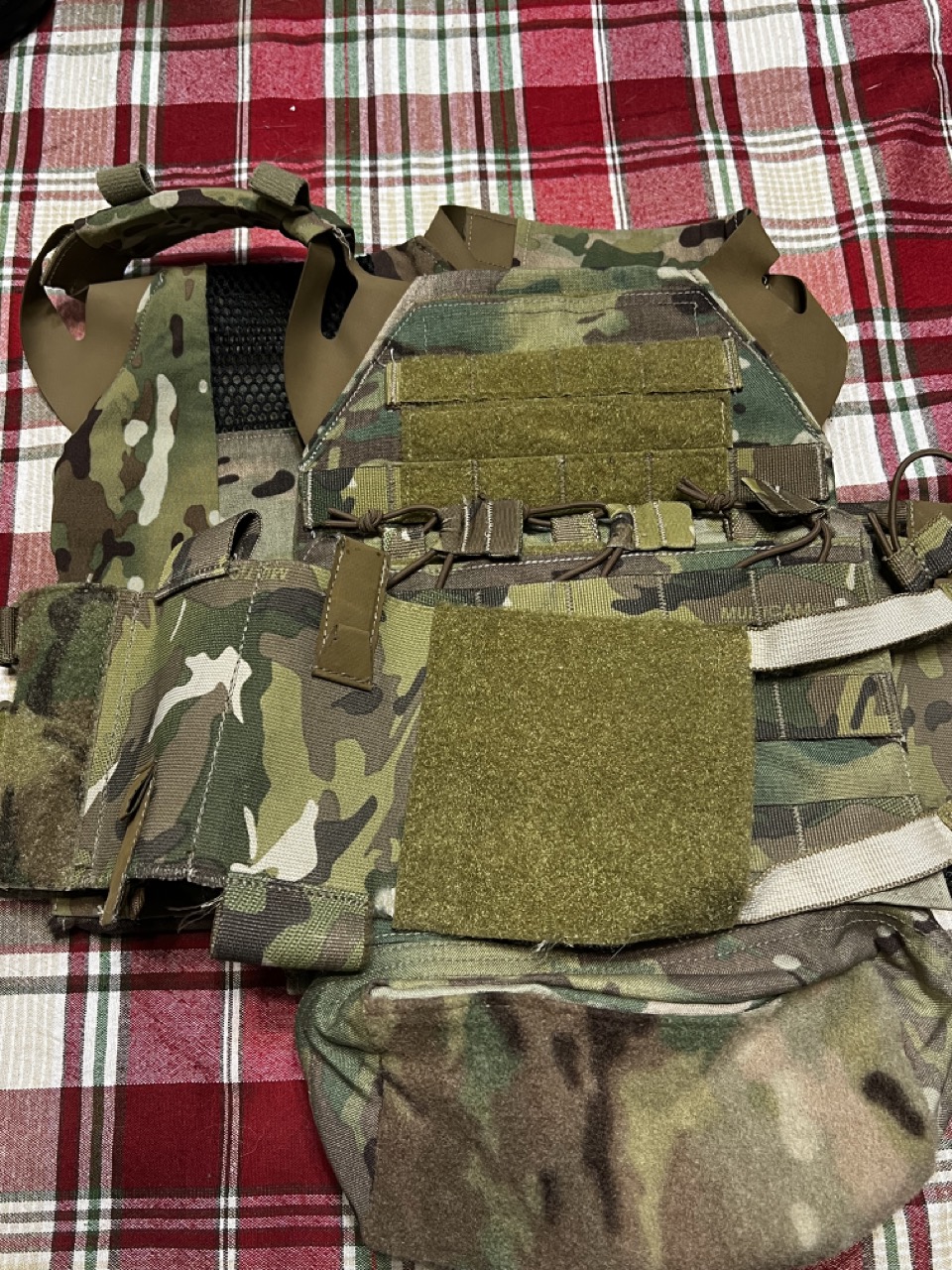 Description: The Crye JPC (Multicam) is the first iteration and not the 2.0. IMO, I prefer this one over the 2.0 but they're very similar. This will come with the elastic cummerbund, the Crye dangler, as well as two very cheap Green 2 Tactical AR500 Steel plates. All threading is in excellent condition. Slim shoulder straps are already installed, and everything is ready to go. No backer for the steel plates, however.
