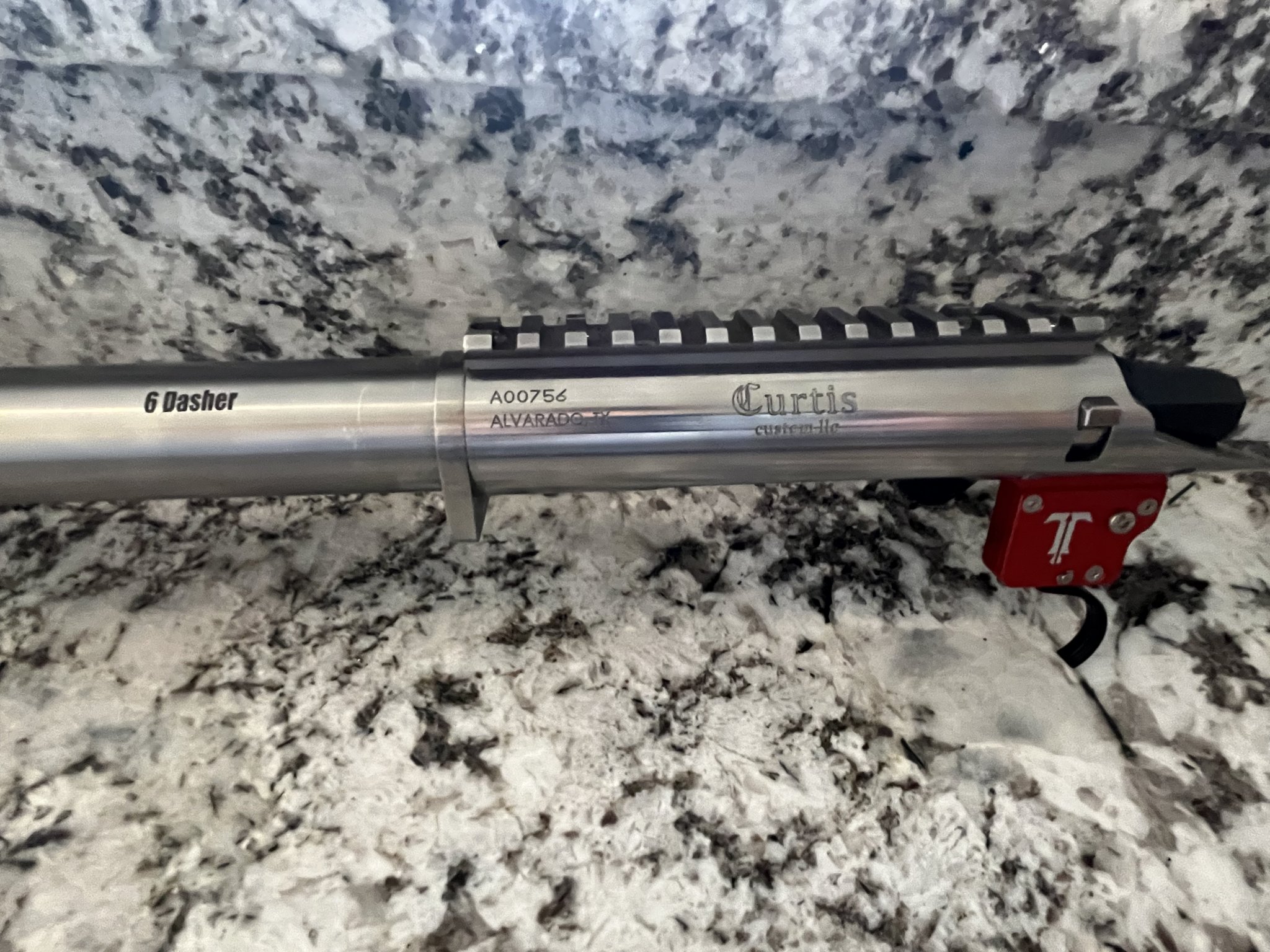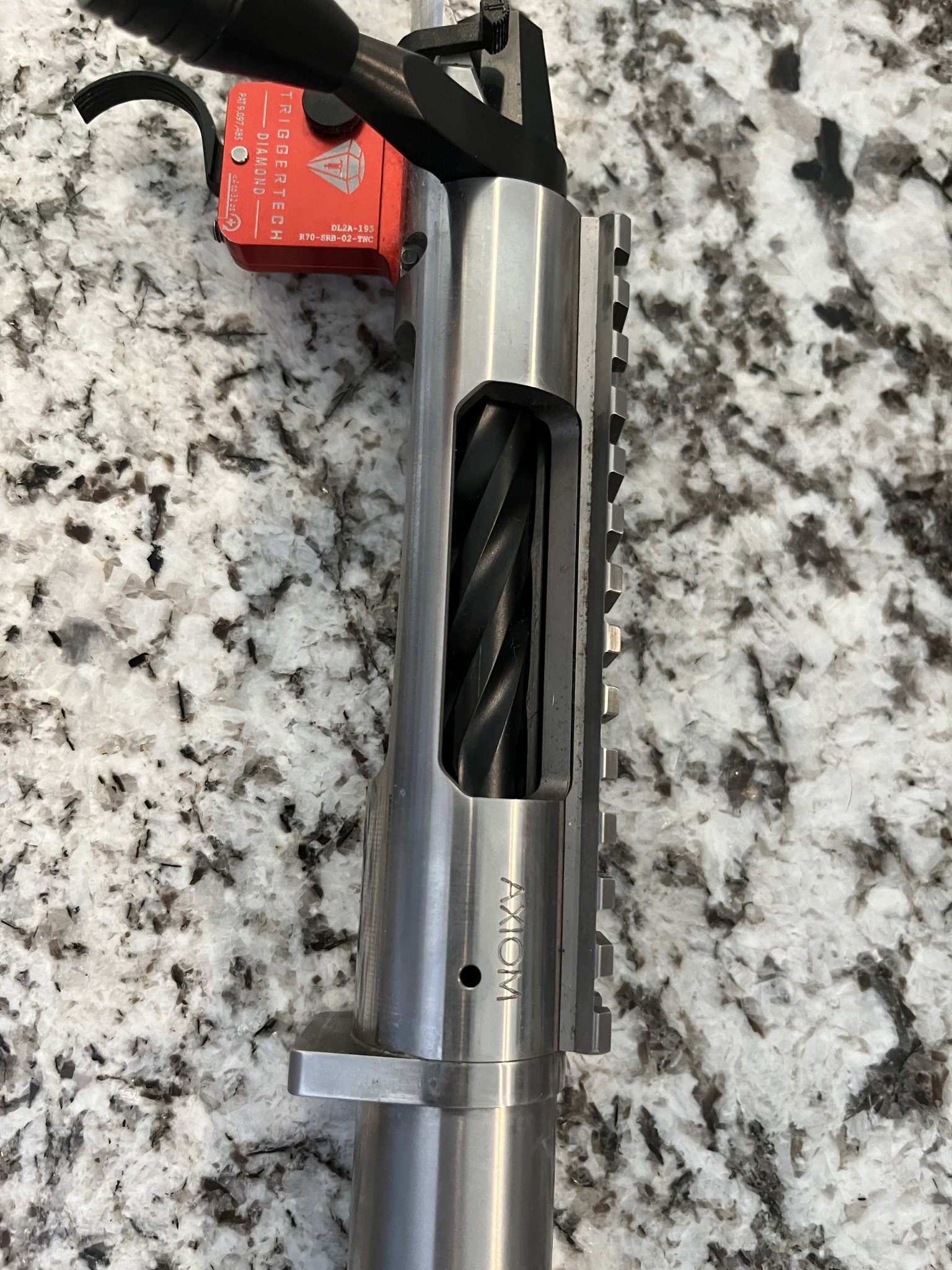 Curtis custom axiom action with trigger tech diamond Hawk Hill, M 24 barrel chambered in 6 dasher. Also have a proof barrel competition profile chambered in 6 dasher.