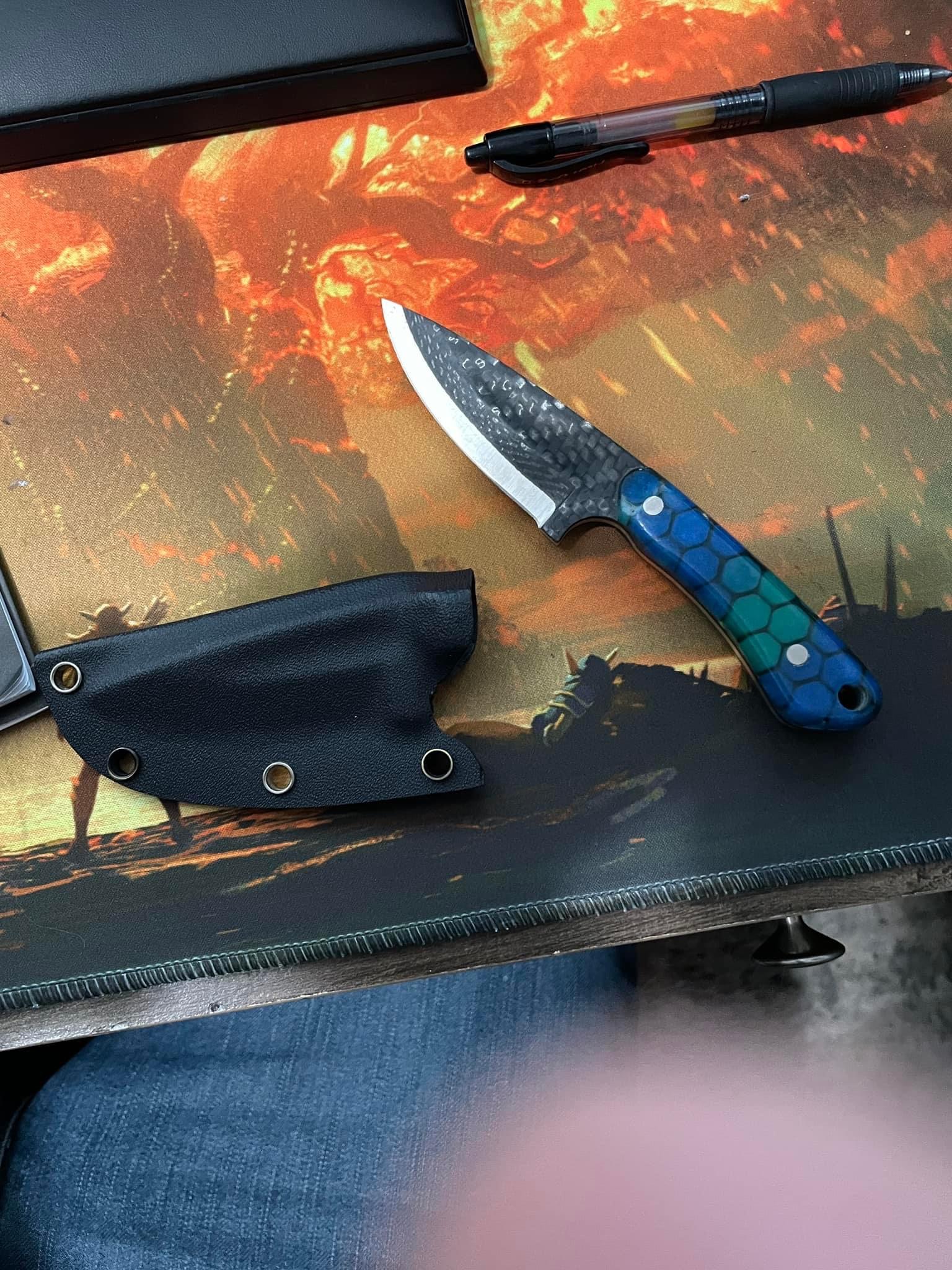 Small fixed blade with custom scales. Cpm4v core with Carbon fiber press on the blade. Pretty handy little fixed blade. Has a basic kydex sheath. I paid two fifty when I bought it.