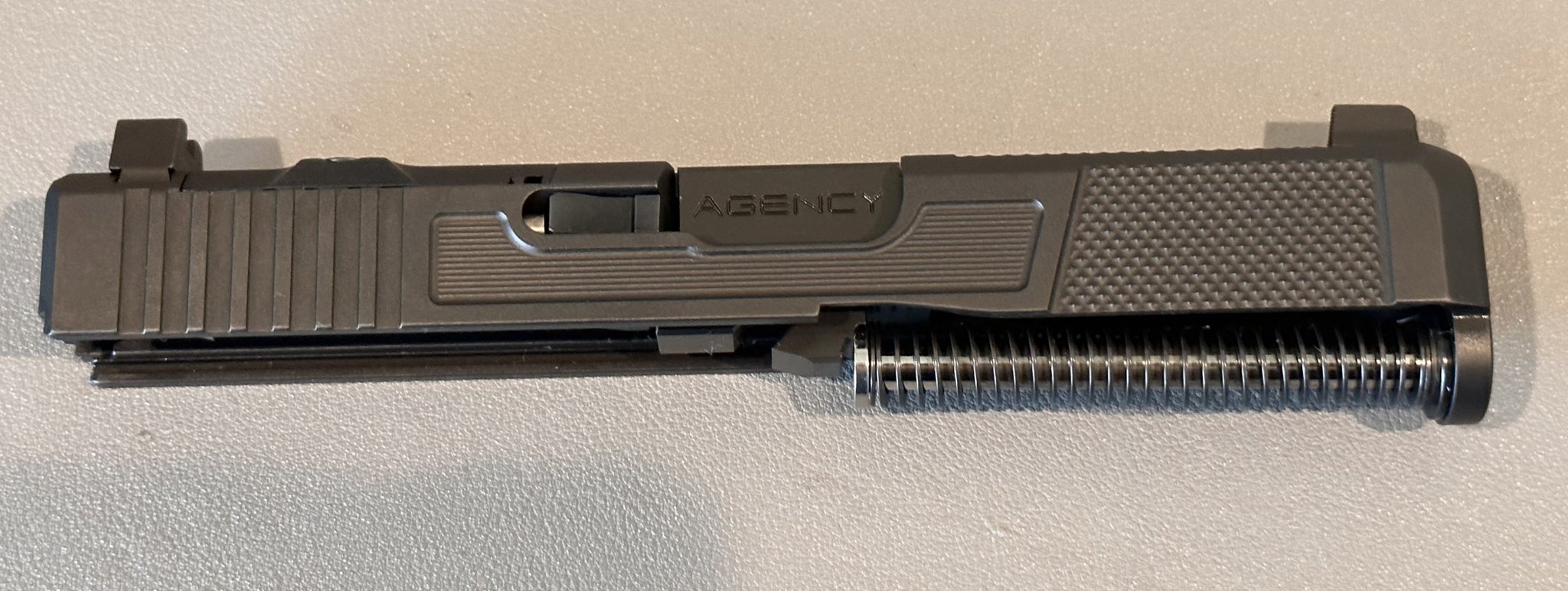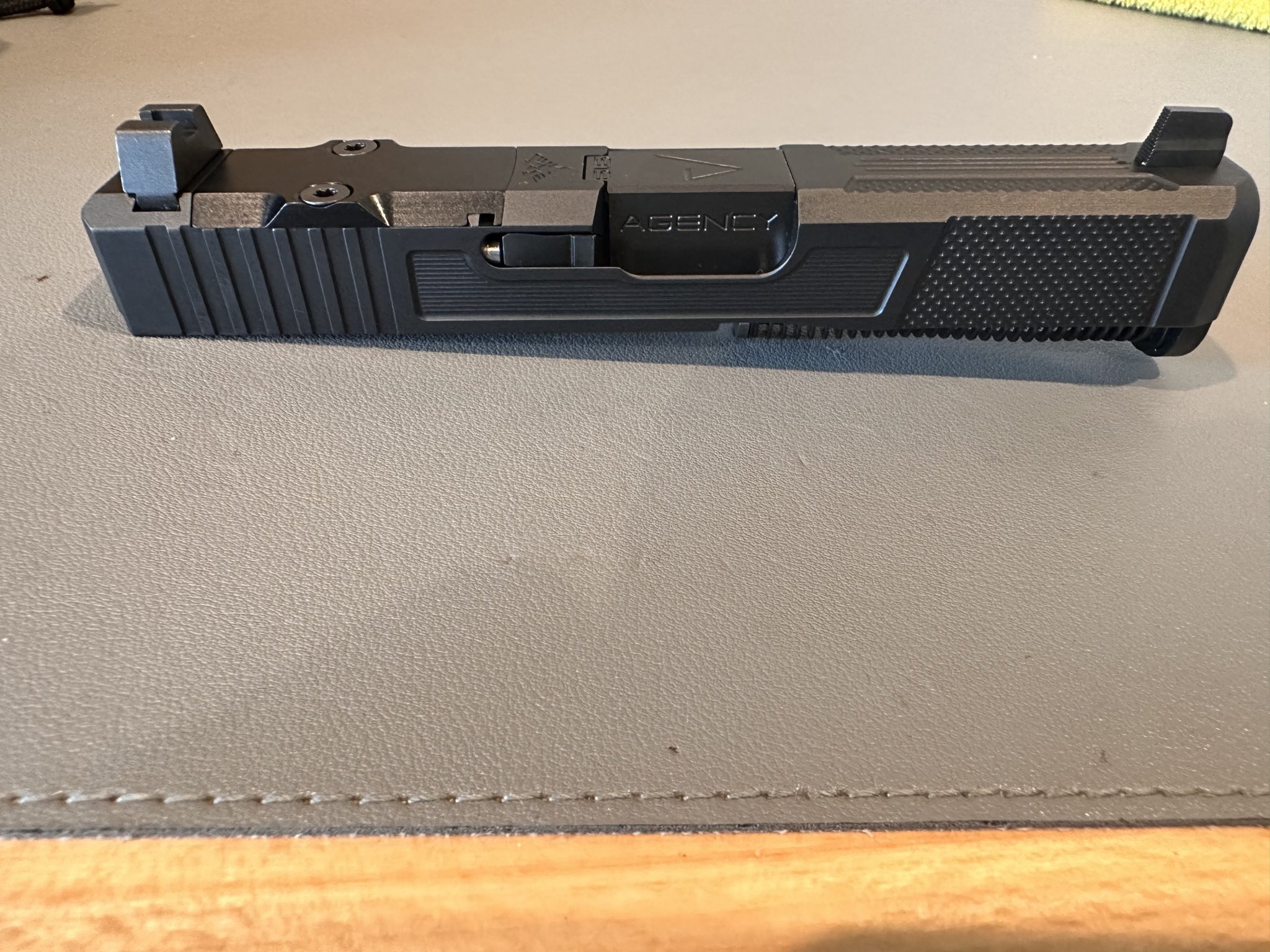 Glock gen5 oem slide done by Black Phoenix customs DFS pattern(RMR cut). Glock 19,45 and 19x compatible. All Glock oem internals. Ameriglo GL429 sights. Nitride finish. Comes with an Agency fluted barrel with Agency recoil spring. All of it is unfired just assembled.