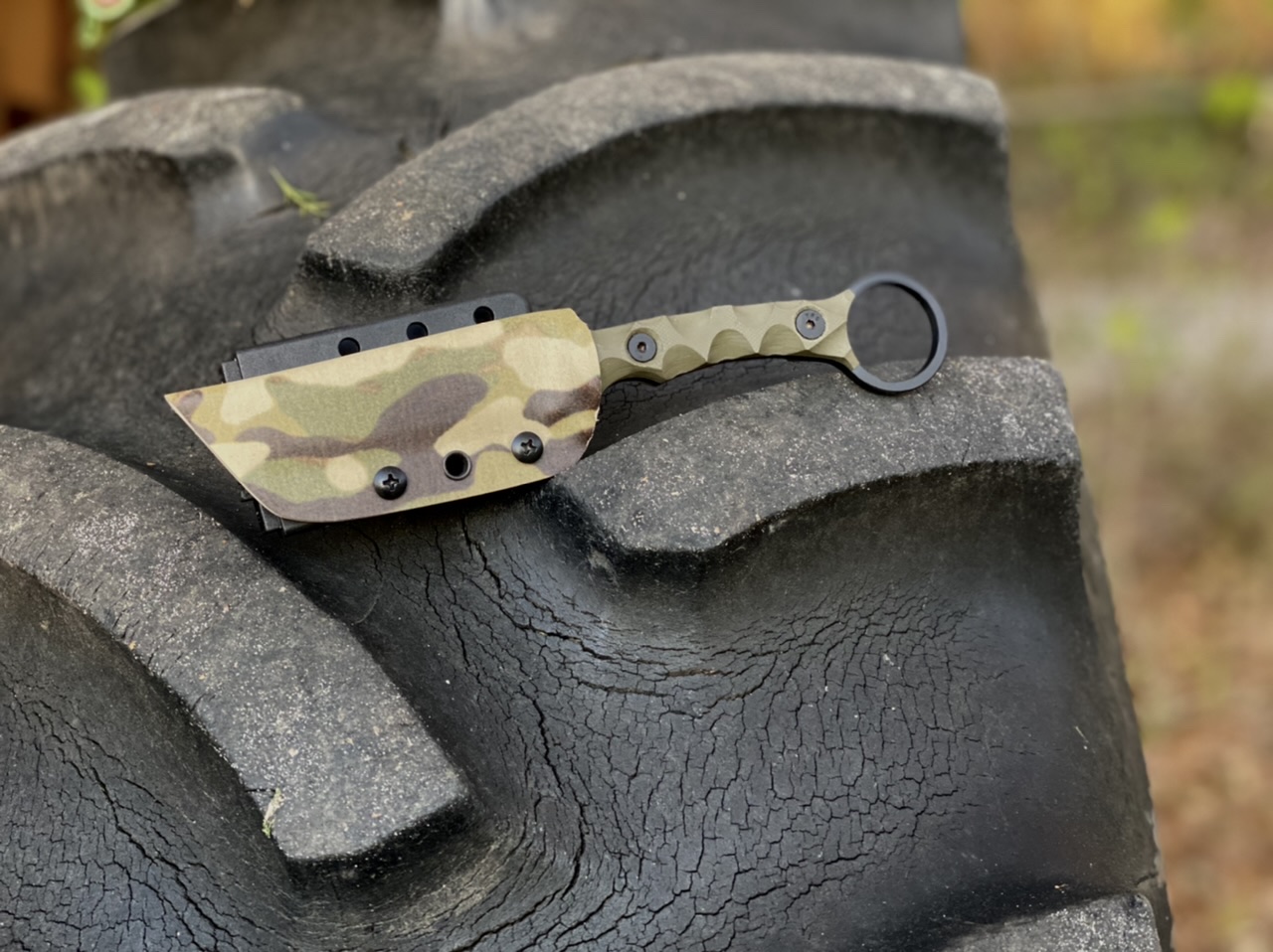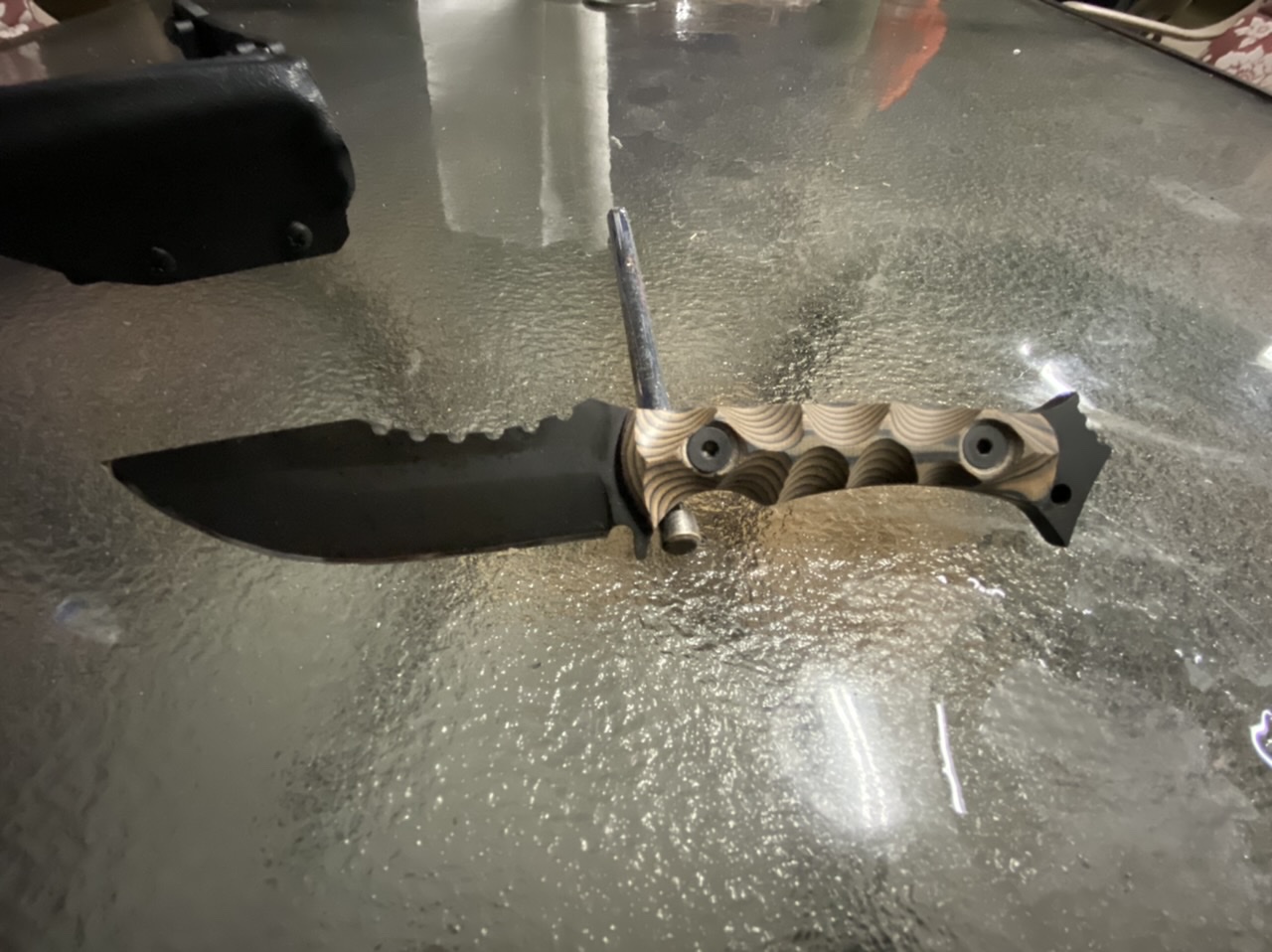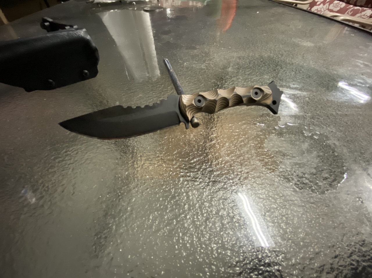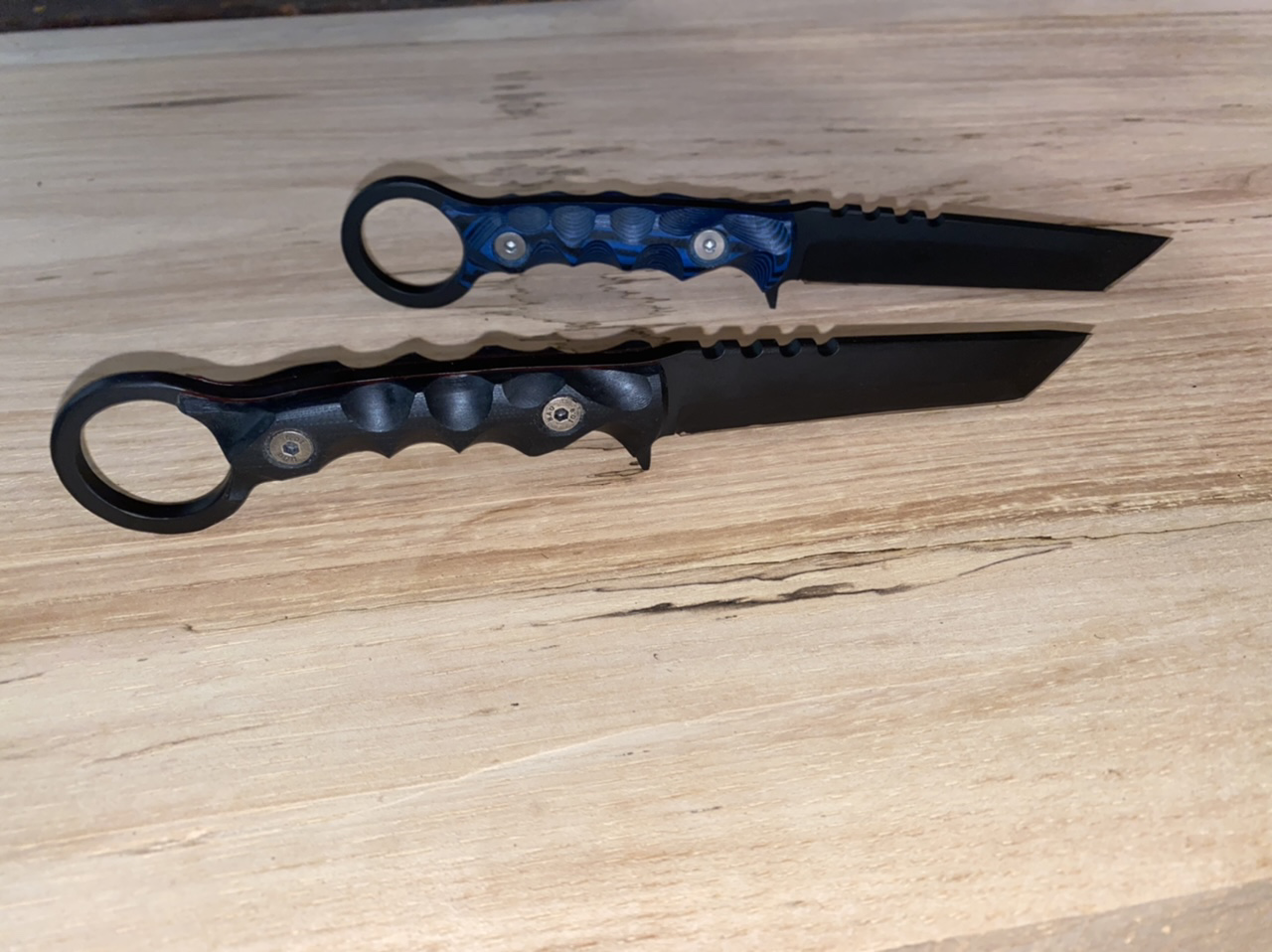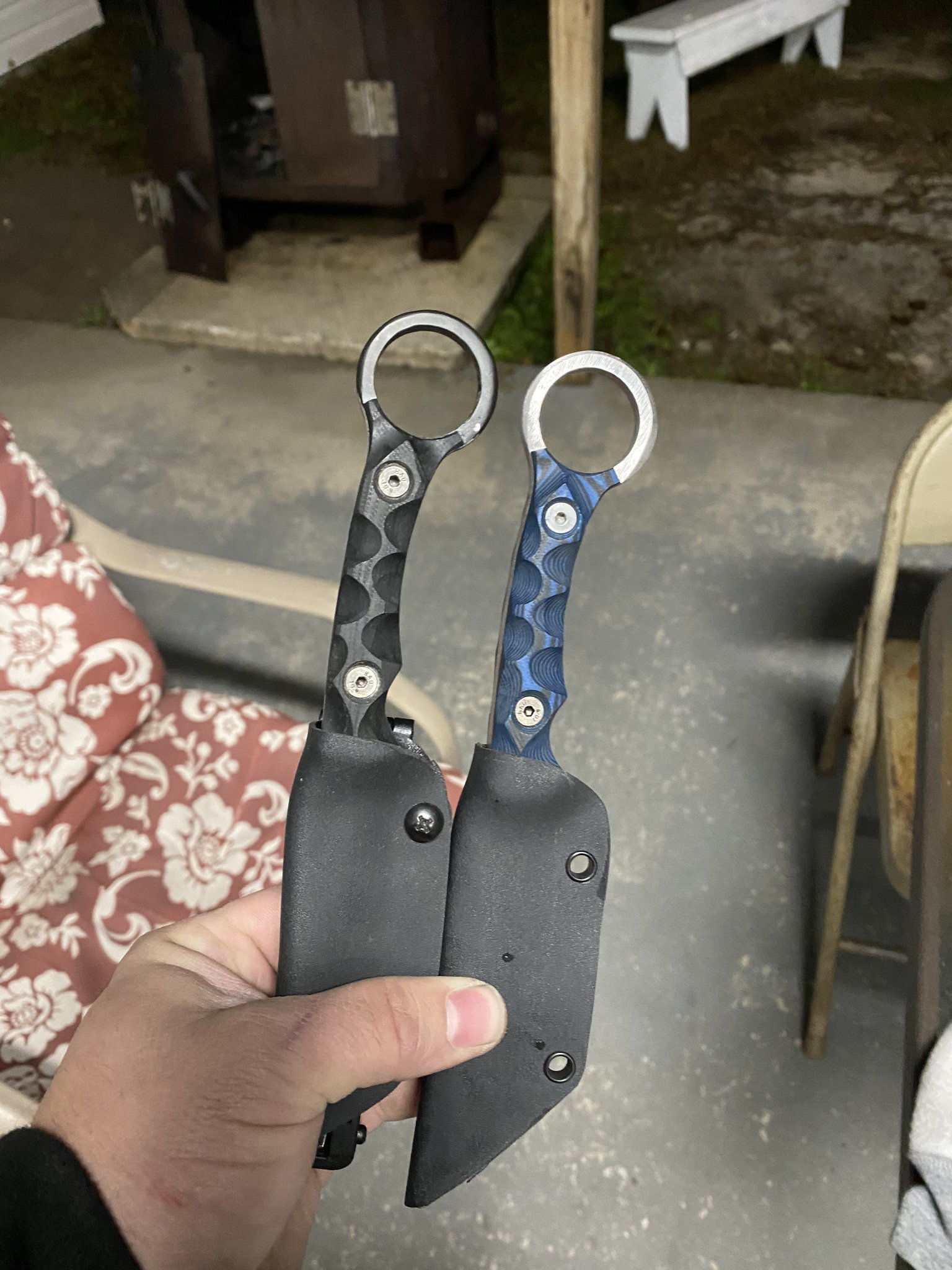 I started to make some knives. The steel is 3/16 thick 1095 with g10 handles. They come with a Kydex sheath with blade tech molle attachment for a plate carrier or a ulticlip belt attachment. These are made to be used and abused. I can take order for particular color combinations. The overall length is 8.75 with a blade length 3.75.