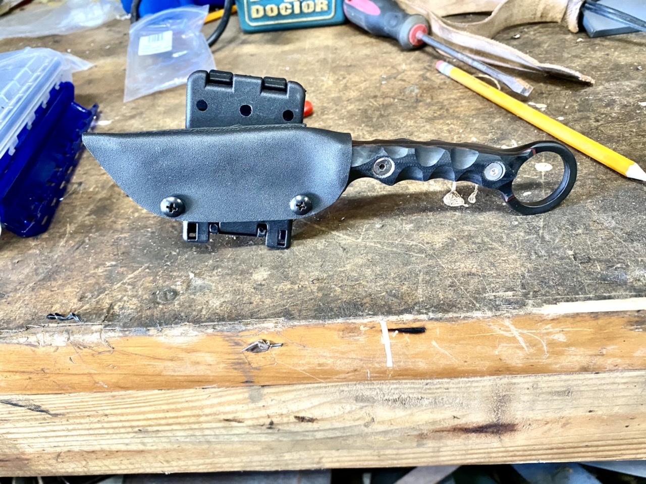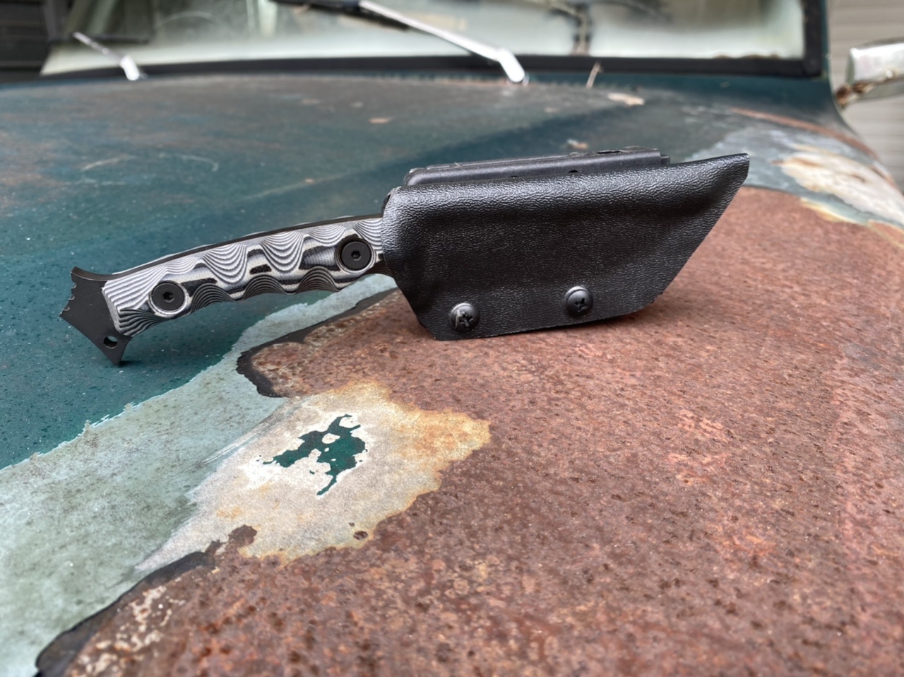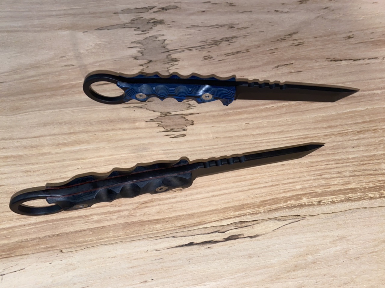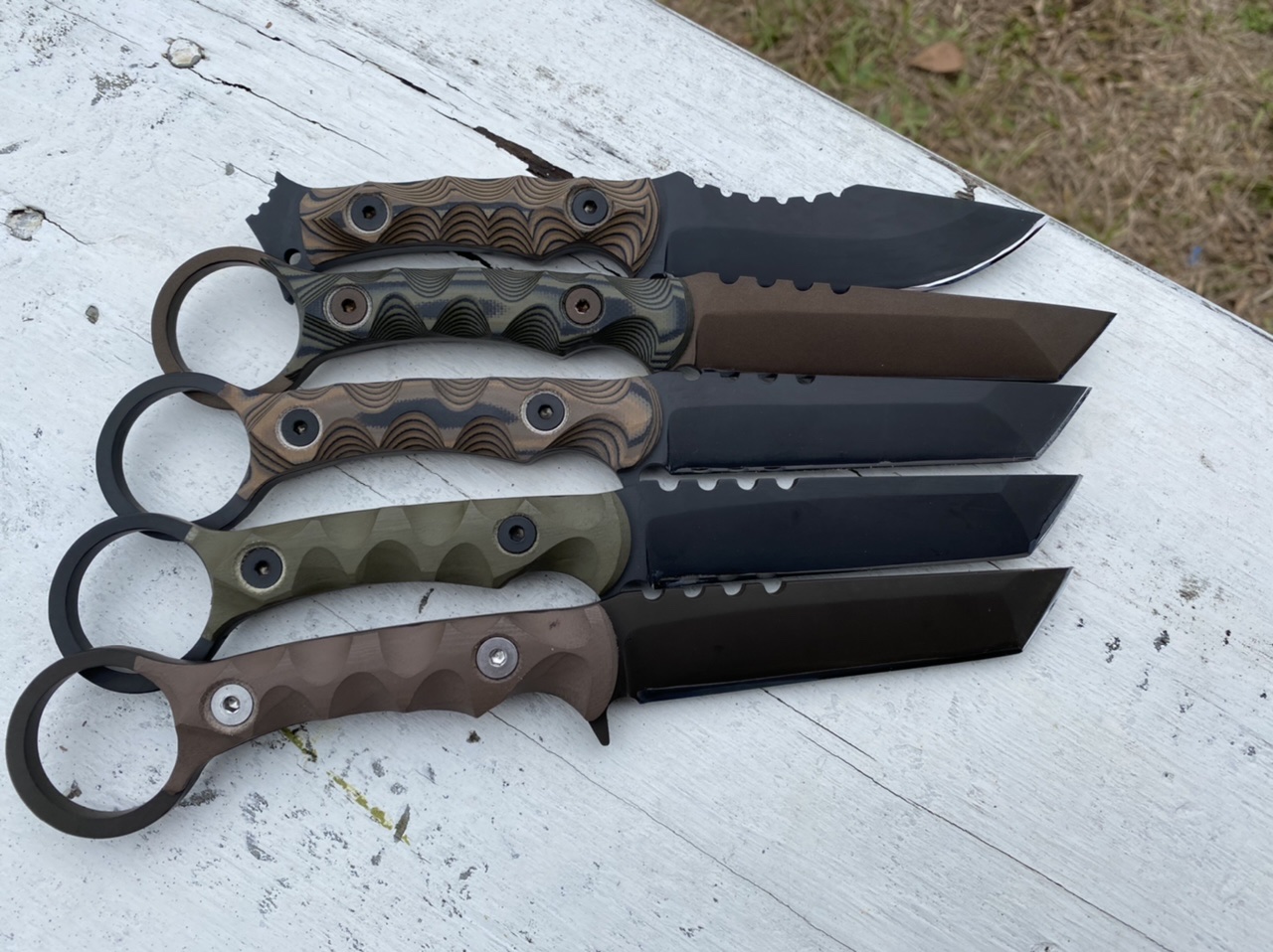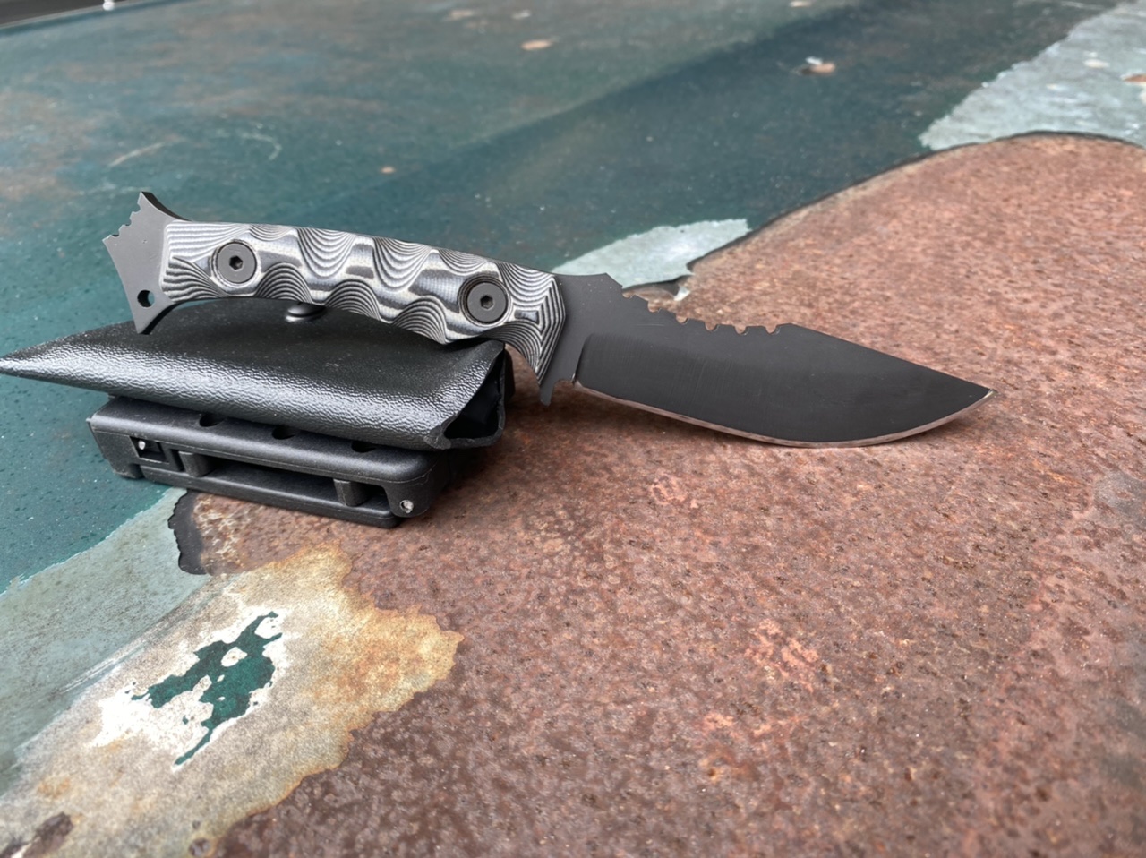 I started to make some knives. The steel is 3/16 thick 1095 with g10 handles. They come with a Kydex sheath with blade tech molle attachment for a plate carrier or a ulticlip belt attachment. These are made to be used and abused. I can take order for particular color combinations. The overall length is 8.75 with a blade length 3.75.