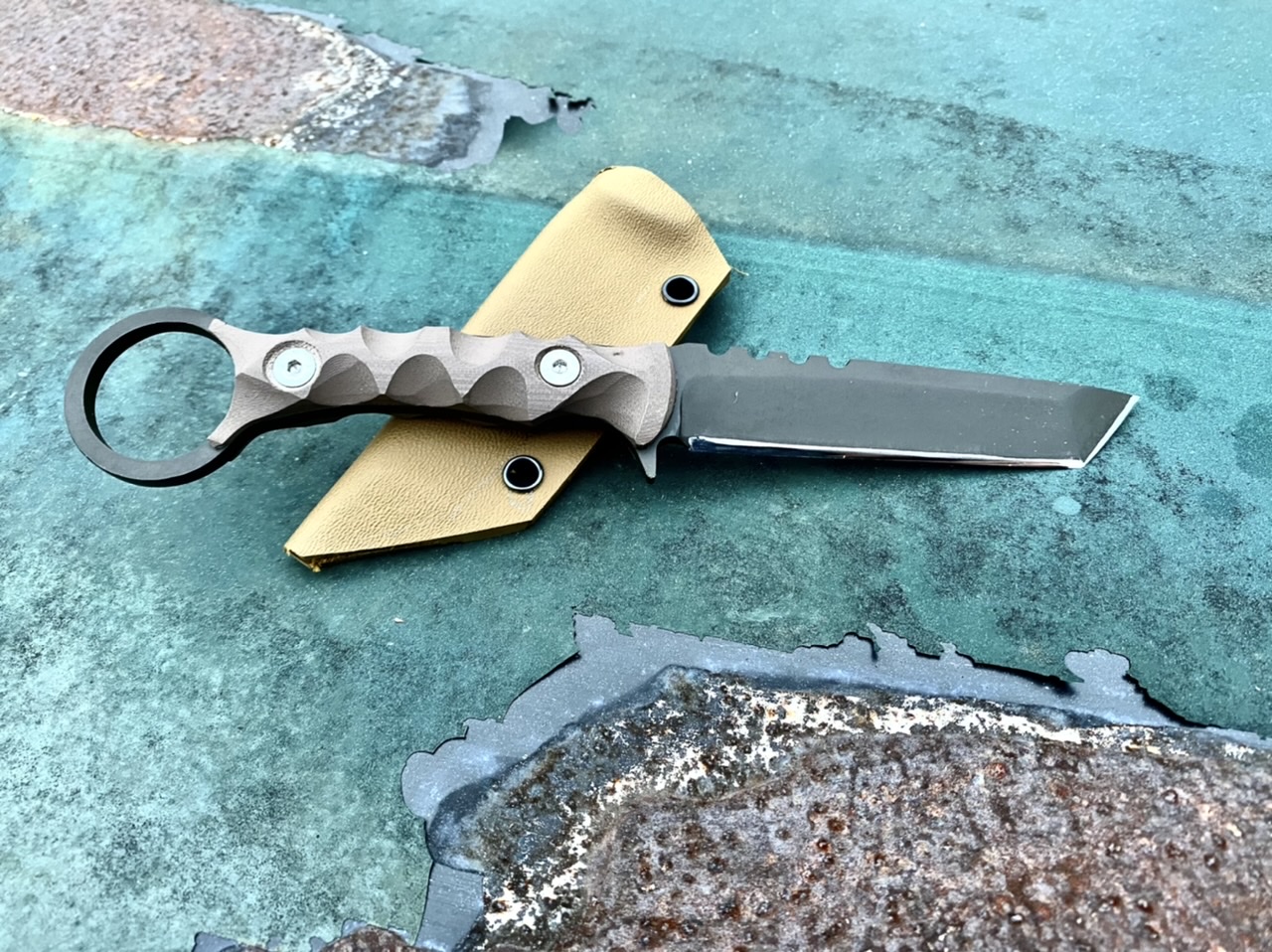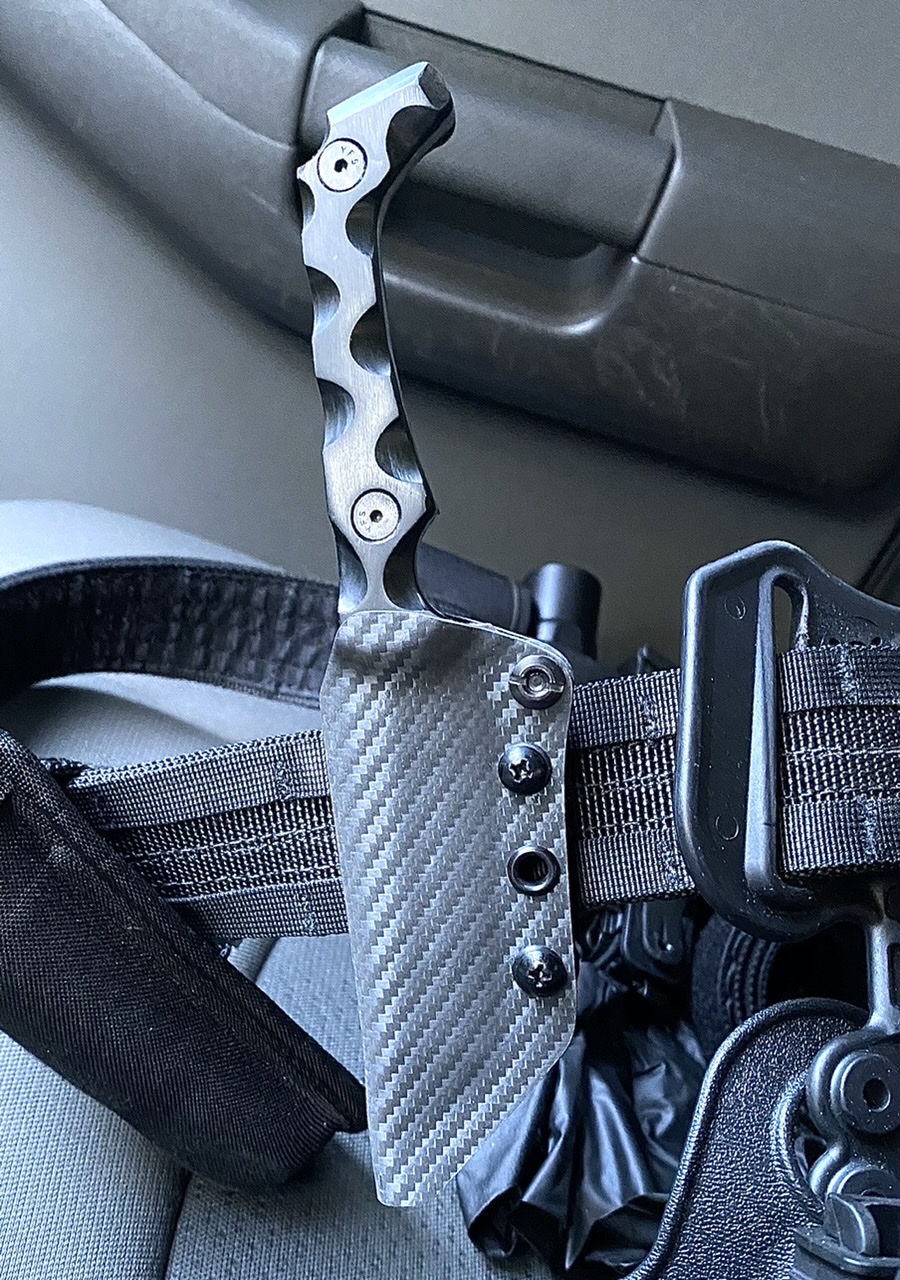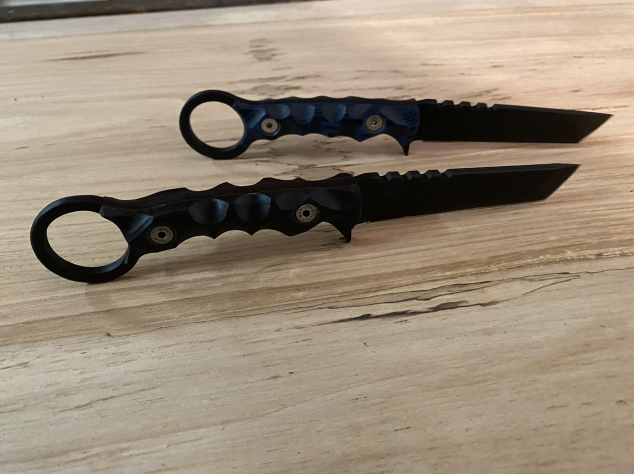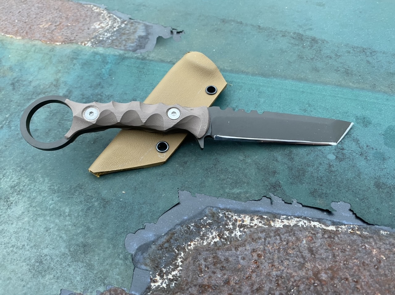 I started to make some knives. The steel is 3/16 thick 1095 with g10 handles. They come with a Kydex sheath with blade tech molle attachment for a plate carrier or a ulticlip belt attachment. These are made to be used and abused. I can take order for particular color combinations. The overall length is 8.75 with a blade length 3.75.