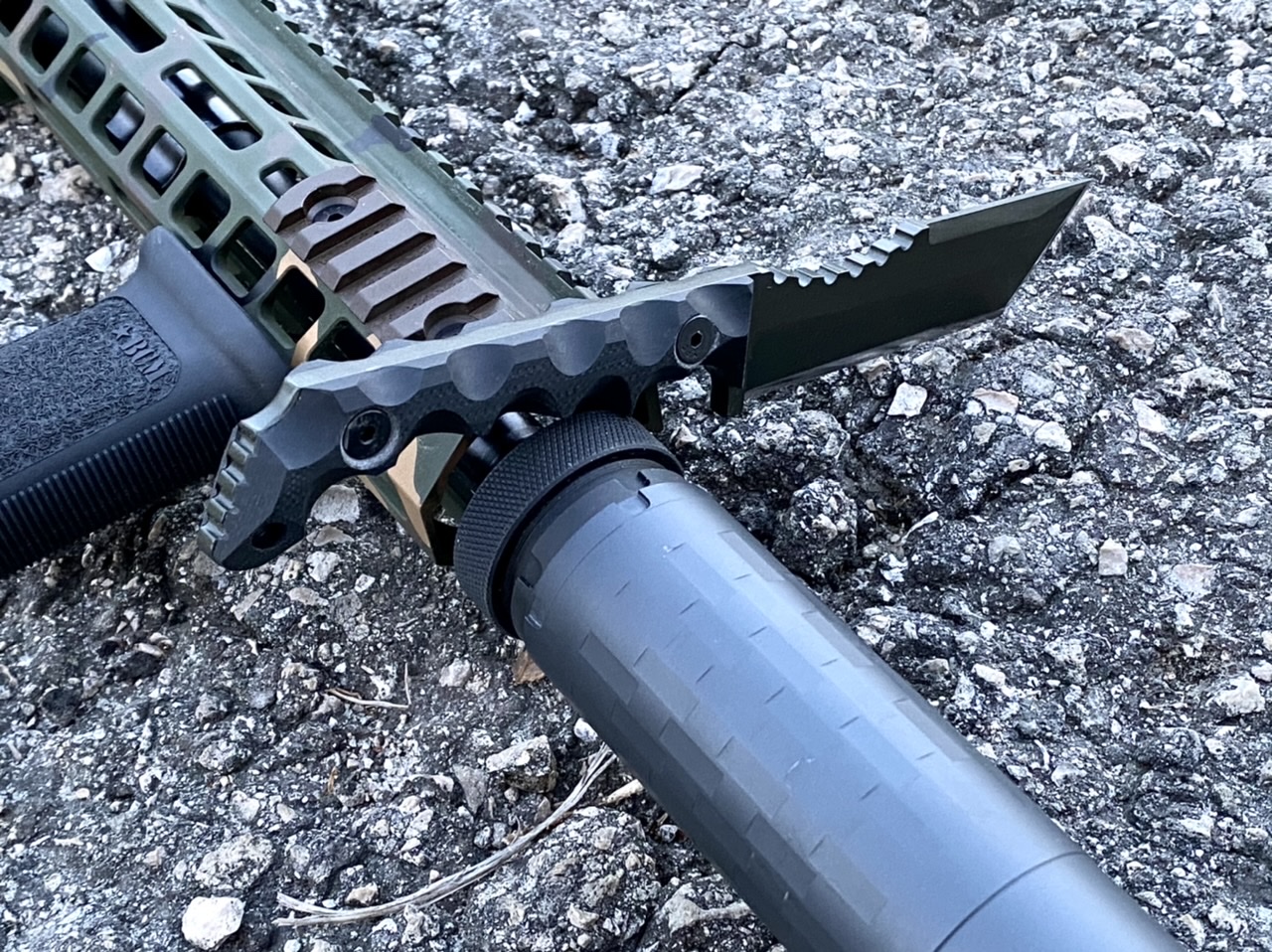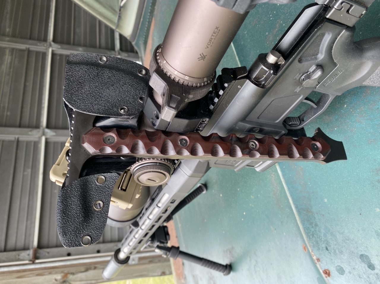 The sheath is currently a top load Kydex sandwich attached to a belt clip utilizing a conventional sling swivel QD attachment.