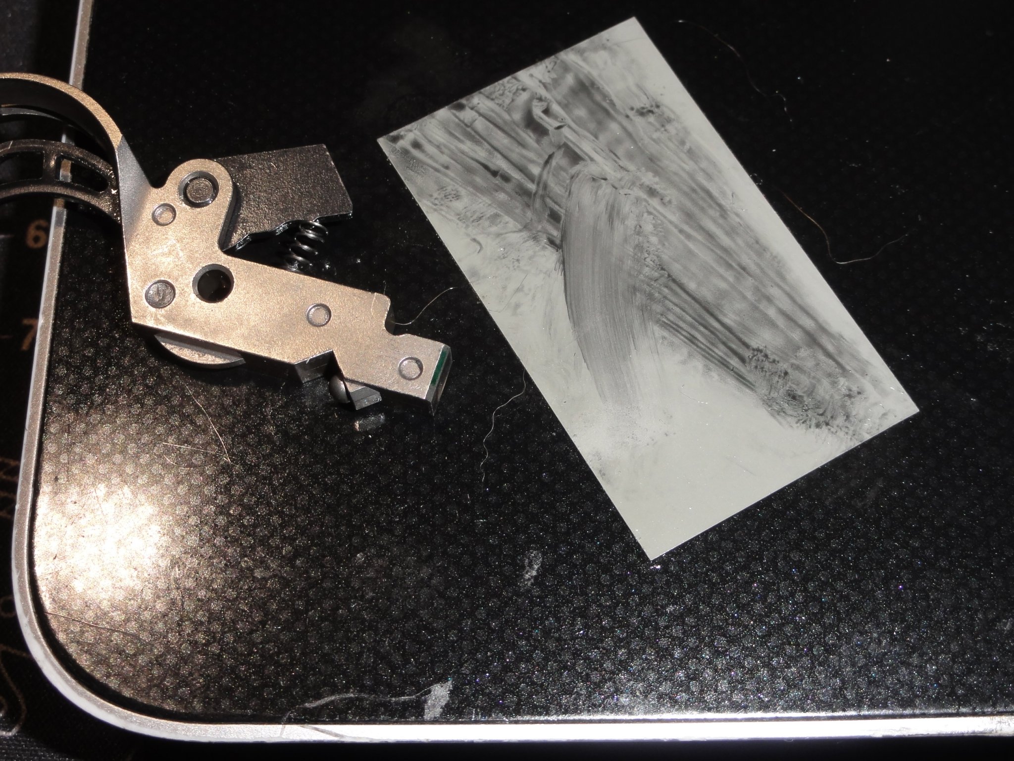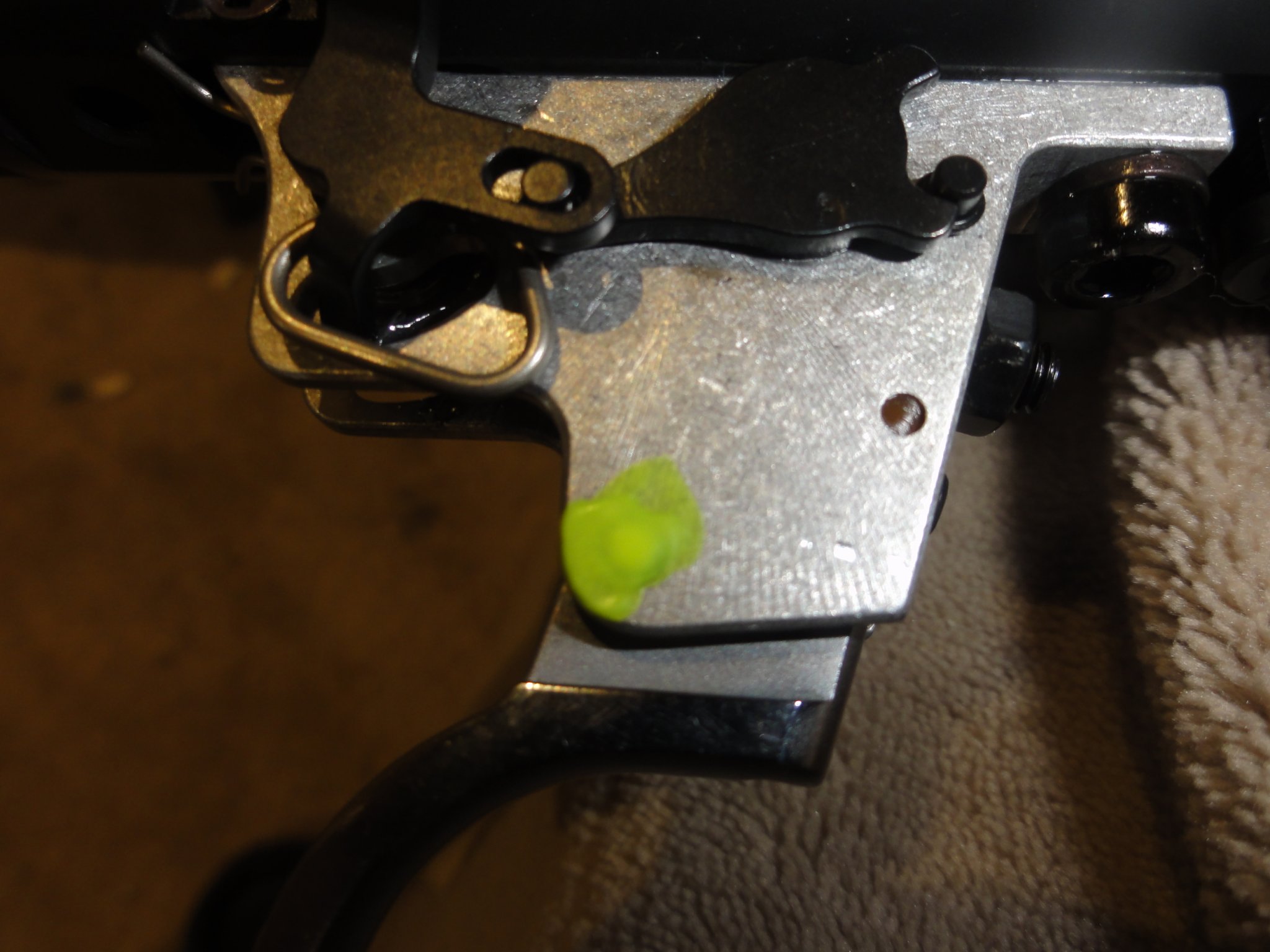 Before anybody GASPES... lol.... My vice is a small flat jawed machine vice and was really only used to keep the action vertical. Then I used a Wheeler level system to dial in the scope. It was the best way for this particular rifle. It spead up the entire process and minimized the amount of levels involved. I hate to say this but the level on the Area 419 rail is nearly useless while shooting. It is totally obscured by my scope. It is however useful for scope mounting. Below is my RPRR trigger that I lapped off. I don't think I will need to do anything more to the CZ 457. Just adjust and replace the trigger spring.