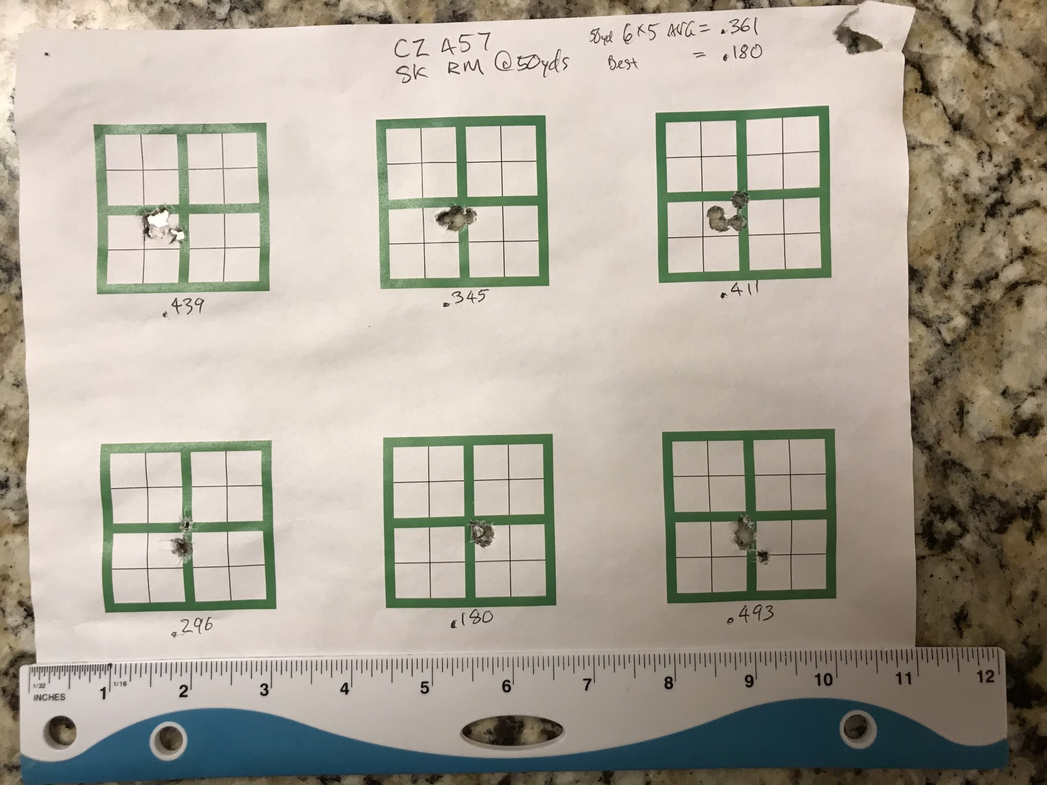 Attached are the 6x5 groups at 50 yards with the CZ 457 Pro Varmint, Athlon Argos BTR Gen2, Atlas CAL bipod and SK Standard+ and SK Rifle Match. The rifle now has approximately 750 rounds and it is settling in nicely. Of note, earlier groups with the SK Standard+ shot an average of .520” 5 shot group shortly after purchase.