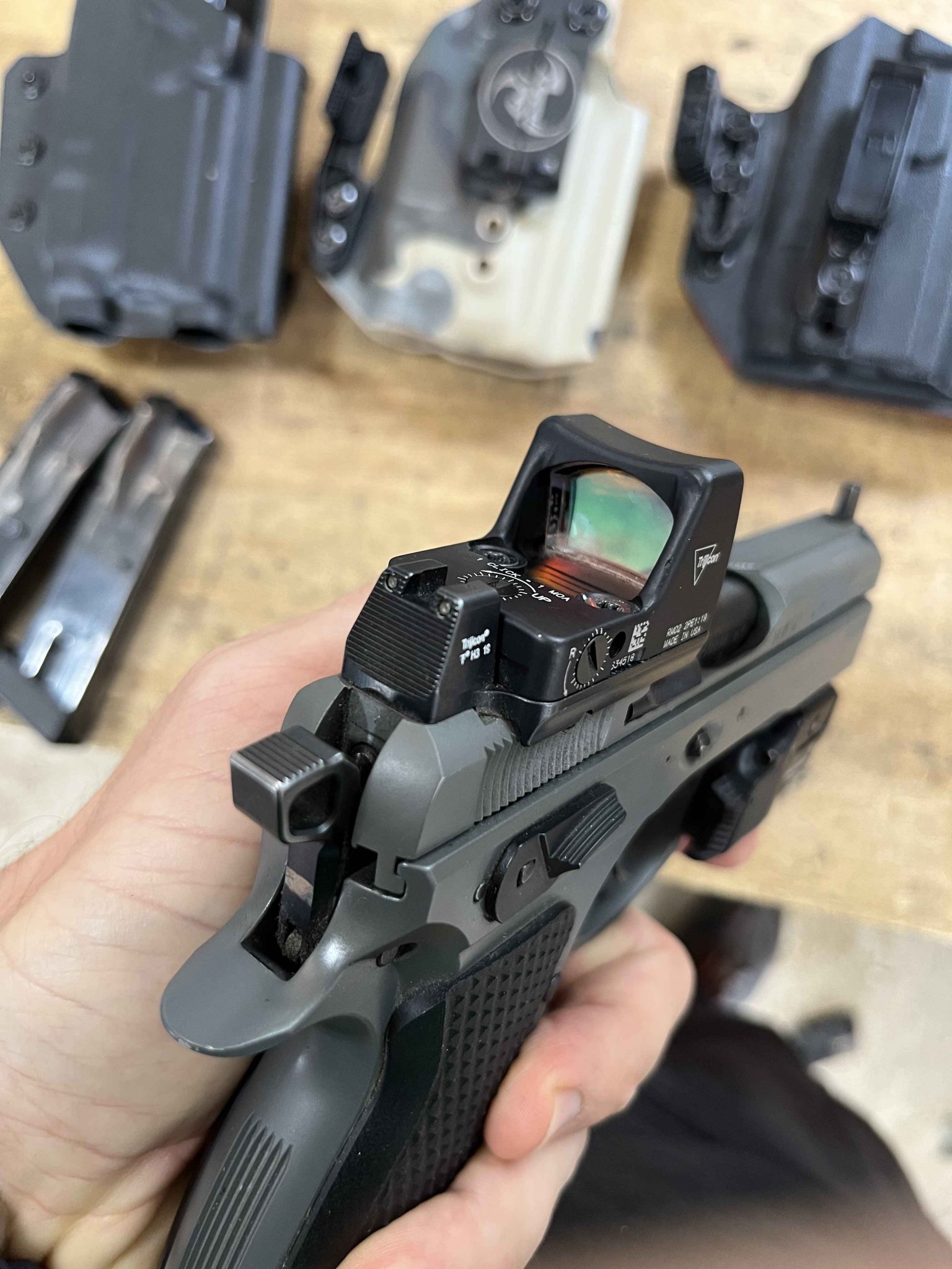 This is a sweet little P01 that carries nice and shoots great. It has the normal holster wear from carrying, but the threaded barrel has around 1k rounds on it and new barrel only a few mags. I started carrying M&P's and I'd rather consolidate my carry guns to one brand. I still love my CZ's but this one doesn't get carried anymore.