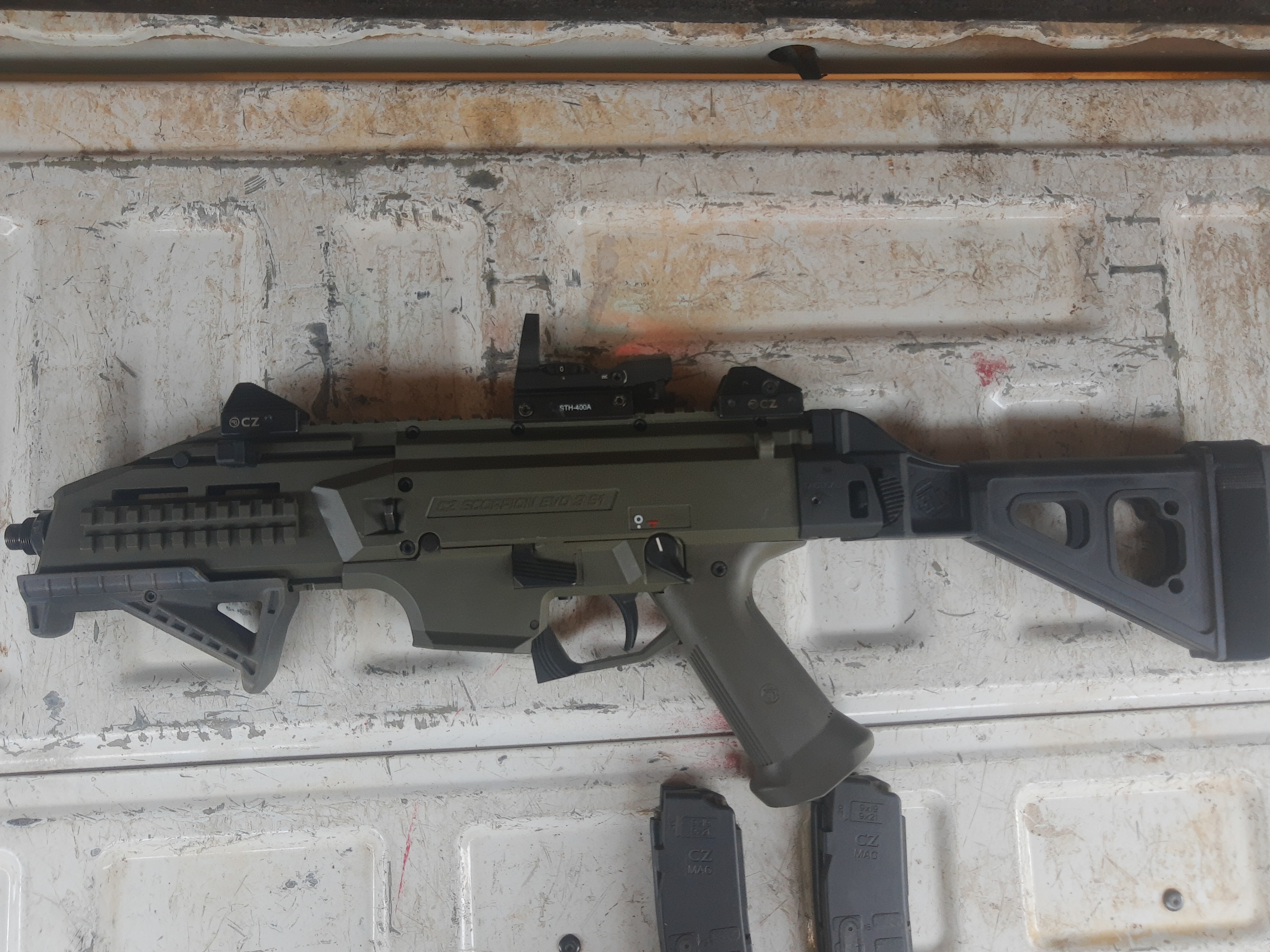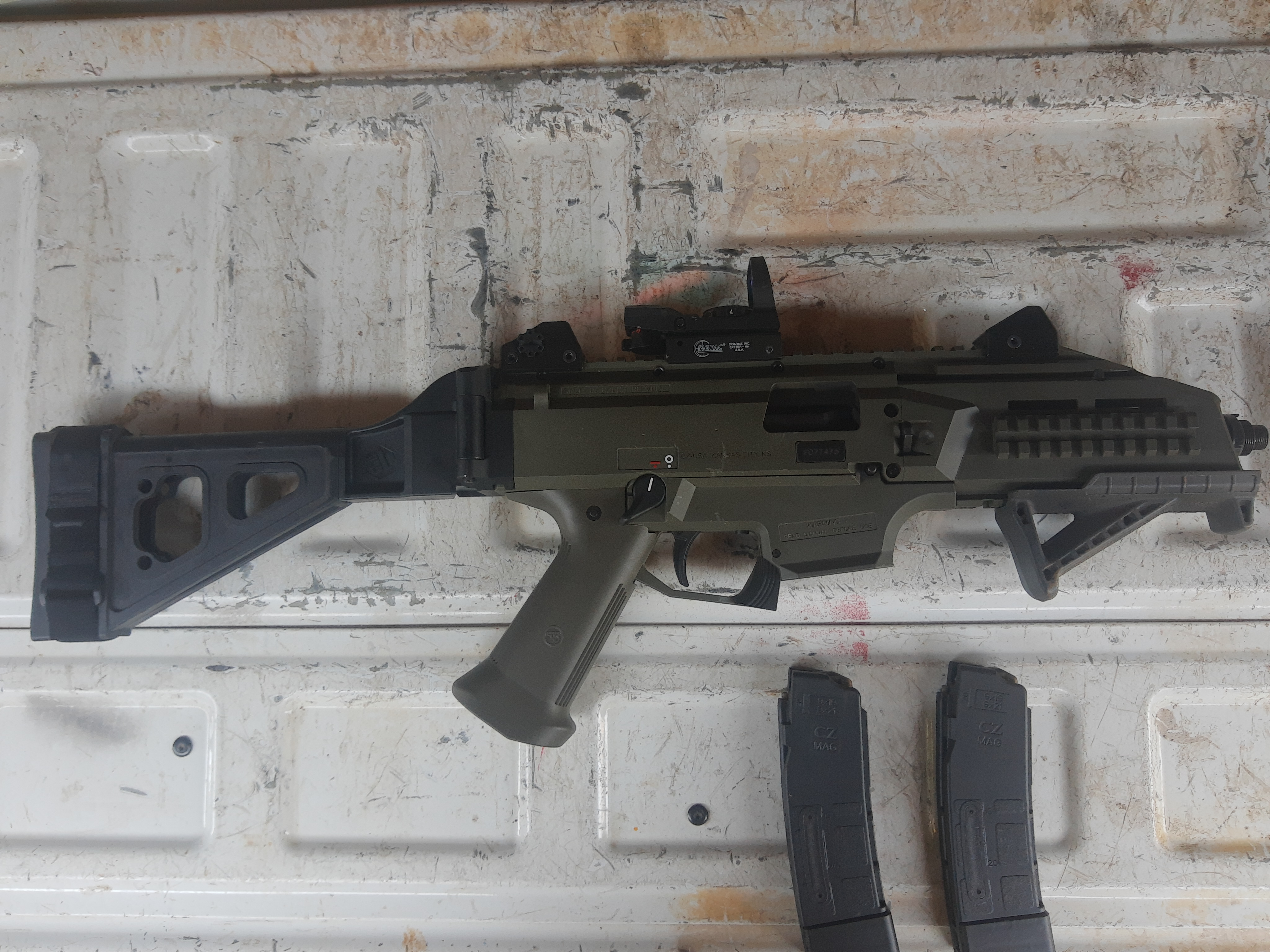 OD green lil cz fer grabs here... Has SB folding stock and functional and decent sig red dot. Has 2 20rnd mags and a cheapo fore grip.locating the break for it...hadn found yet.. Like to get 1000 for this here mess....shoots good ....low round count. Feed ramp has no marks on it...will suit all ur covert tactical black ops...VOID where prohibited....if u live in a commie state, chances are this ain't for u....u should have moved long ago anyway... happy trails
