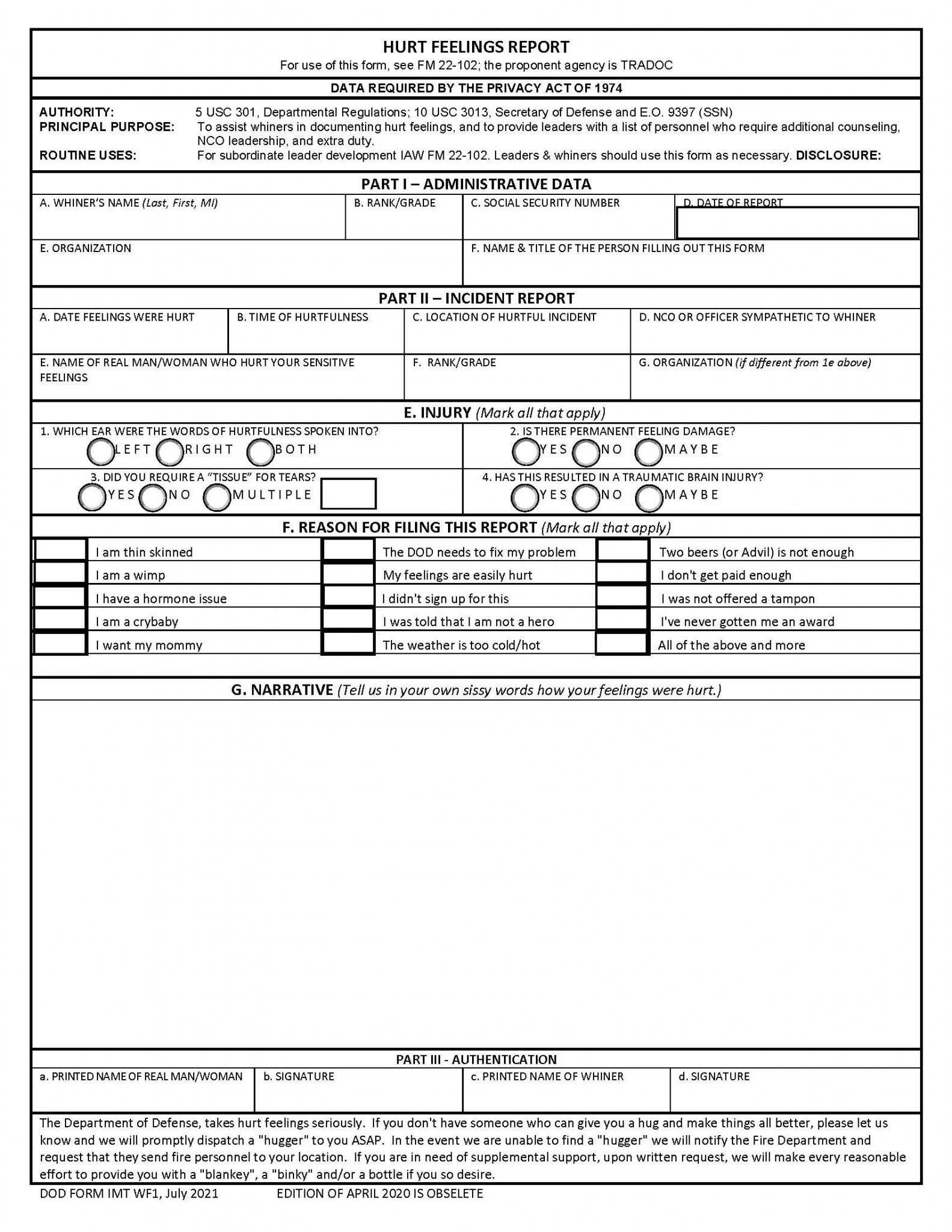 I have, for so long, needed a Hurt Feelings report. But, alas, I will be going in for surgery next month where they will remove my last feeling. This will solidify my status as pure asshole.