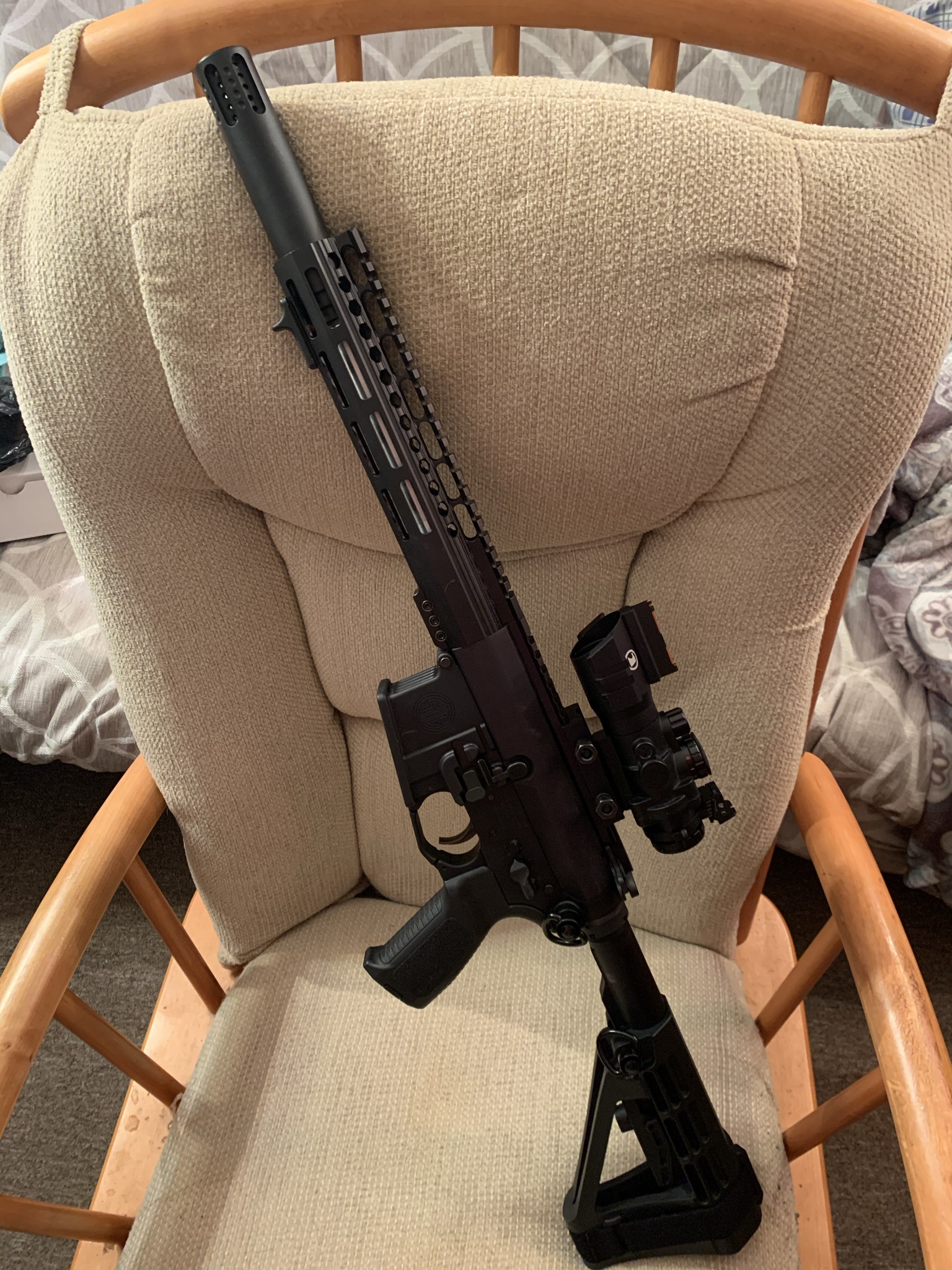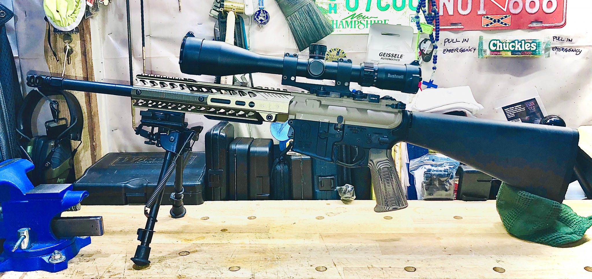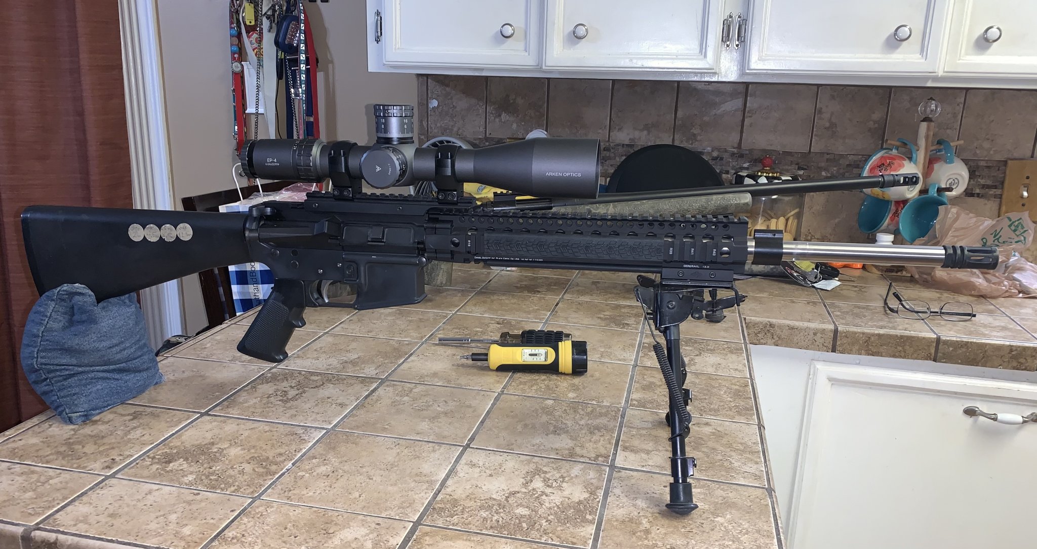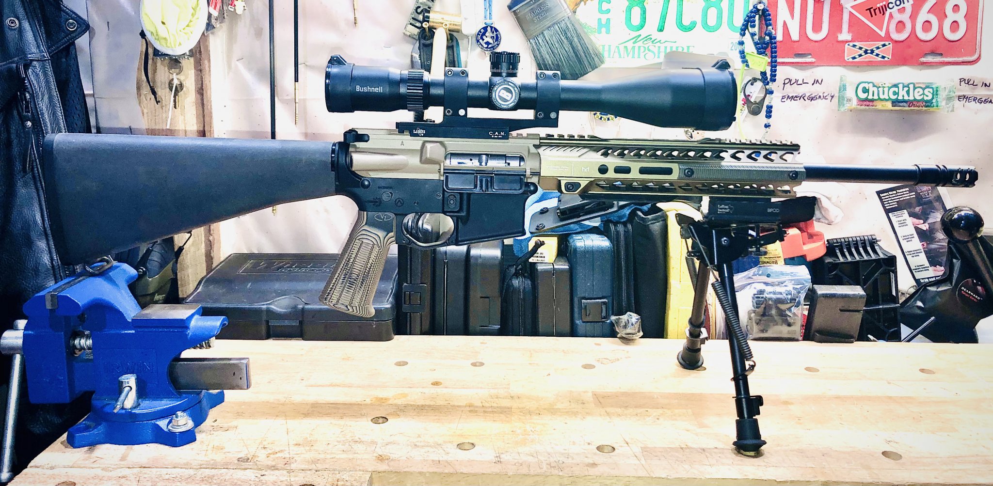 Spikes lower with Geissele G2S trigger, A2 stock, and VZ grips FDE pistol grip, Catch 22 bolt catch. Upper is FDE Aero upper with Lothar Wather dedicated 16” barrel, CMMG 22 bolt, collar, bore buddy weight kit, Strike Industries 10” FDE rail, Bushnell 6x24 Engage scope in LaRue mount, and Harris bipod on LaRue bipod adaptor.