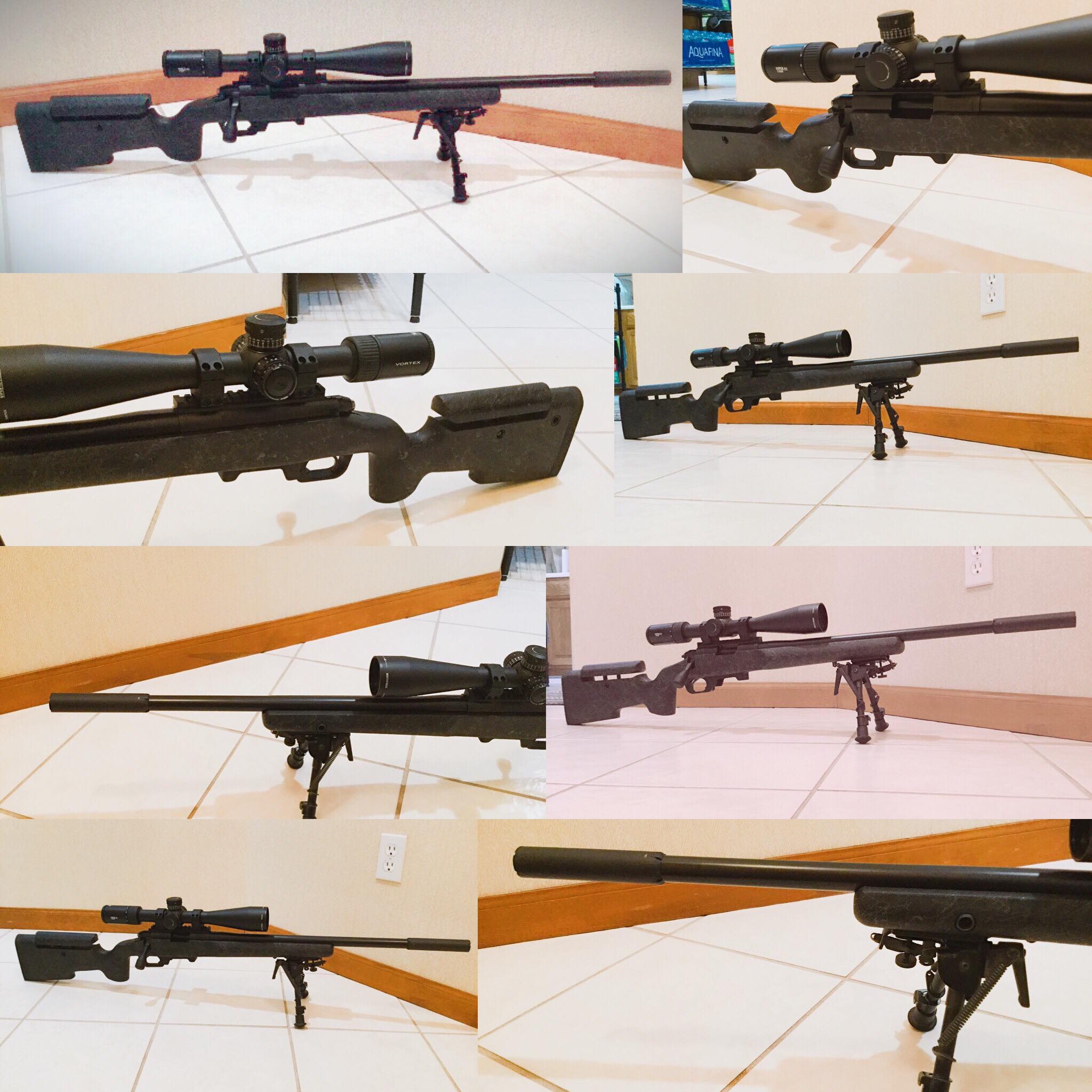 Just some pics of my new V-22 from VGW. It is a Ravage with Grayboe Black Adjustable Cheek Piece stock and Gray Spiderweb finish. Barrel is the Kukri profile and 20" long. The action is VGW Melonite finish and barrel is Black Cerakote finish. Has the upgraded Calvin Elite trigger set for specified weight of pull. Suppressor is SilencerCo Sparrow. Scope is Vortex Viper PST Gen 2 in 5x-25x. 30mm tube with 50mm Objective. Rings are Seekins 30mm High 0.97" 4 screw. FYI# There is approx. .250" between barrel and scope with covers installed. Could of gotten by with lower rings, but wanted to insure adequate clearance in case of scope change to larger Objective. Thanks to Paul and everyone at Vudoo Gun Works for everything. John & Joy.