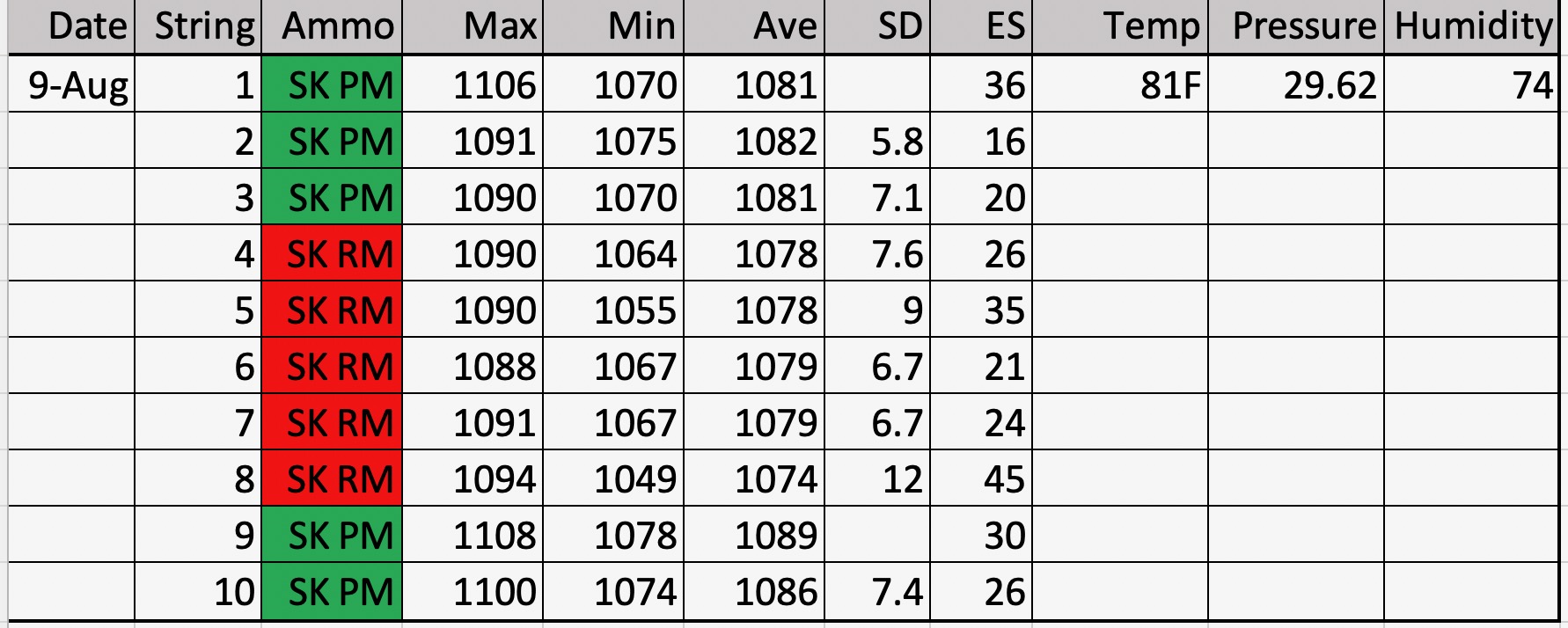 What was the standard deviation (SD) and extreme spread (ES) for each lot?Adjusted the Magneto Speed to "6", works great. 100 rounds though the tube at the indoor range today. Zero didn't change. 1082 average FPS for SK Pistol Match out of my 20" Ace MTU barrel. SK Rifle Match averaged 1078 FPS.