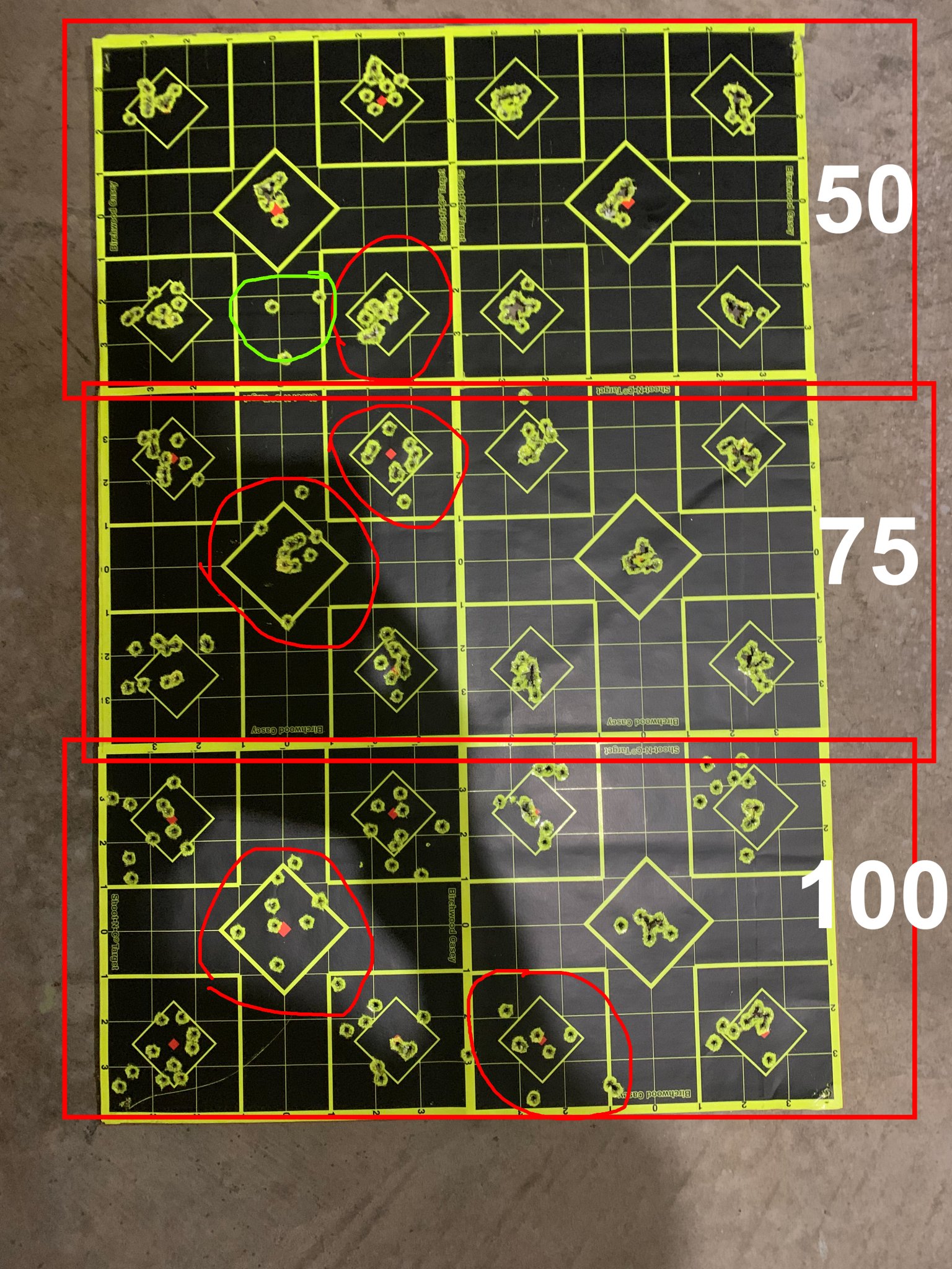 10 round groups today. Red boxes for each distance 50, 75, 100 yards…red circles were SK Rifle Match, green circle was the first three rounds for zero at 50…disregard. Everything else was SK Pistol Match.