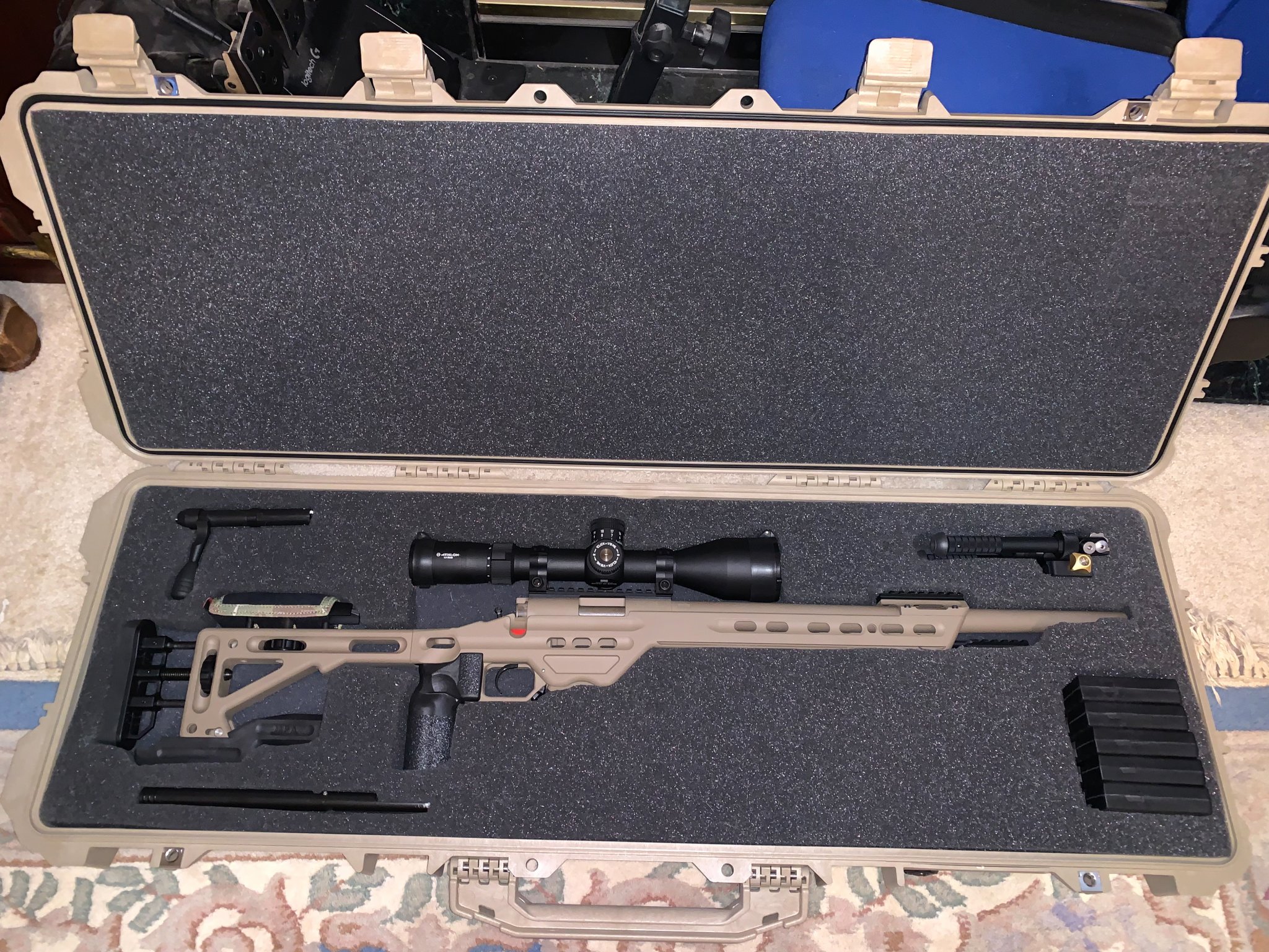 Good looking rifle. Give us a range report when you have time.My Vudoo V22 Three 60 was delivered today (ordered March 28, 2021). 20" MTU non-threaded barrel with 11º target crown, in an MPA BA Comp Chassis, FDE all over. Picked it up at the FFL, brought it home and got the Athlon Cronus BTR Gen 2 4.5-29x56 mounted on 40MOA base. Atlas CAL bipod with Area 419 ARCA mount and Wiebad cheek pad. Tomorrow it goes to the range for initial zero. Going to put some SK Pistol Match through it, only have one brick of SK Rifle Match, saving that for now.