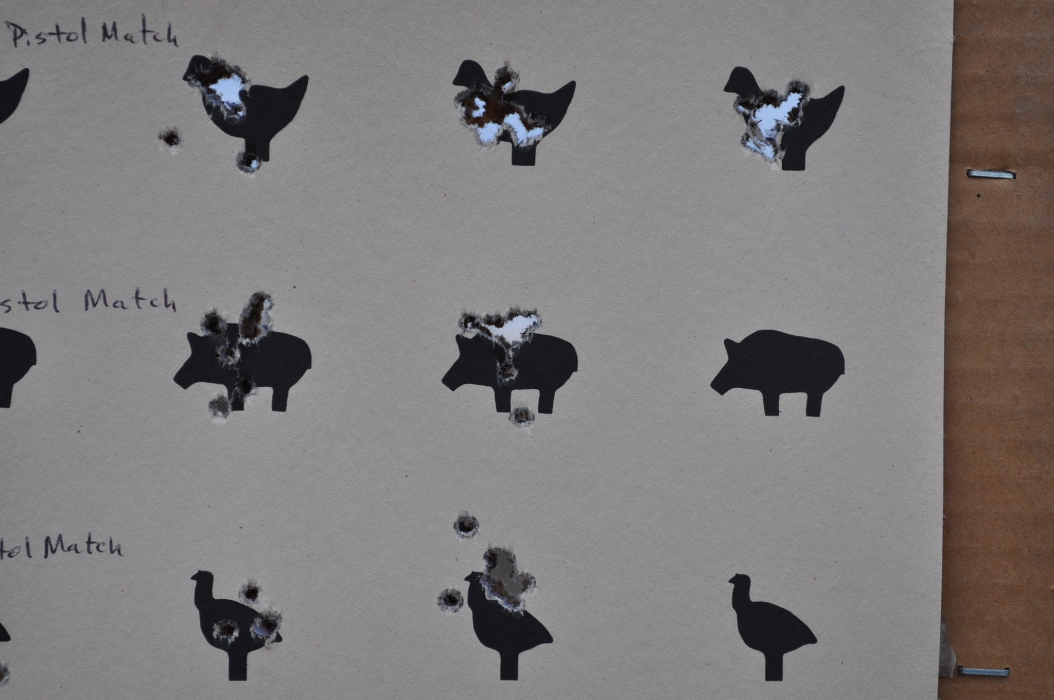 From top left chicken: SK Std+, Lapua Center-X, another lot of Center-X. On the pigs: Lapua Polar Biathlon, another lot of Polar Biathlon, and on the middle turkey, Federal UM-22. The two shots out of the group on the 1st chicken were the first two shots out of a cold, clean bore. The 1st lot of Center-X was a random lot I'd tested in the 40Xs that didn't shoot good enough to warrant purchase in quantity, while the 2nd group was with some Center-X that I'd bought a half-case of. The 1st Polar Biathlon pig was with a lot# that I bought 4 bricks of, while the 2nd one was shot with a lot# that Grafs had only six boxes of - piss poor luck to spend that much on almost a half-case of the poorer lot & only get 6 boxes of the better one...and I could easily hear the softer report of the slow rounds of that first lot, relative to the louder pop of the faster ones, even with the TBAC 22TD suppressor on the rifle. The 2nd lot had a more uniform report for all 10rds, even though it looks to me as though there are 2rds between & below the pig's feet. I'd bought three different lots of the Federal from Midway a couple of years ago - not on purpose, that's what they sent to fill an order for 20 boxes. This is the best results I've ever had with any of that Federal, after trying it in both 40Xs & my original V-22/Krieger. Looks good enough to warrant further shooting in the Ranch, and perhaps the Kukri's Bartlein as well. Sitting here with a hot cup of tea, I'm glad I was able to get out and shoot a bit, instead of just sitting here in front of the computer, reading about all you other Hide members' shooting your V-22s...