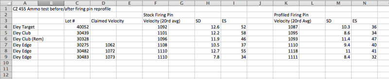 I did a before/after CZ firing pin re-profile test early last year and posted the results on the old Scout site. I don't think the post made it over (at least I can't find it) so I'll re-post the results here. Velocity measurements were done with a Magnetospeed V3 and the temps were in the 70s, if I remember correctly. Sample size was 20 round of each lot, before and after. The result was about a 10-15% improvement in ES/SD: