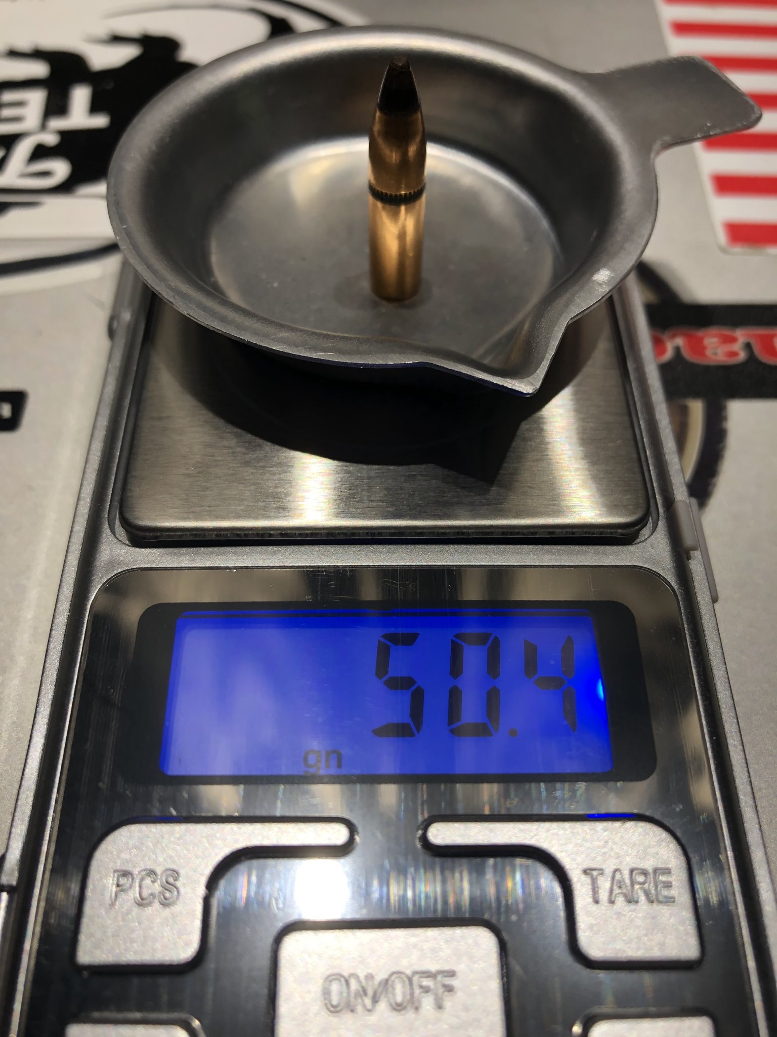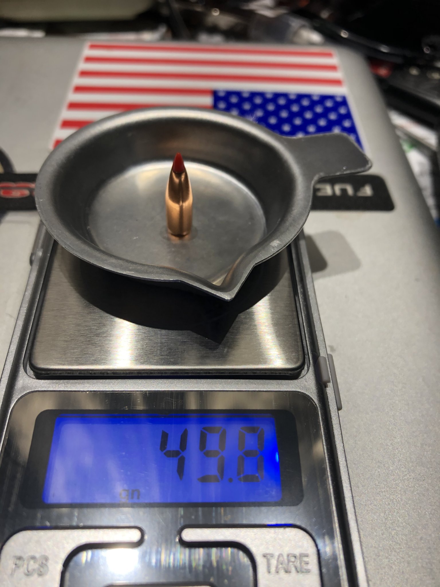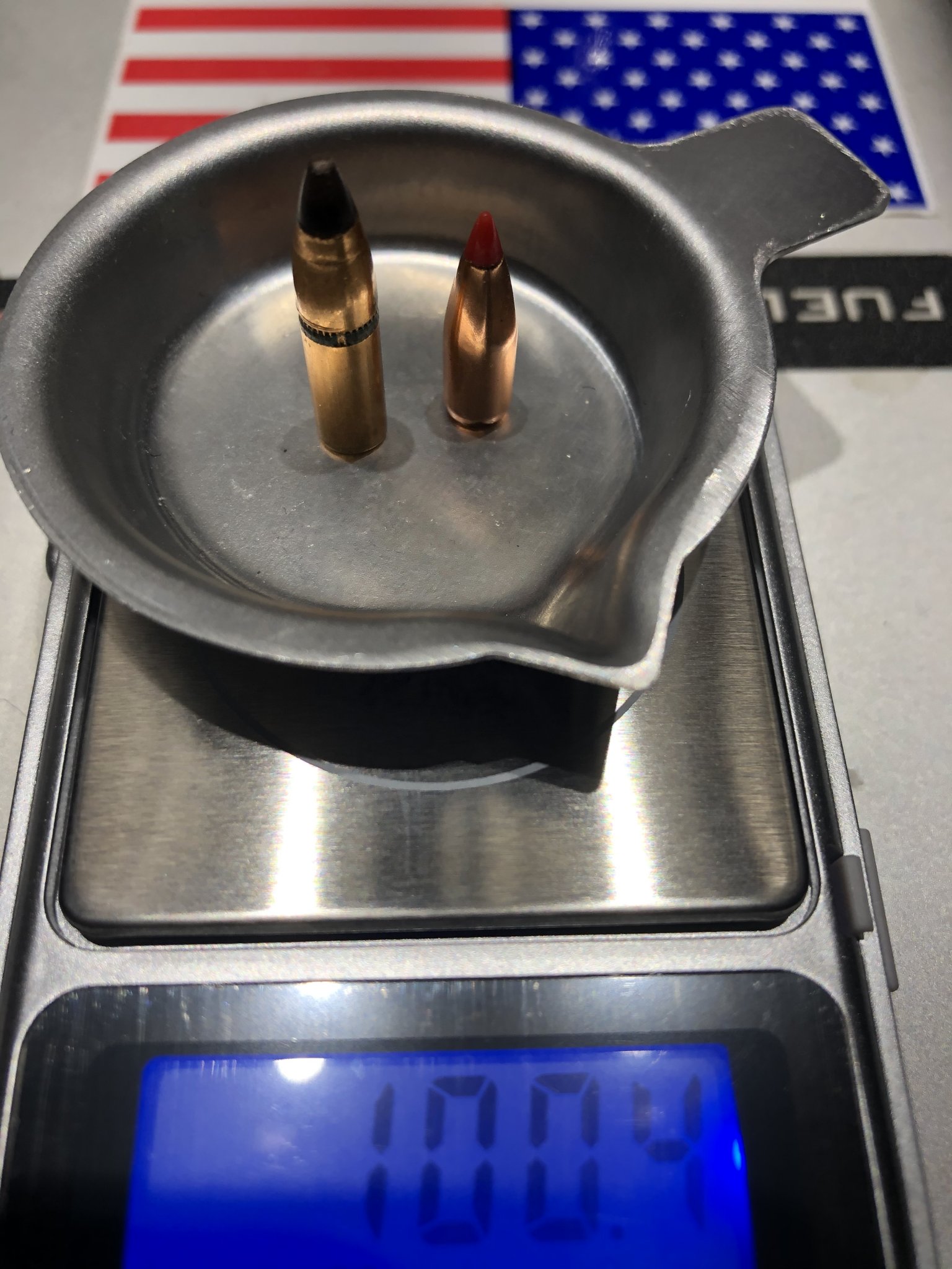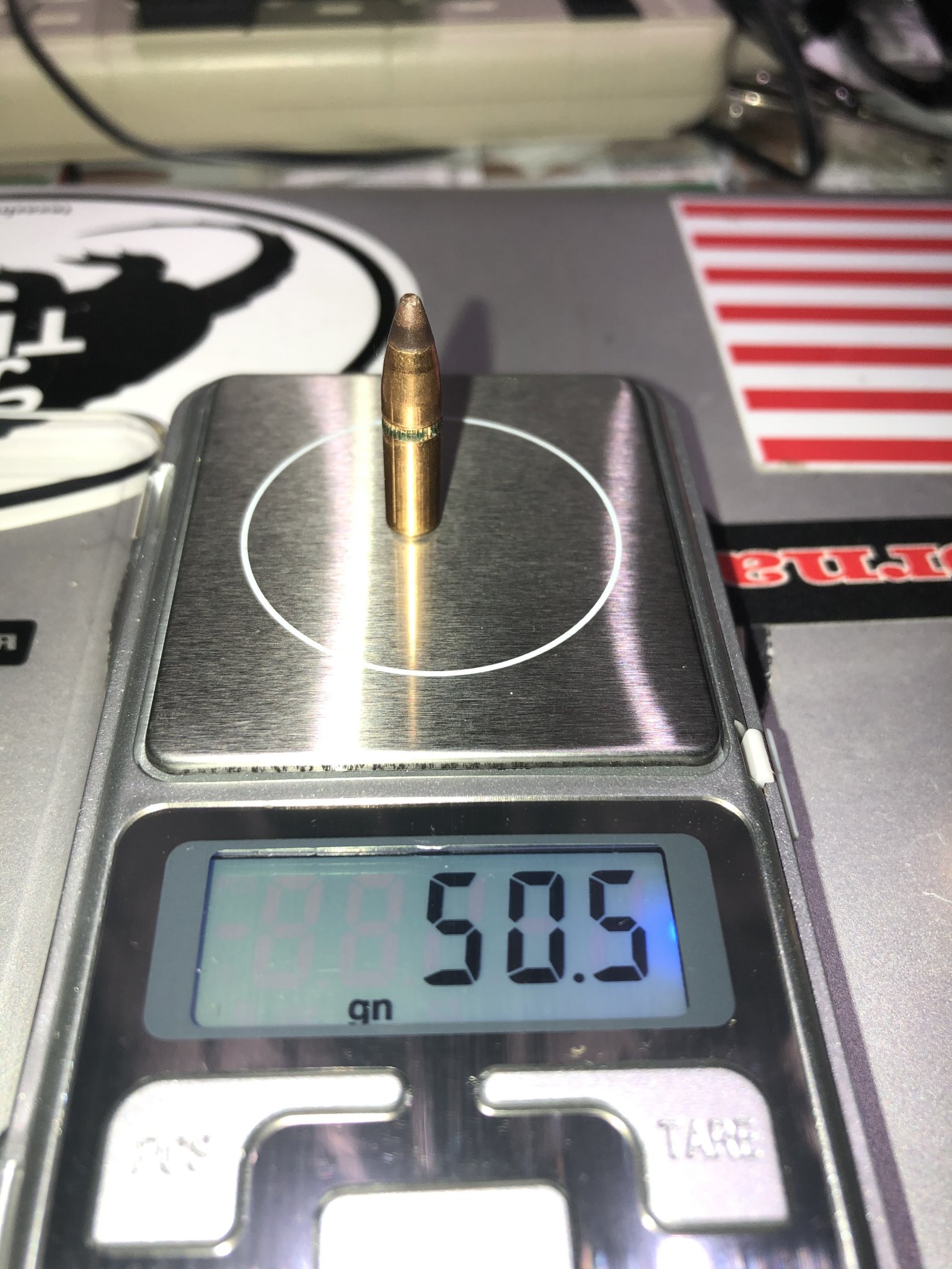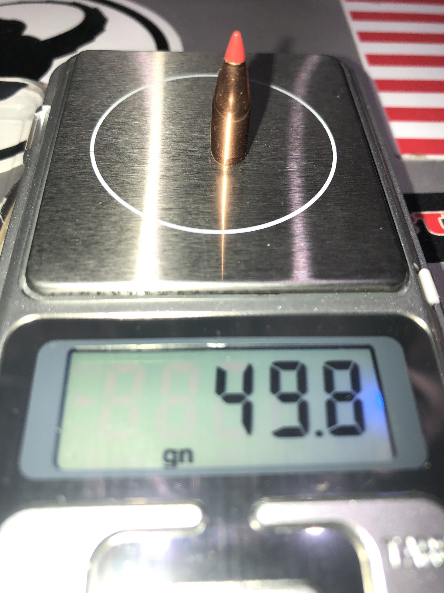 Nominally .224, hornady 50 VN v-max. Factory box (shorter projectile) vs pulled V-max 50 gr, with cannelure.