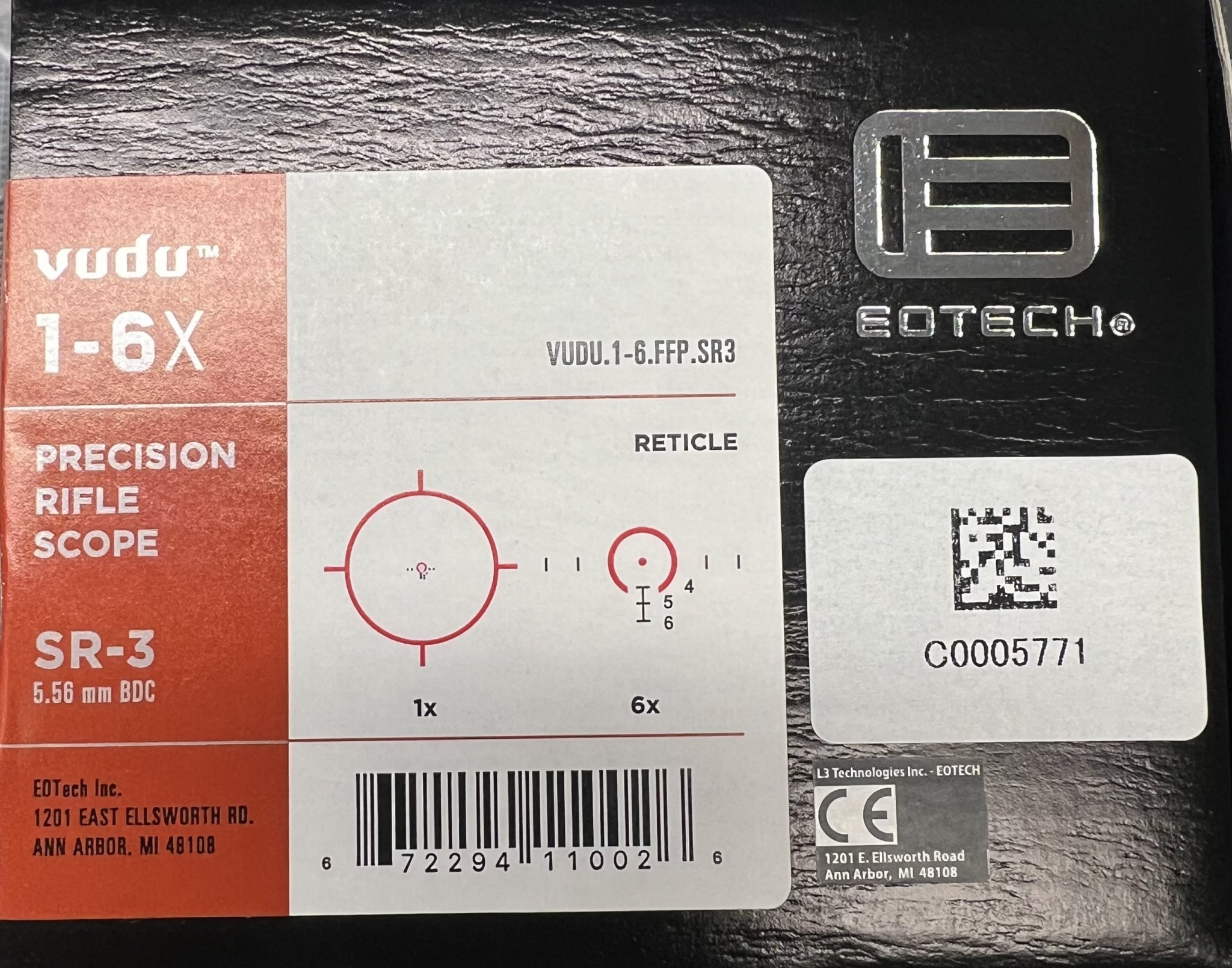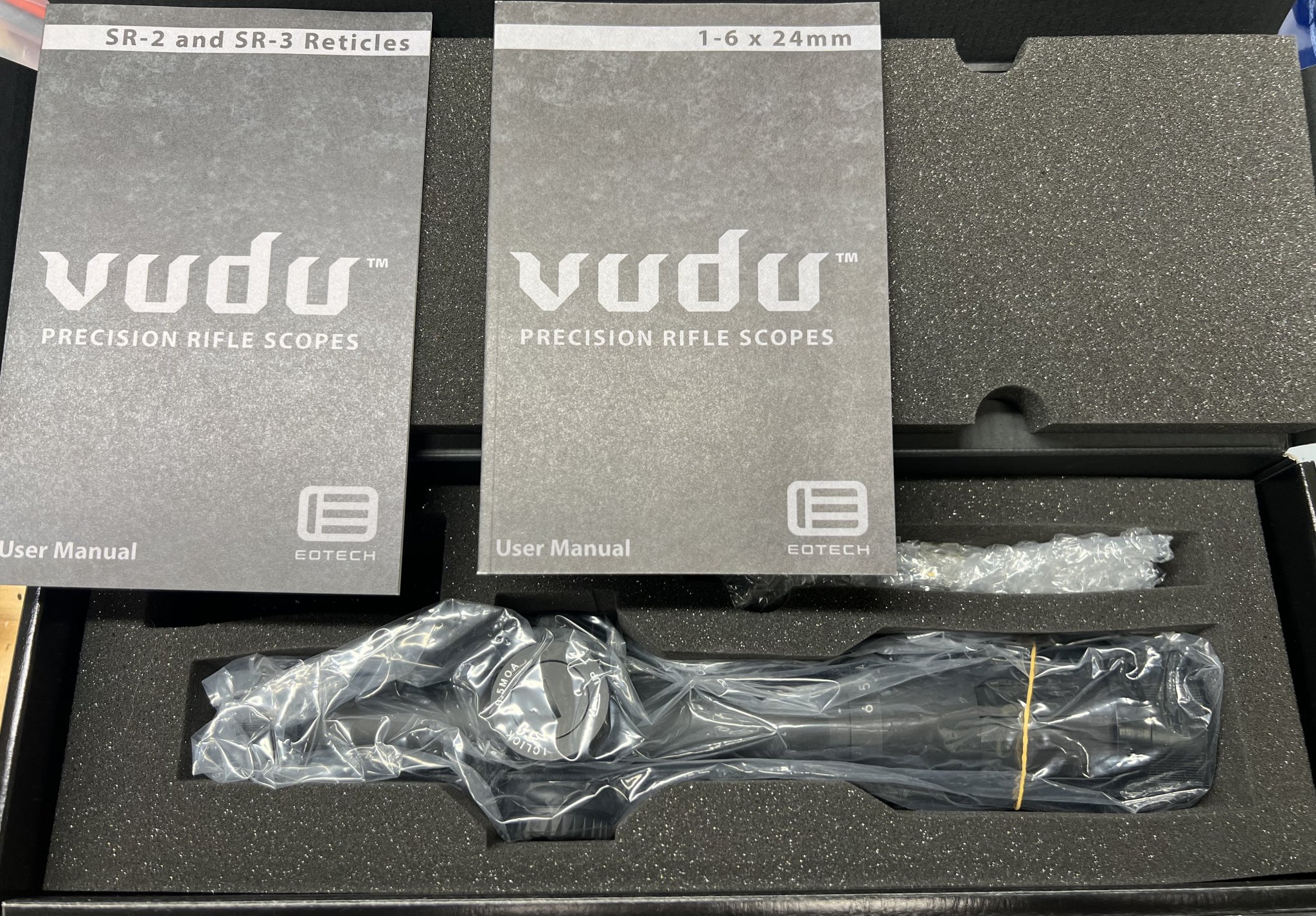 New condition Eotech VUDU 1-6. This a FFP scope with the SR3 MOA reticle optimized for a 5.56. Tube diameter is 30mm and has the throw lever.