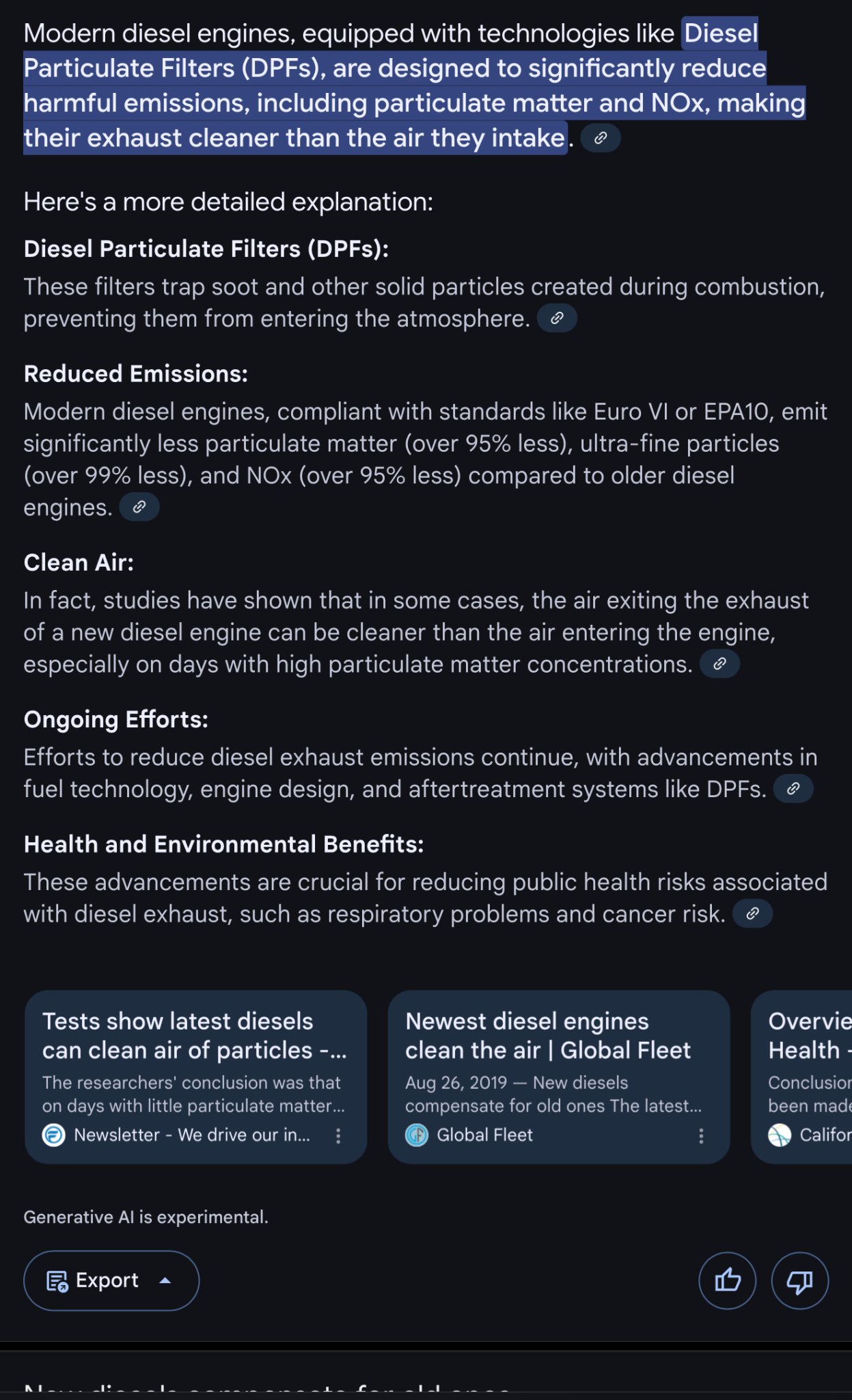 You're just spitting out what AI generated for you.... and what you're really referring to is only a level of particulate matter that gets trapped by a filter and then burned off in a regenerative process ... It doesn't really leave the air cleaner. The latest emissions are geared toward a further reduction on NOx. 10x reduction from just years prior, but still doesn't eliminate emissions