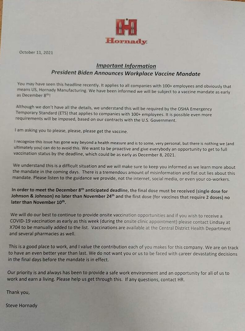 Now, everyone I know that read it said, "What the fuck is this?" myself included. I don't know anyone that thought it was a good idea besides Steve H, who I presume wrote it in an excelptionally bad mood after hearing about what OSHA was going to do. The majority of my coworkers are not vaccinated. Everyone has their own line in the sand and thankfully the Supreme Court cut the bullshit down before it was anymore serious of an issue. Frankly, most of us think the letter didn't need to go out, and it should have been reviewed before it did, but I believe this one came straight from the top. People make mistakes, but believe me, we all remember this one.