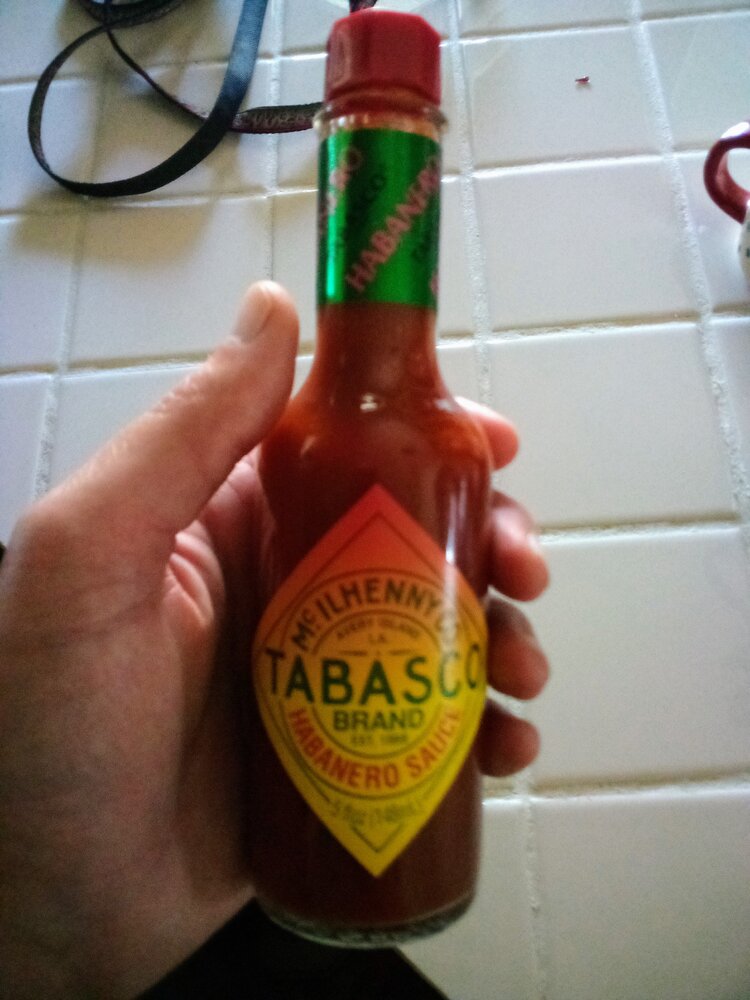 You need something to kill the taste of those powdered eggs.I never heard of Tabasco on eggs until basic training.