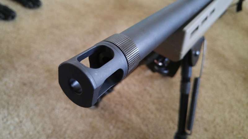 I recently purchased a Faxon single-chamber .300/7.62 "Loud Mouth" brake and figured I'd share my thoughts on it. It was purchased as a placeholder (I'm in limbo over what suppressor I want to purchase, so I knew I'd be upgrading to a fixed QD mount in the future). As such, I didn't want to drop $$$ on something I was going to swap out anyways, and the "muzzle lock" feature seemed attractive since I could (theoretically) install/remove it painlessly and use it on multiple hosts with hassle-free timing. Basically, it was pretty inexpensive and I thought it would be better than just running thread protectors on my bolt guns, given Faxon has a reputation of producing some pretty good stuff. The finish / surface treatment seems well done and it looked right at home on my SPS barrels, both in color and size. That's about where the praise ends.