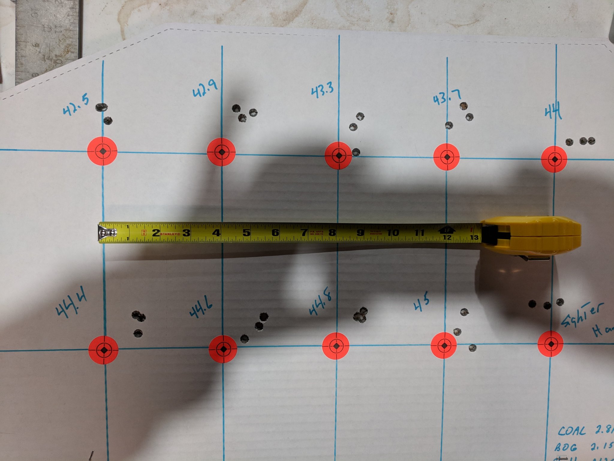 I received a reloading setup for Christmas and loaded 30 rounds with Varget and 175gr Hornady BTHP. Went out today and shot an OCW. I think I know what I am looking at forresults but would like some input on where you would start for load development and fine tuning. Worked up from 42.5 gr to 45gr. My next outing I was planing on Loading 5 rounds each starting at 44.4 up to 45 grains.