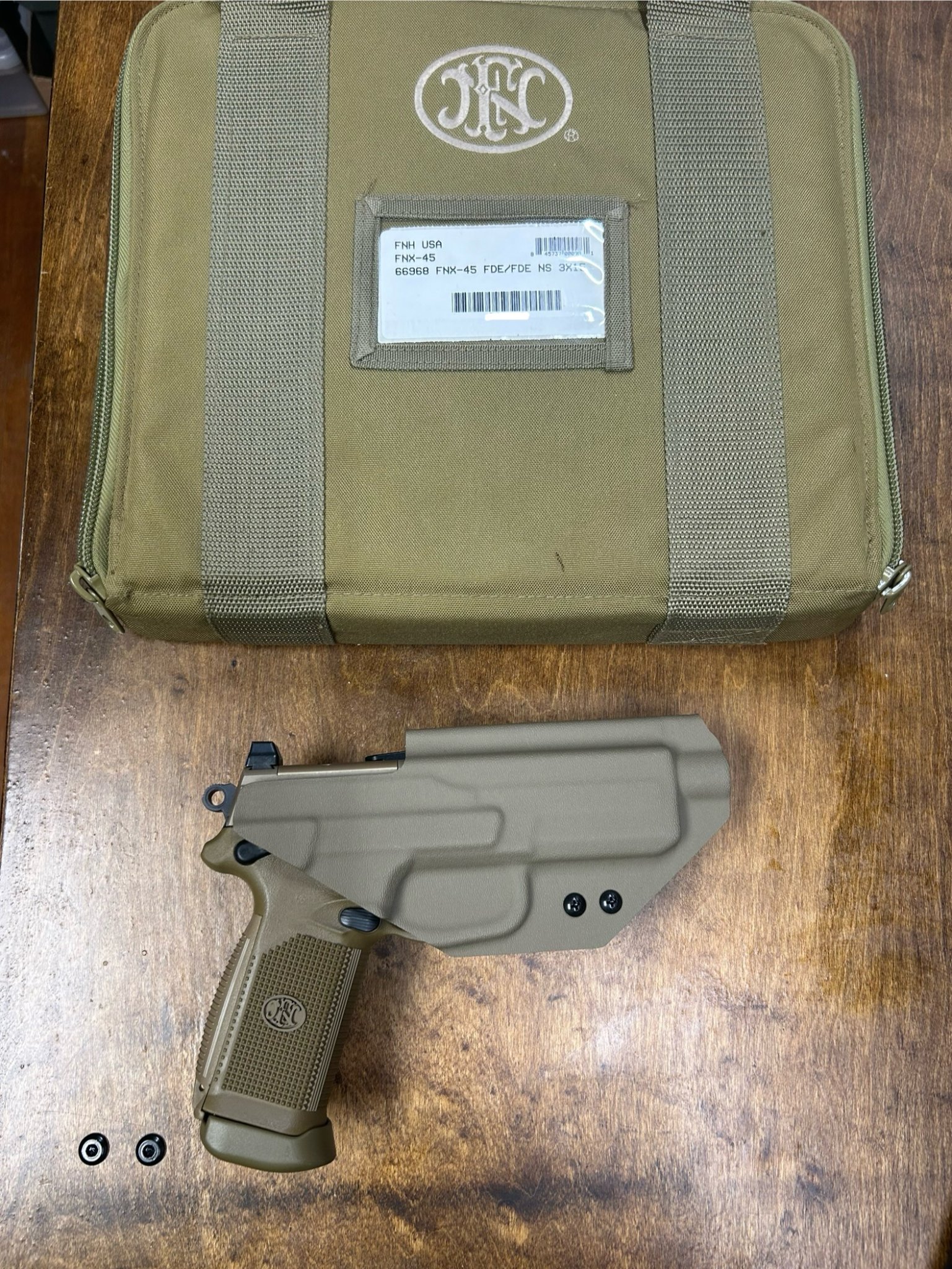 Up for grabs is a lightly used but not abused FNX45-T. Only signs of use are on the contact points of the barrel. Comes with everything it should plus an extra 15 round magazine. I will include a kydex holster that has the optic cut also. Holster is set up for Safariland type hole pattern. Gun was never carried so no holster wear on it. $975 shipped to your FFL