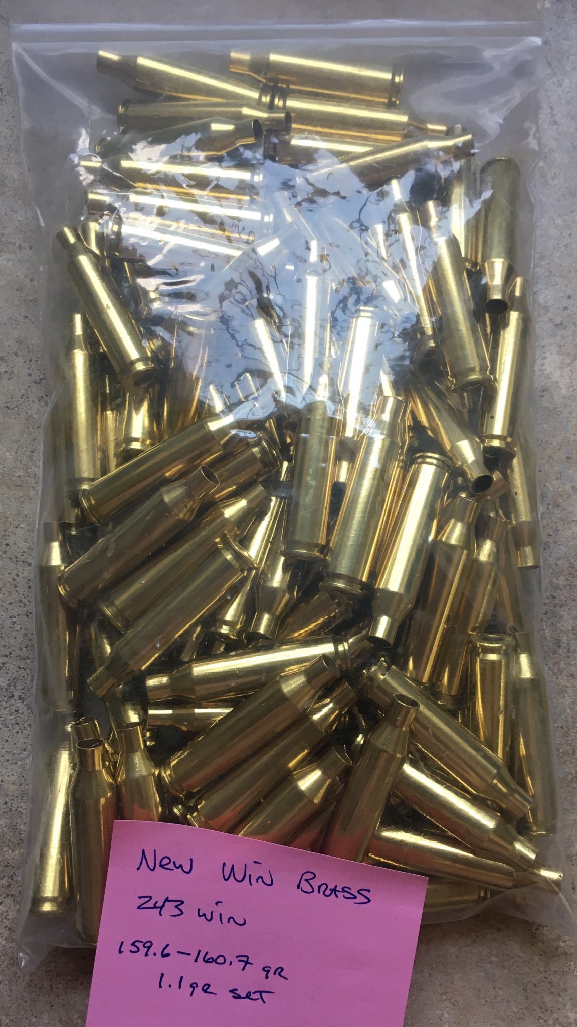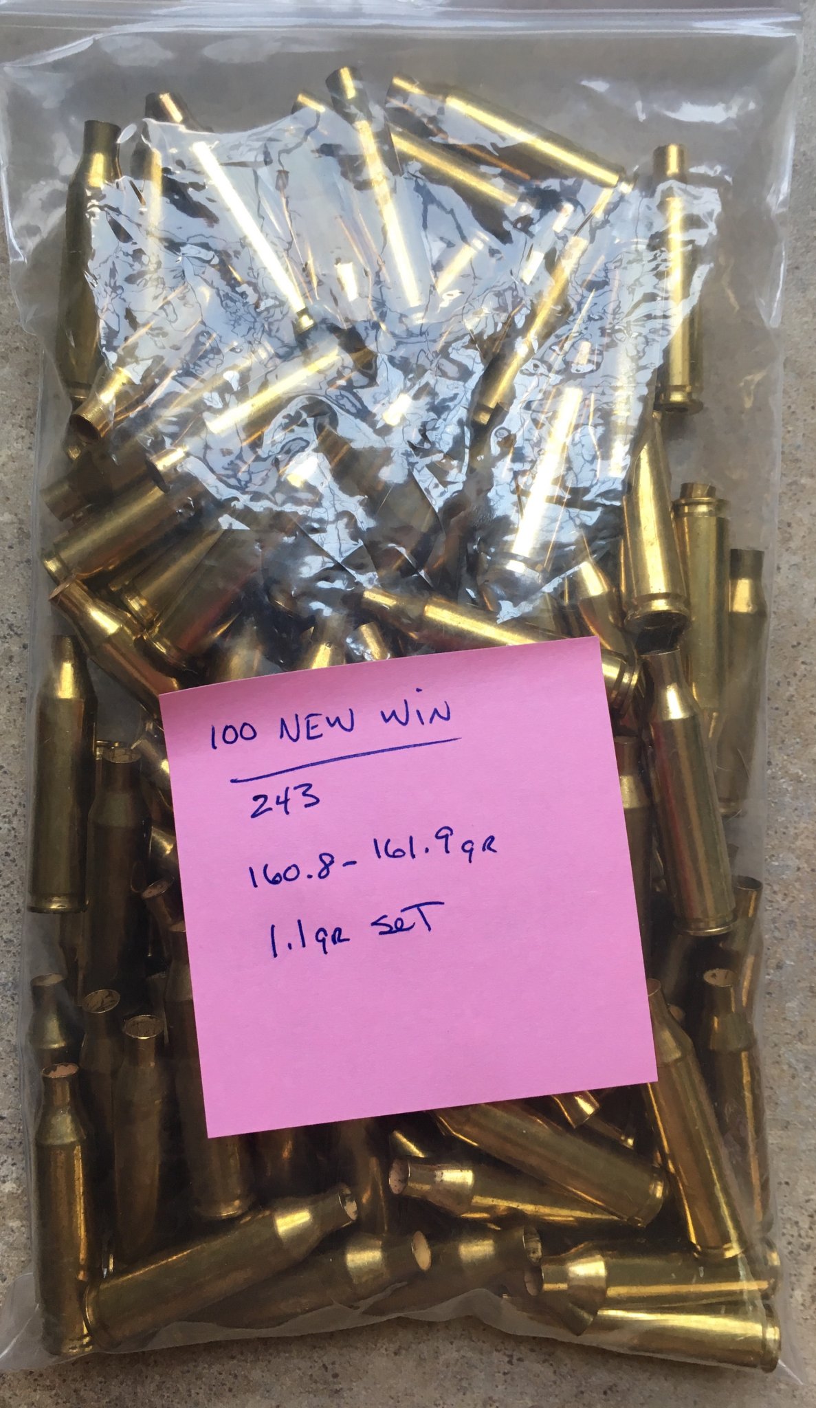 Qty 100 --- .243 Win --- New Win cases - Weight Sorted Set: 159.6 to 160.7 (1.1 gr set) --- $35.00 --> SOLD & SHIPPED blairmckenzie1