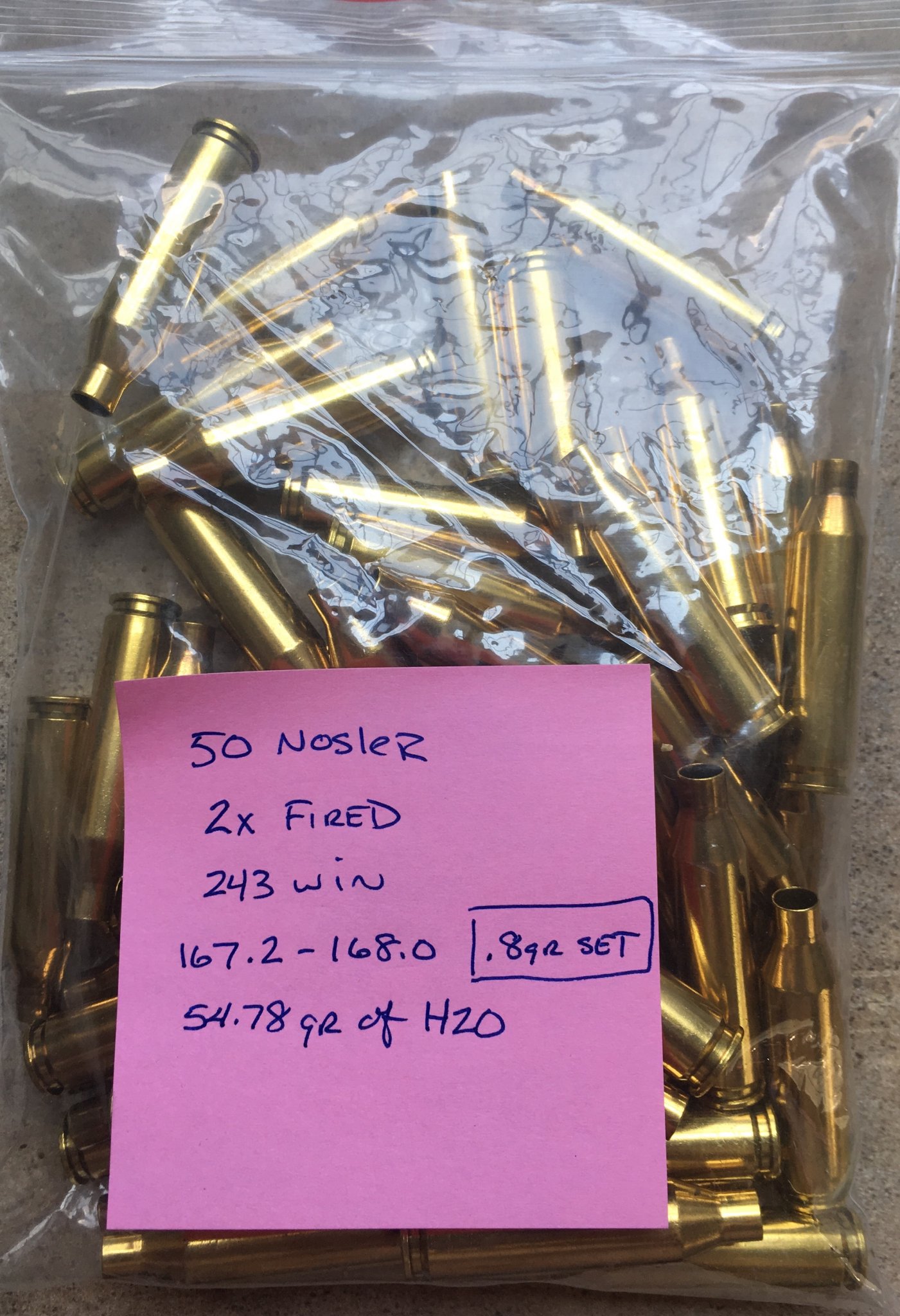 Qty 50 --- .243 Win --- Nosler 2X Fired cases - Weight Sorted Set: 167.2 to 168.0 (.8 gr set) (54.78 gr of H2O capacity) --- $34.00