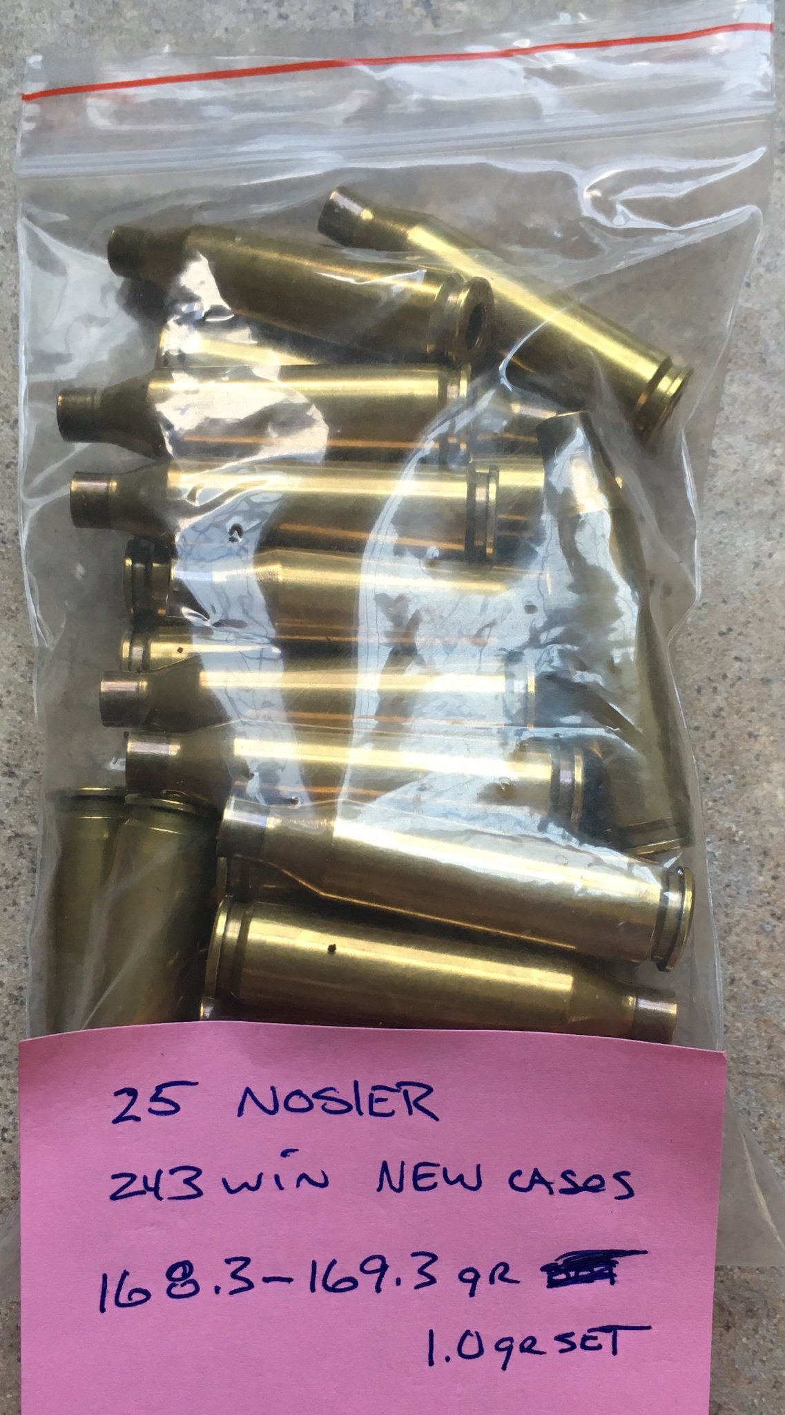 Qty 25 --- .243 Win --- New Nosler cases - Weight Sorted Set: 168.3 to 169.3 (1 gr set) --- $17.00