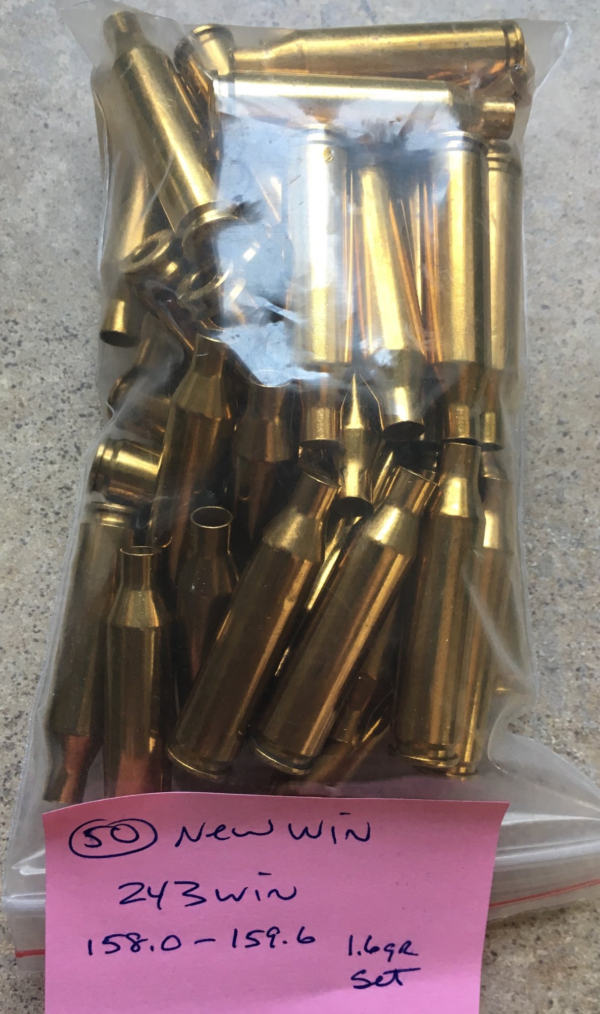 Qty 50 --- .243 Win --- New Win cases - Weight Sorted Set: 158.0 to 159.6 (1.6 gr set) --- $17.50 --> SOLD & SHIPPED blairmckenzie1