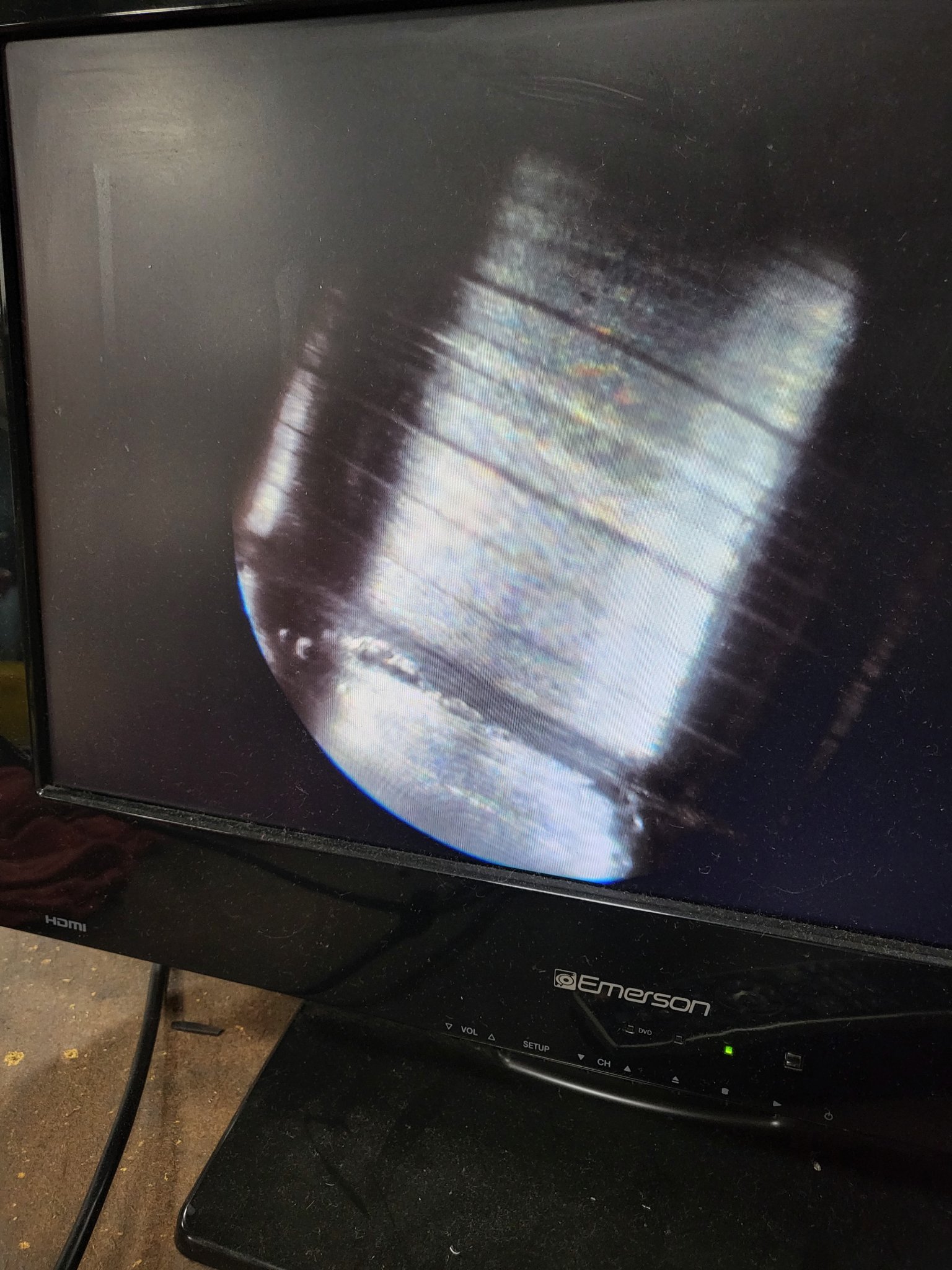 What I did get was the shooter was using ThorroClean. This is a cleaner made and mixed with Iosso Bore Paste! So sum it up how ever you want.... it's an abrasive cleaner. The lands and bore are completely damaged. The lands are all rounded over, damage to the muzzles crown as well as polished and rounded over. In the first 2" of the barrel from the chamber a brush with the cleaner was run either by hand or with a drill on it. You can see the drag marks going over the tops of the lands and down in the grooves. This isn't from when the barrel got made. My guess is the shooter was worried about the carbon ring build up in the throat. Also notice the gouges running down the bore on tops of the lands and grooves.