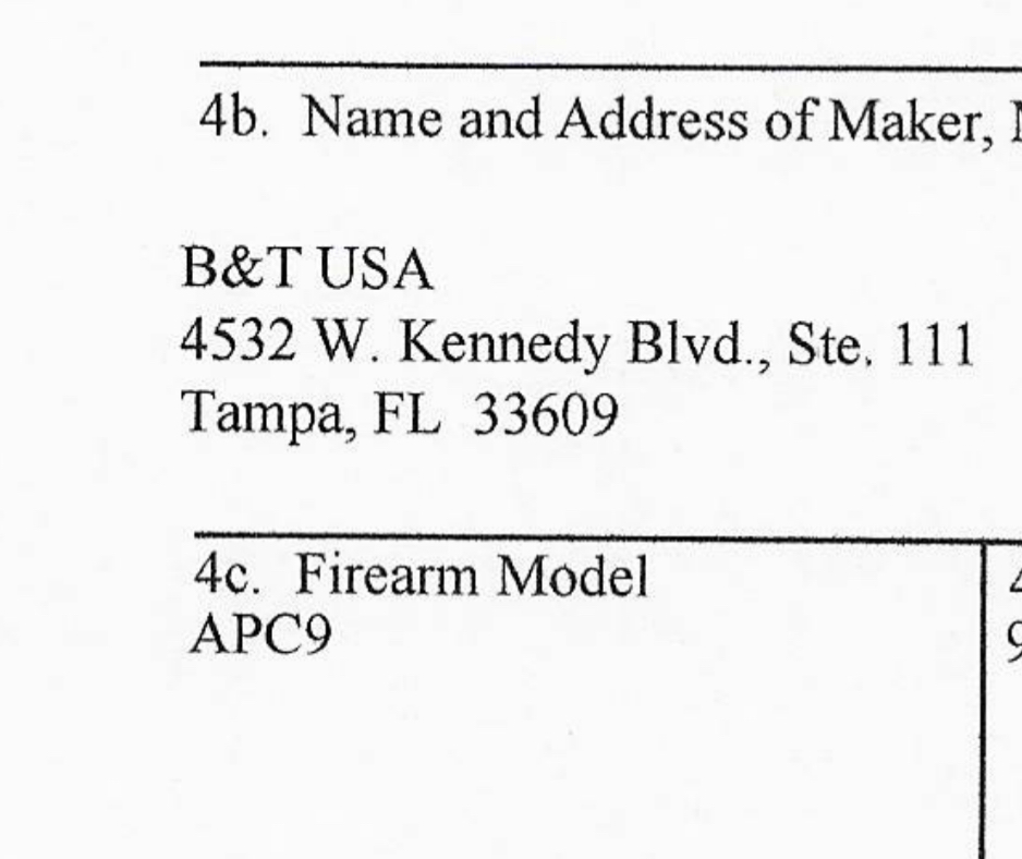 Have a form 1 question. I've done a few but they were "domestic". SBRing my B&T APC9SD and I am little confused on what was correct to put for the manufacturer. It was manufactured by B&T AG in Thun, Switzerland (laser etched on the upper which is the seralized part) but imported by B&T USA LLC which is roll marked on the barrel which is also serialized but removable so I am leaning towards Brugger and Thomet, Switzerland but maybe it should be both? I am in full on paralysis by analysis so I wanted to ask folks who have done this more than me. Not sure if I should let it ride or nuke the form and start over. Thank you for the help!