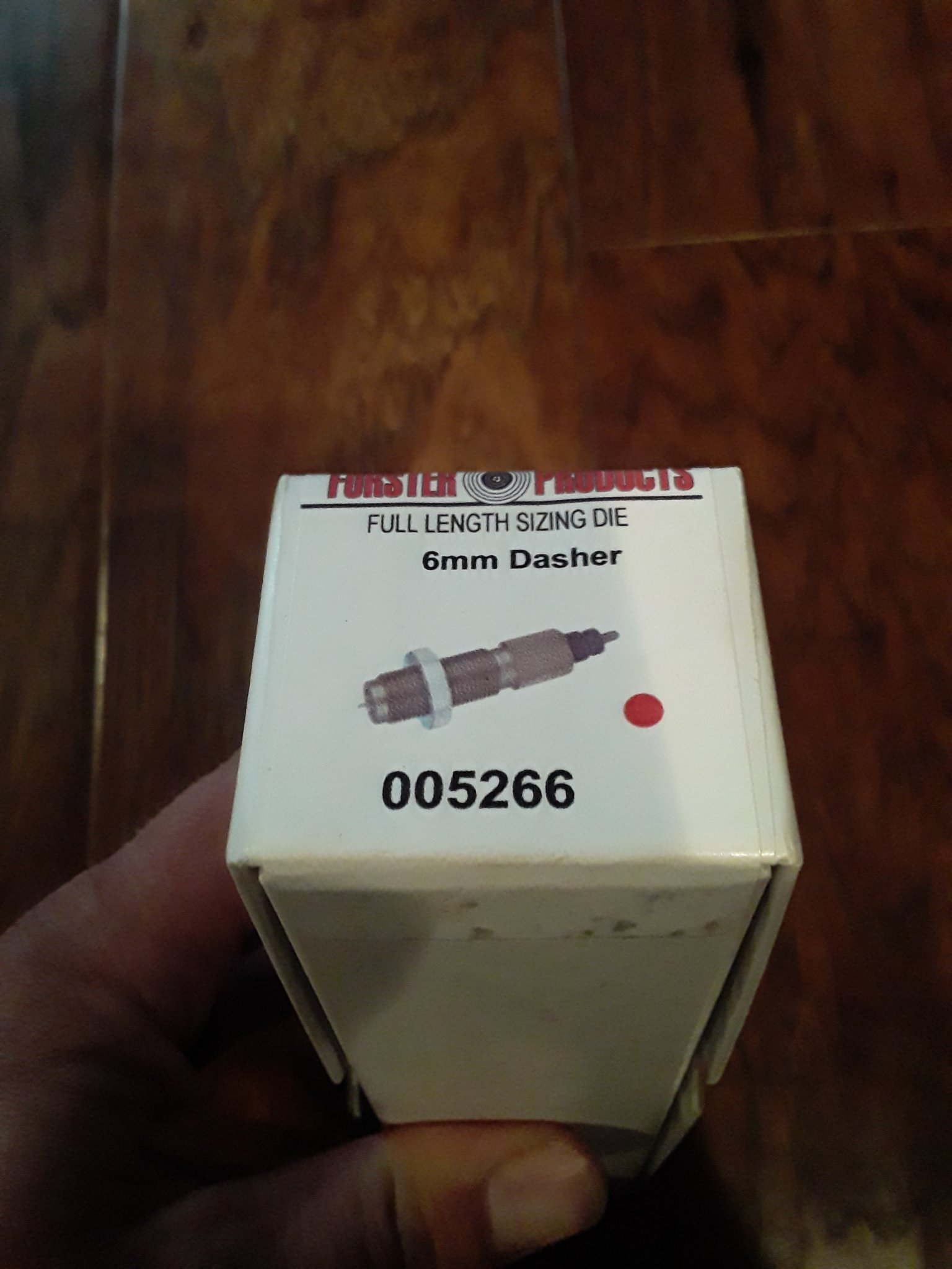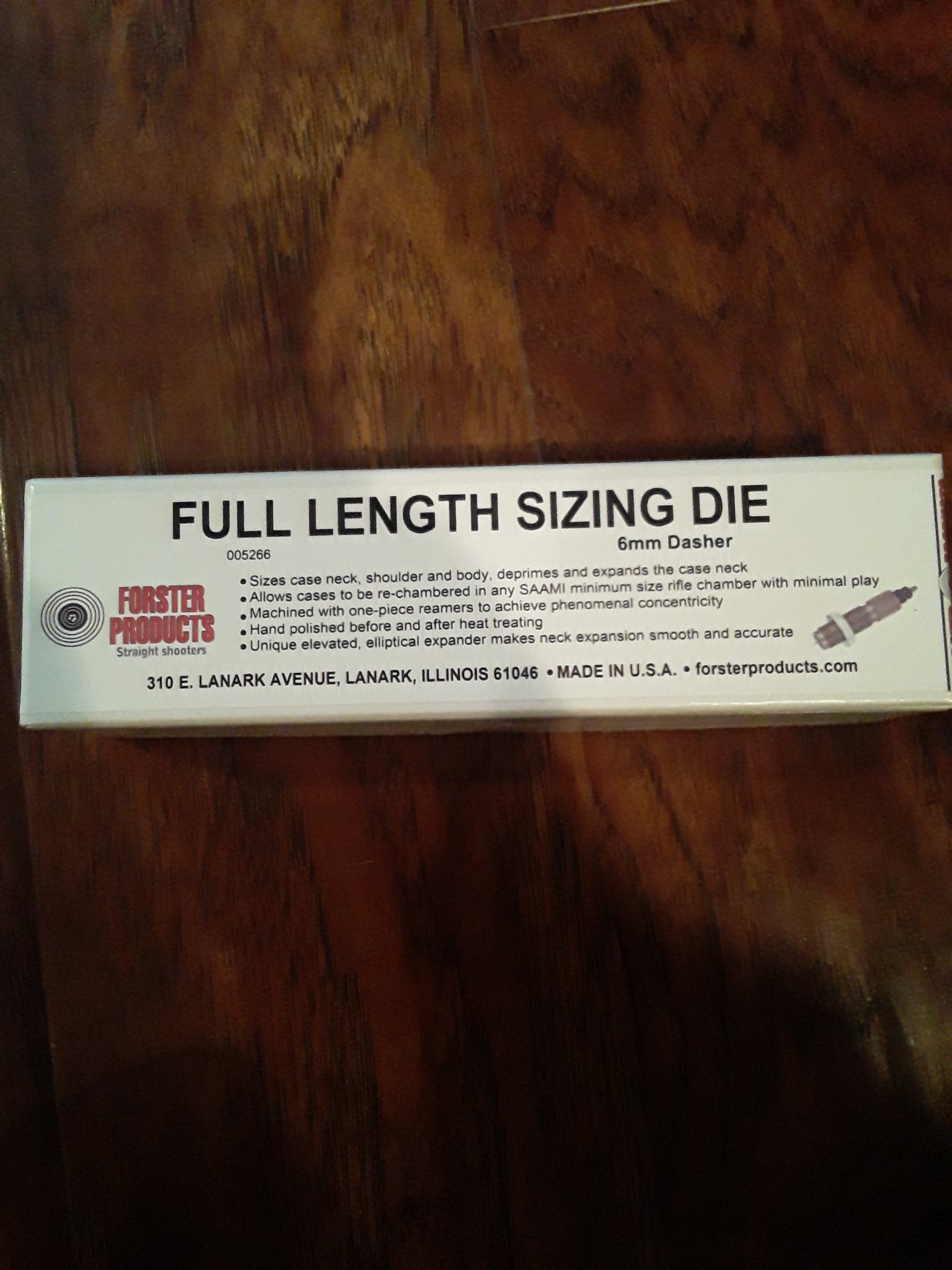 Brand new never opened forster 6 dasher sizing die. This is a non bushing full length sizing die, I backordered in awhile back and forgot to cancel it. Just want to recoup my money. $50 shipped