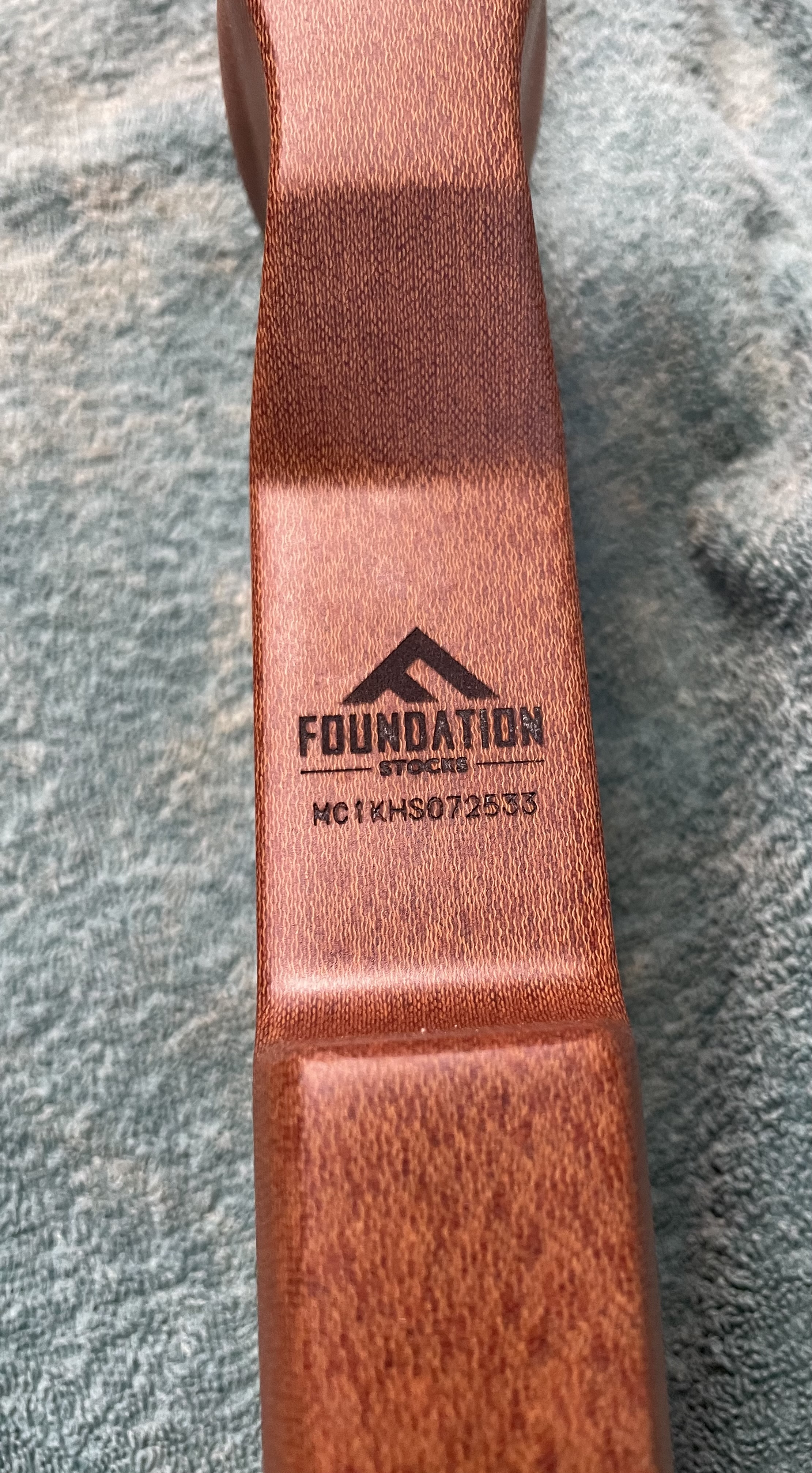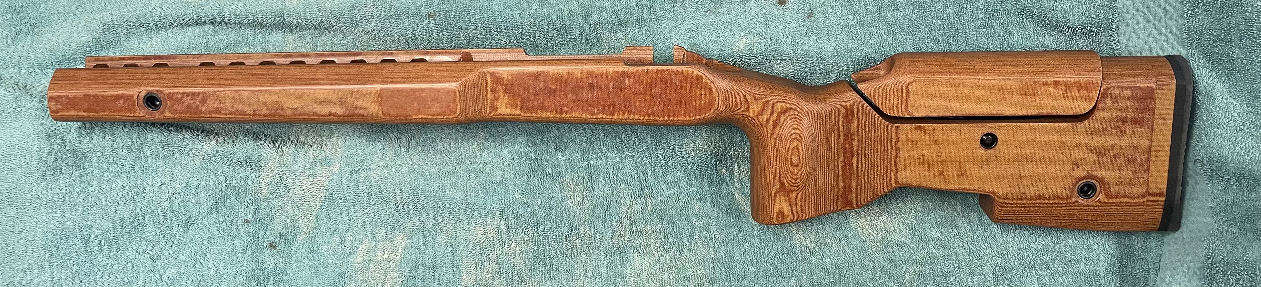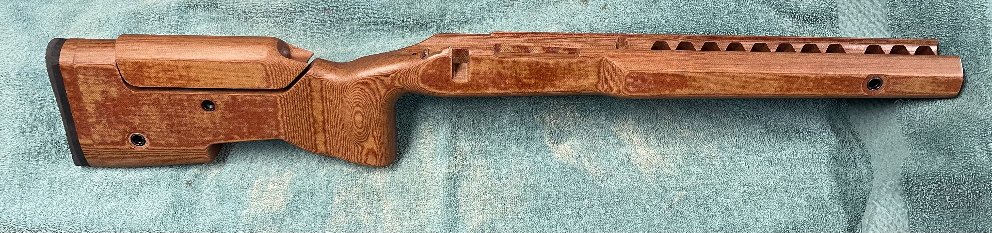 New Foundation Centurion rifle stock. Inletted for a Kelbly Atlas short action and Hawkins M5 bottom metal. Natural finish, standard weight.