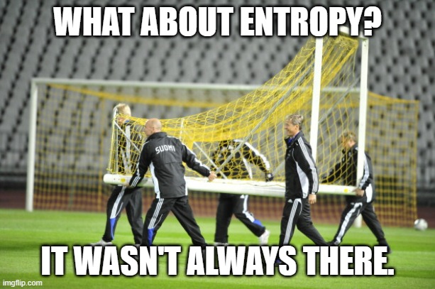 Asking another question is not proving anything. Just saying that entropy did not exist at or just before the big bang is just as much a theory as what an atheist might claim of a theology. You have not disproven God. You have not even proven big bang. My meme was to highlight that moving the goalpost is not a valid means of argument.How would you know? Or are you one of those people who believes in an imaginary man that created everything from nothing?