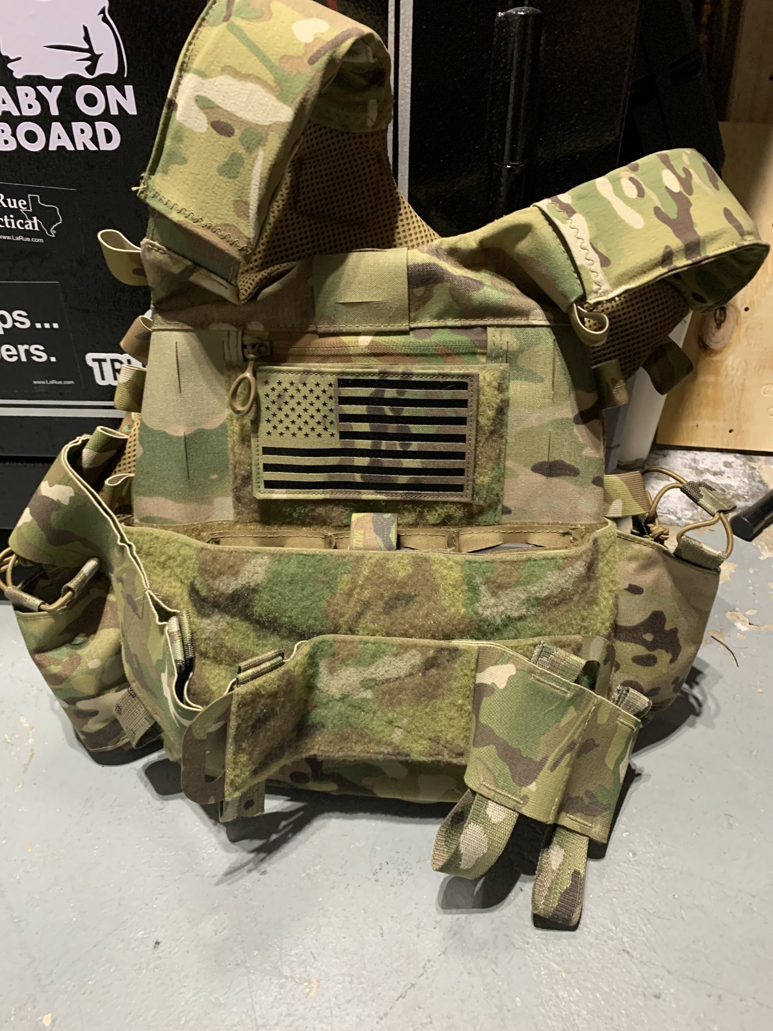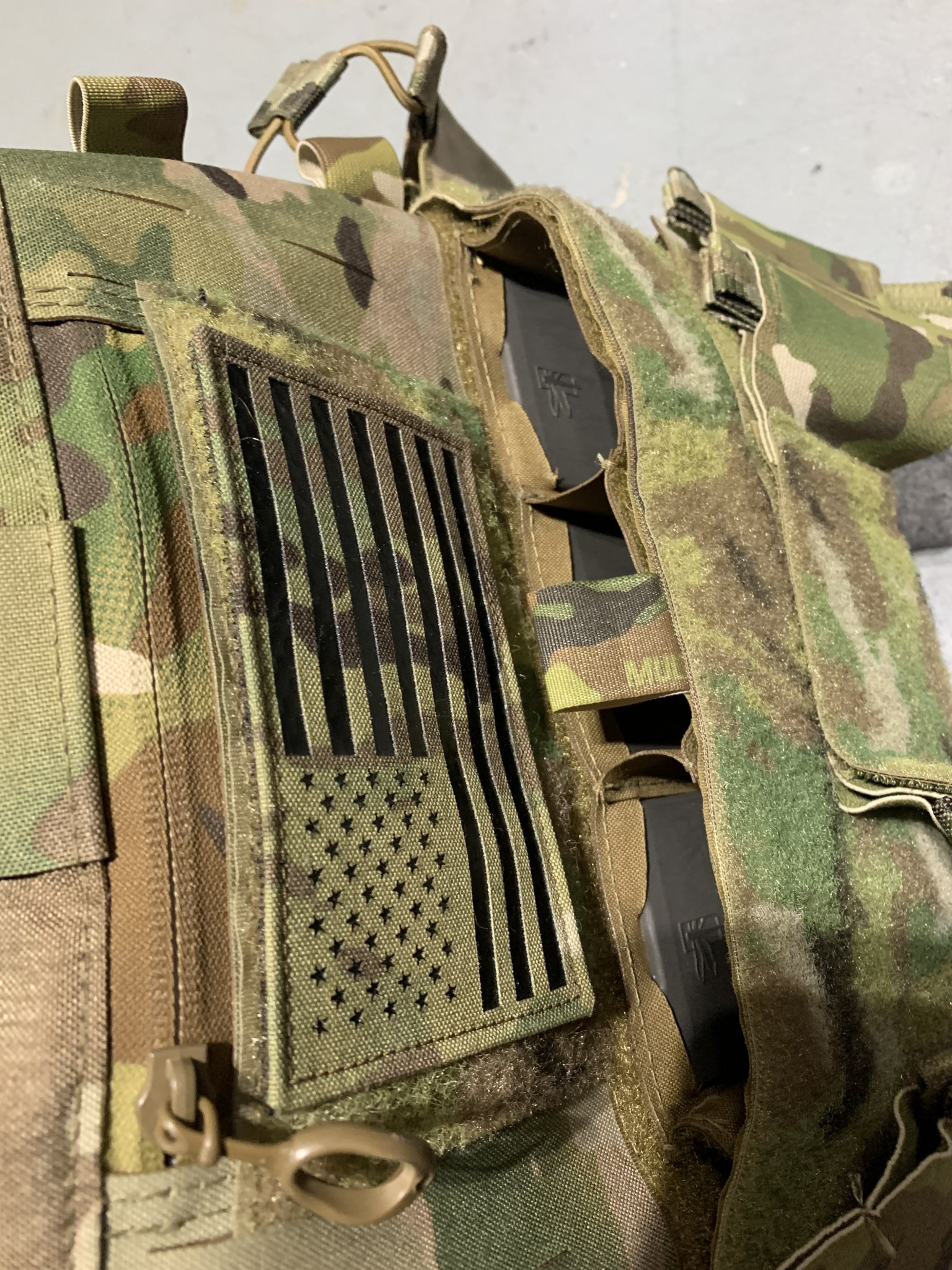 includes radio pouches on the inside(pictured) which are behind the elastic cummerbund. Flag patch included, also has Haley Strategic Partners 5.56 kydex mag inserts for the mag pouch