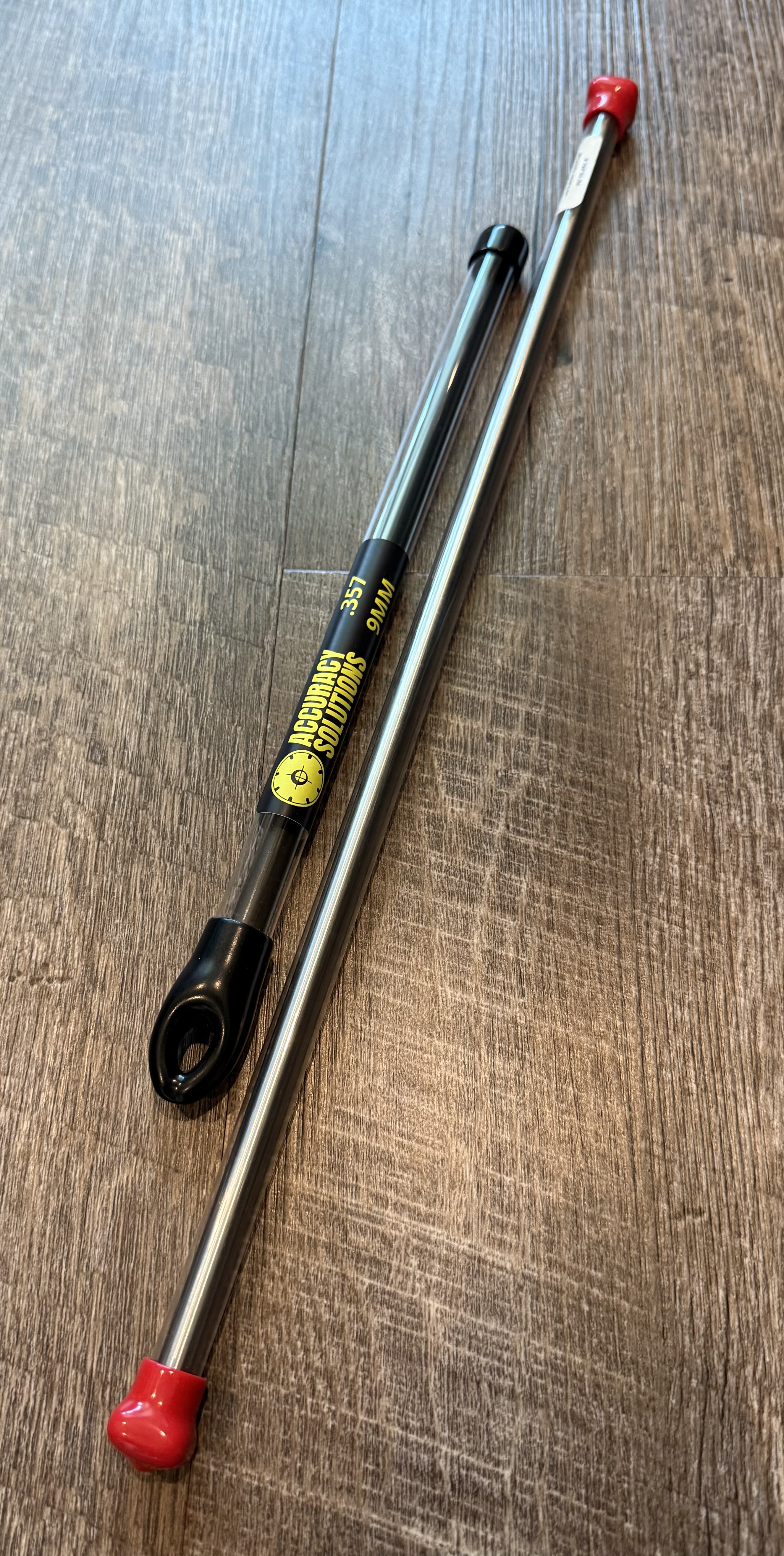 Geissele 9mm Stainless suppressor alignment rod and an Accuracy Solutions carbon fiber 9mm alignment rod.